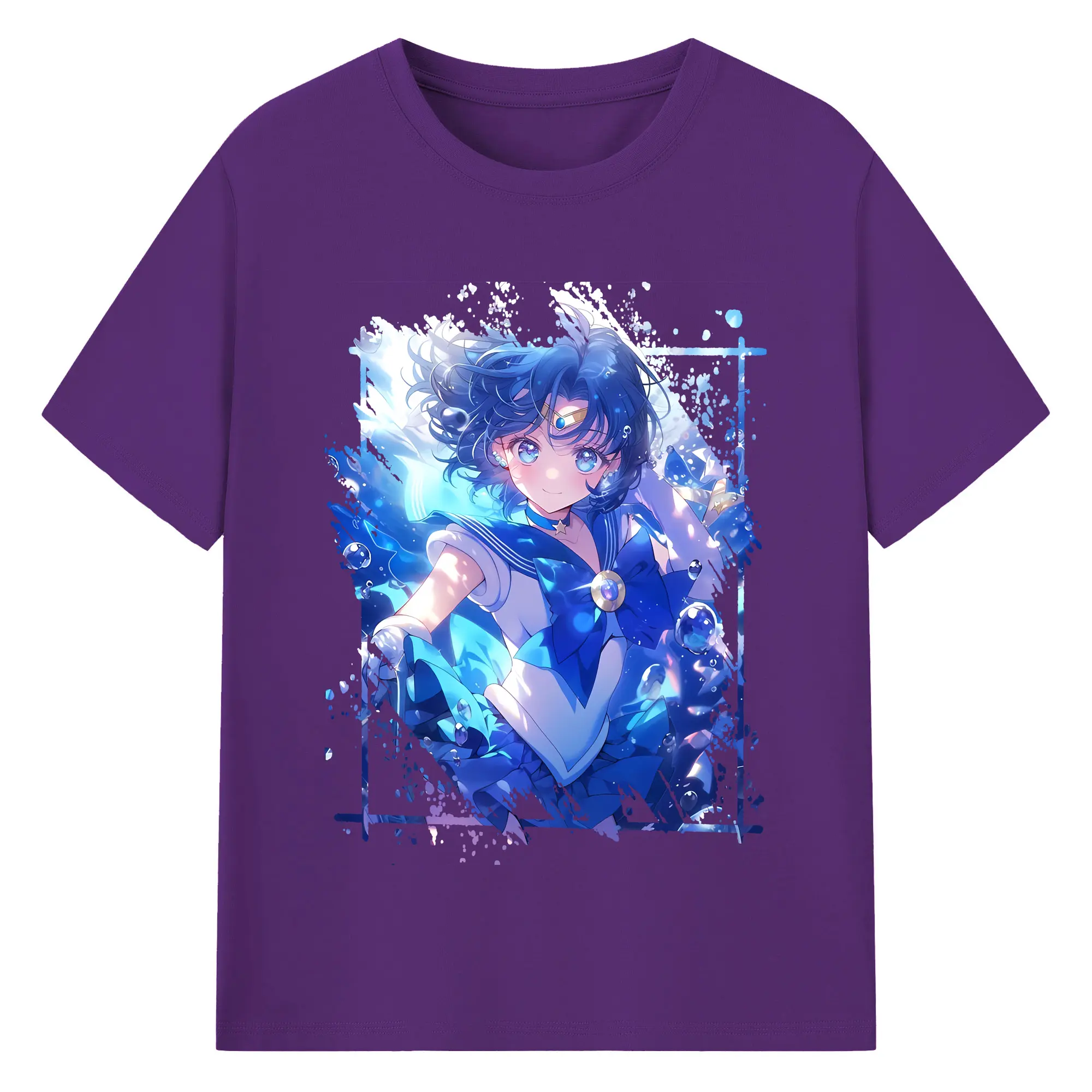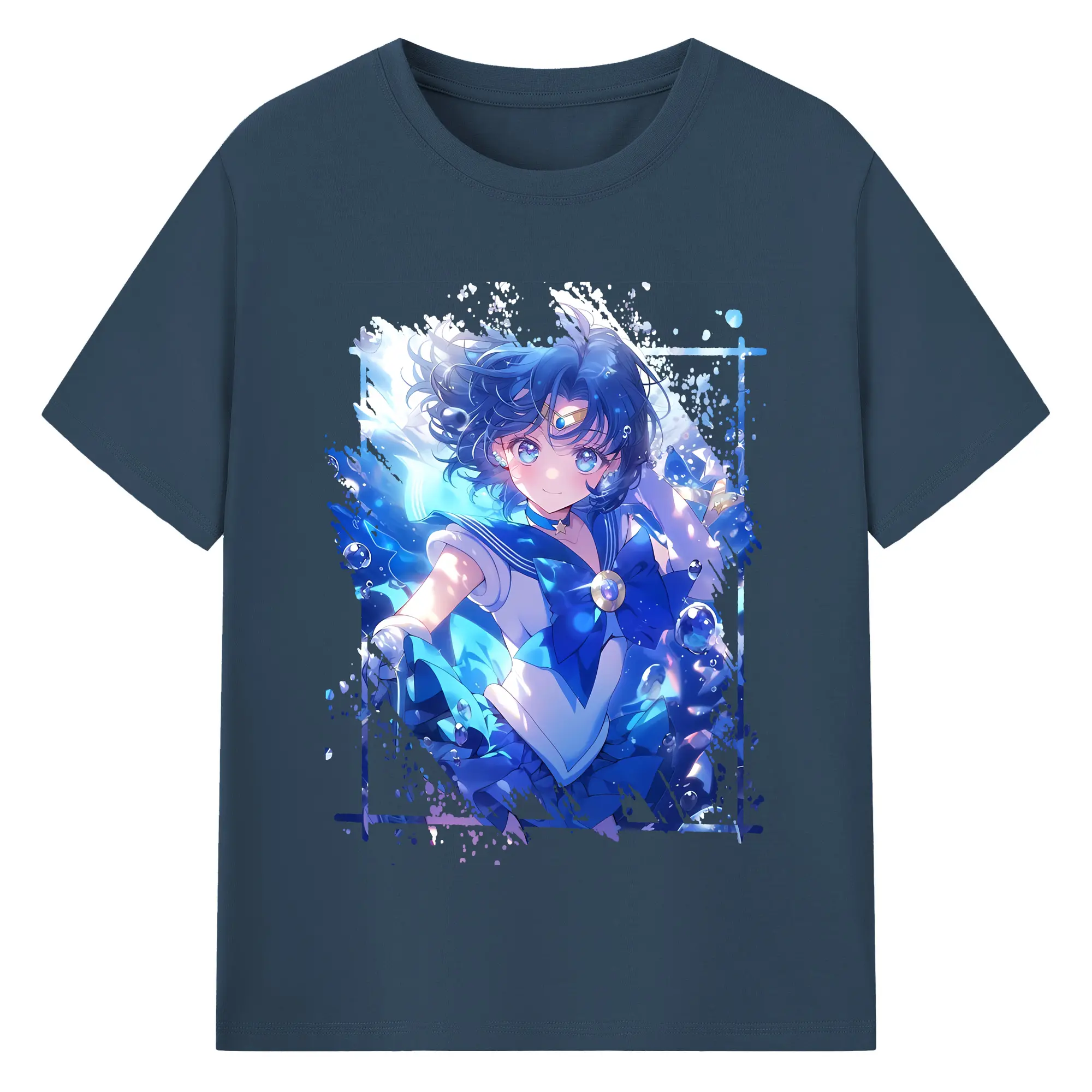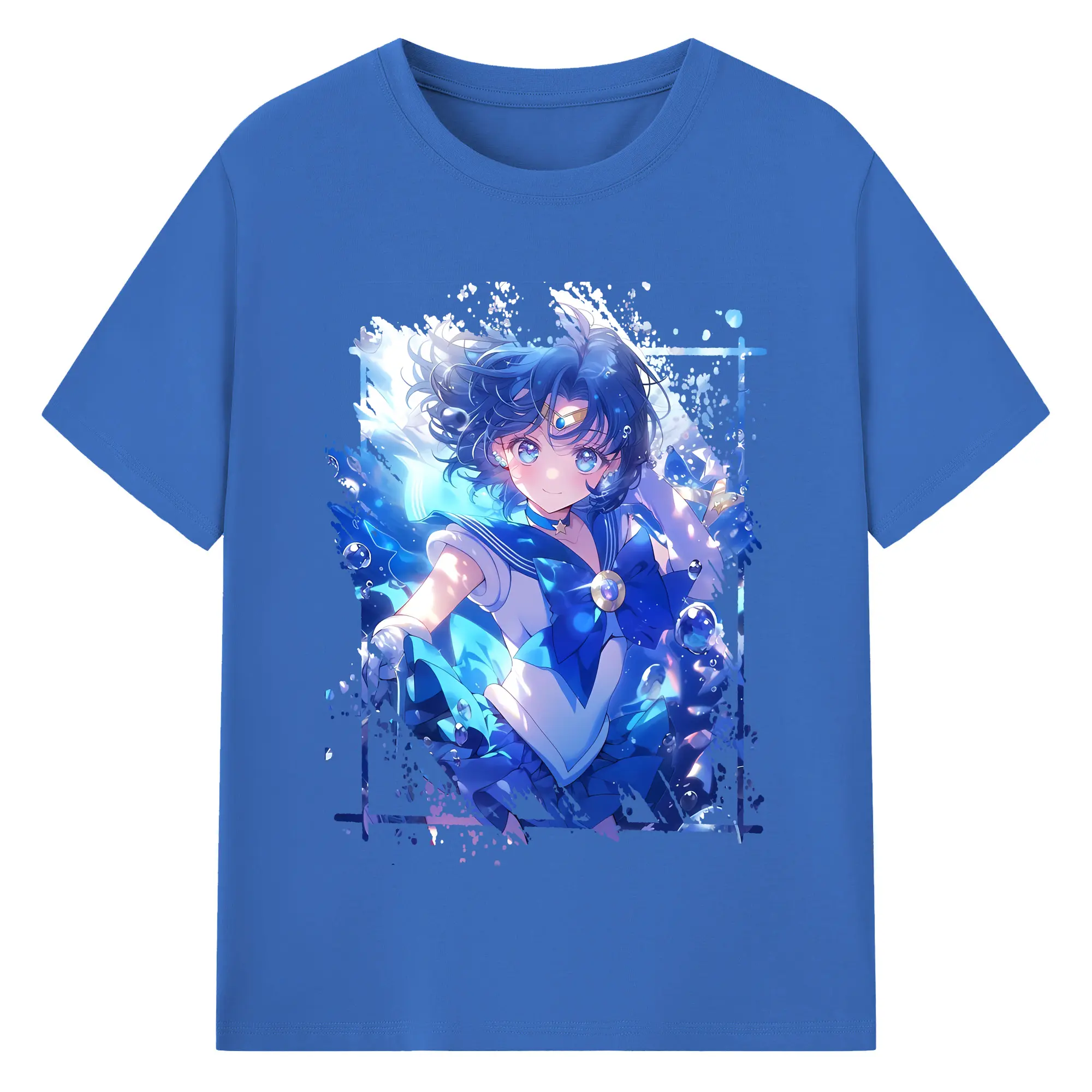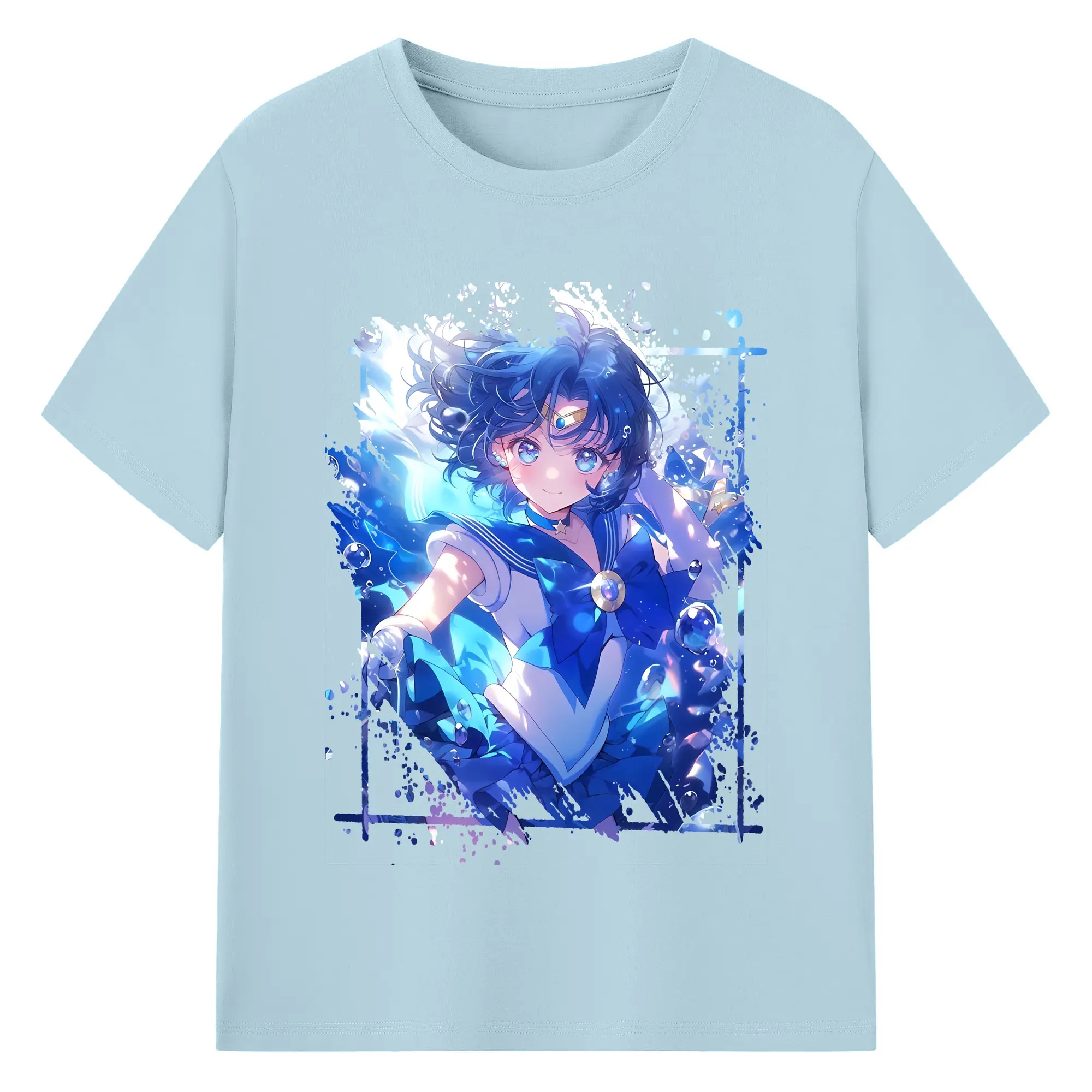 美少女戦士セーラームーン グッズ 水野 亜美 - 綿100% 半袖Tシャツ ・ フロントプリント ・ 快適 通気性 ・ 日常使い 散歩 スポーツ用