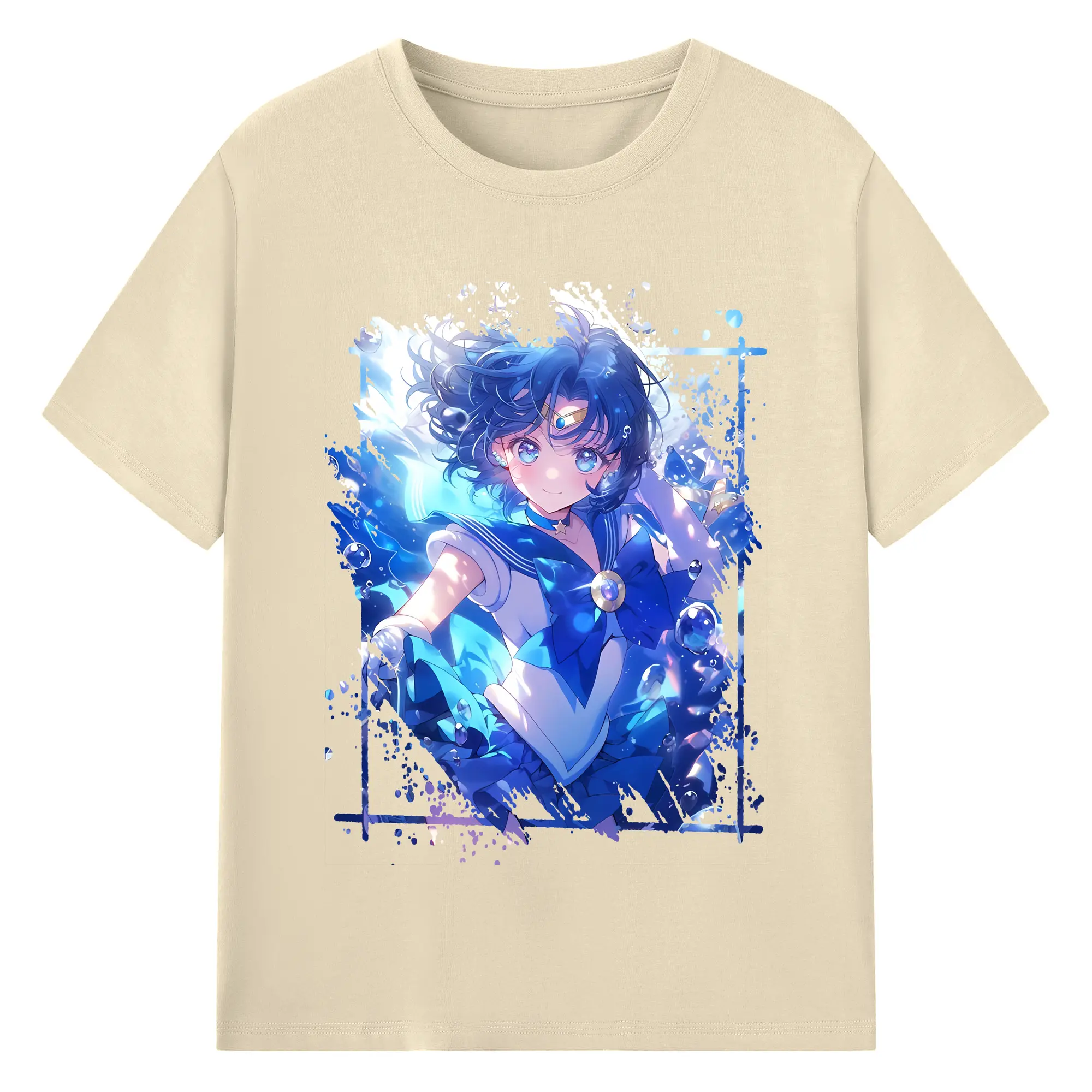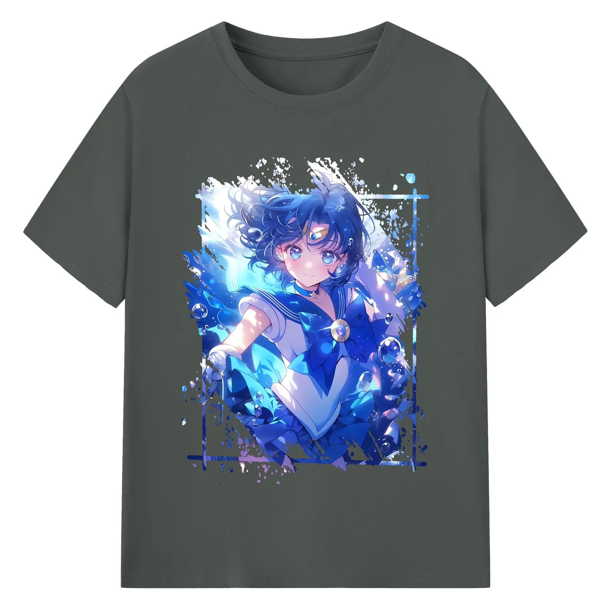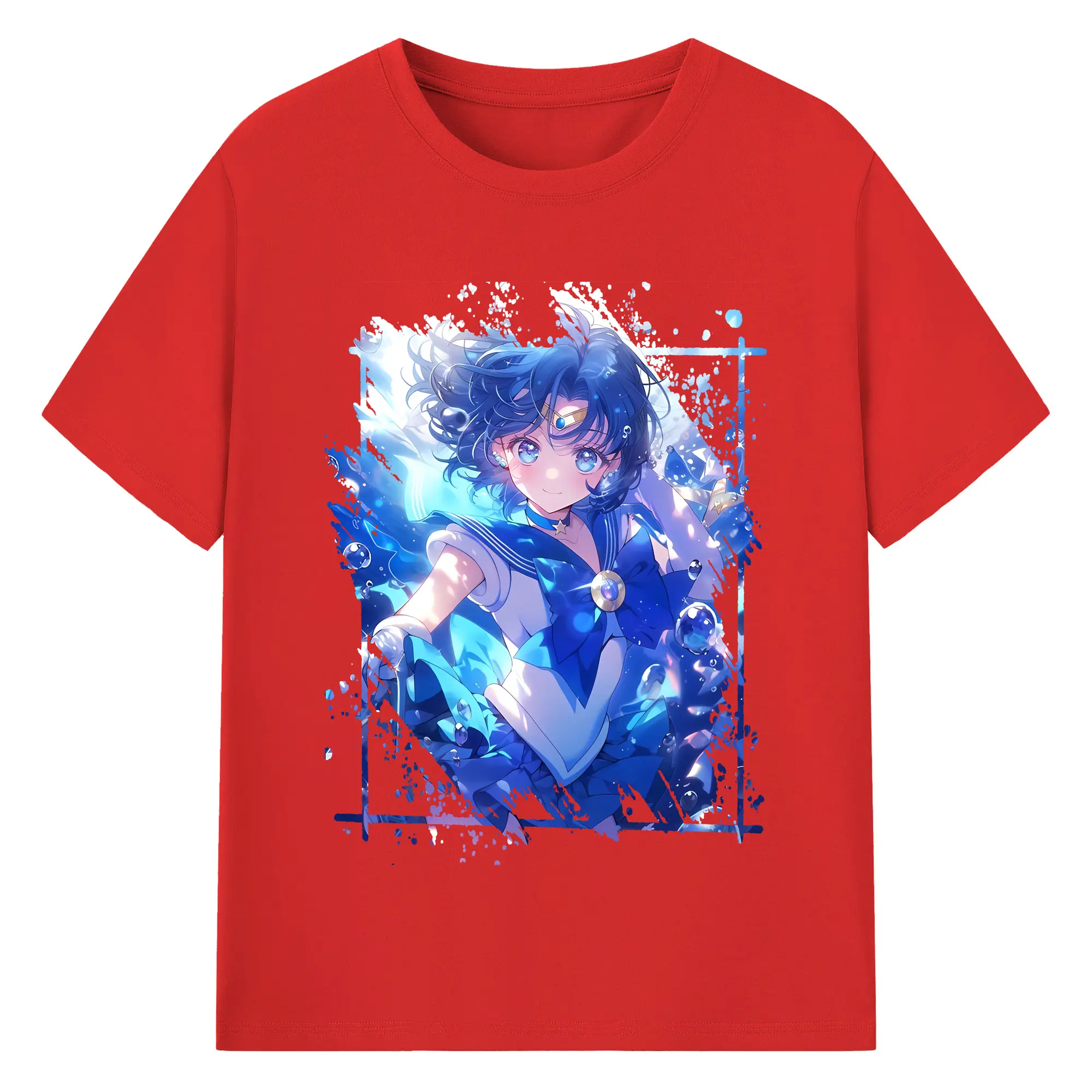 美少女戦士セーラームーン グッズ 水野 亜美 - 綿100% 半袖Tシャツ ・ フロントプリント ・ 快適 通気性 ・ 日常使い 散歩 スポーツ用
