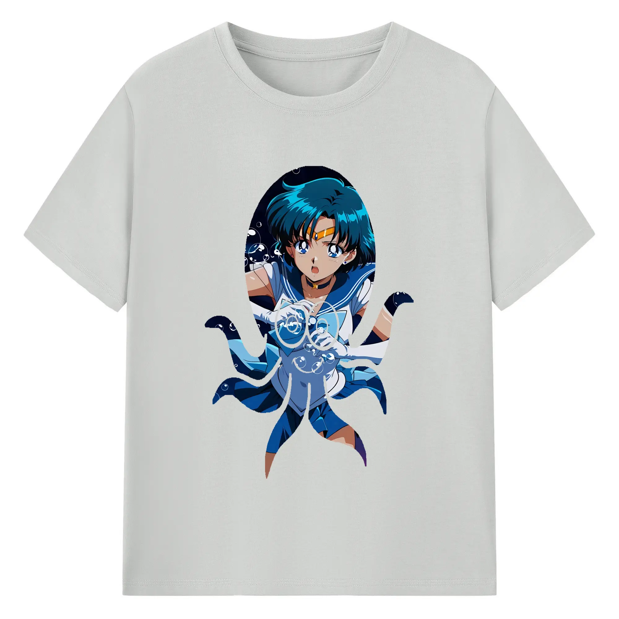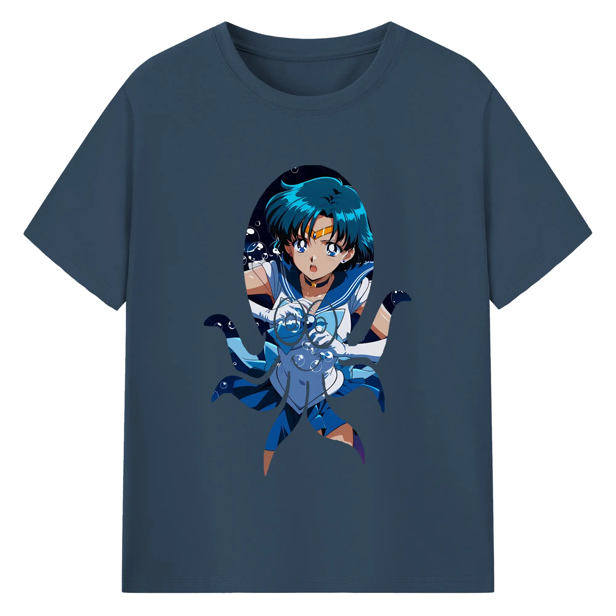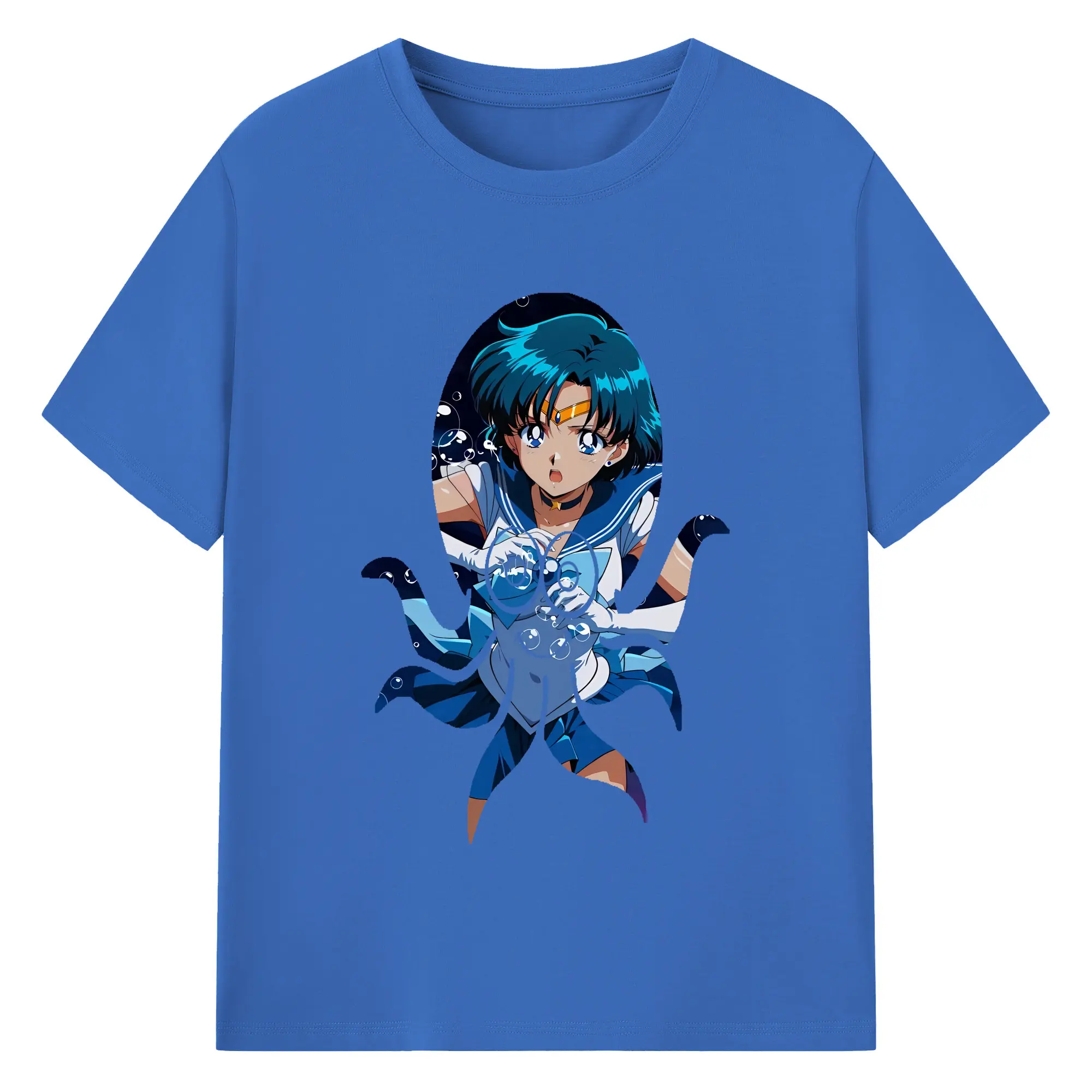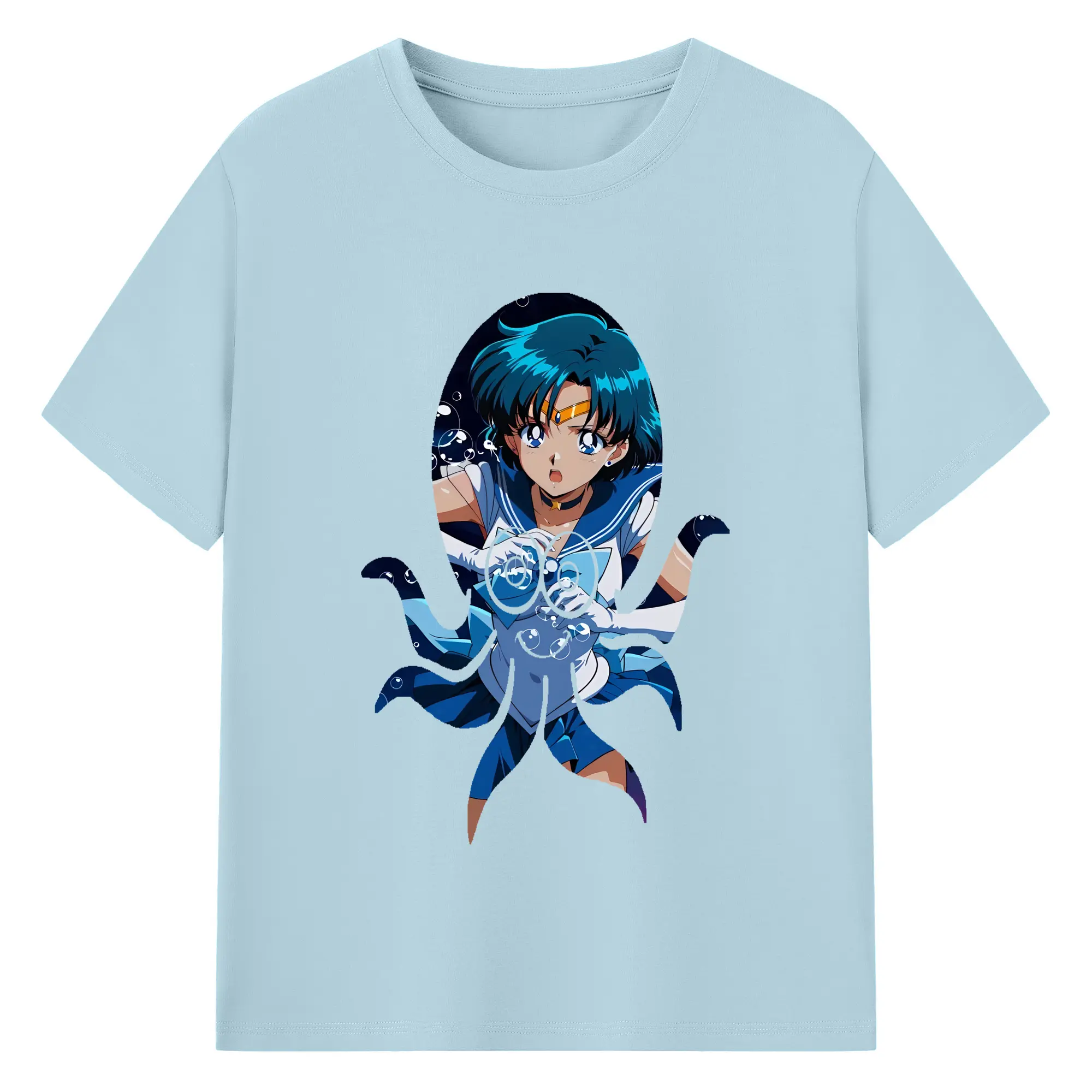 美少女戦士セーラームーン グッズ 水野 亜美 - 綿100% 半袖Tシャツ ・ バックプリント ・ 快適 通気性 ・ 日常使い 散歩 スポーツ用