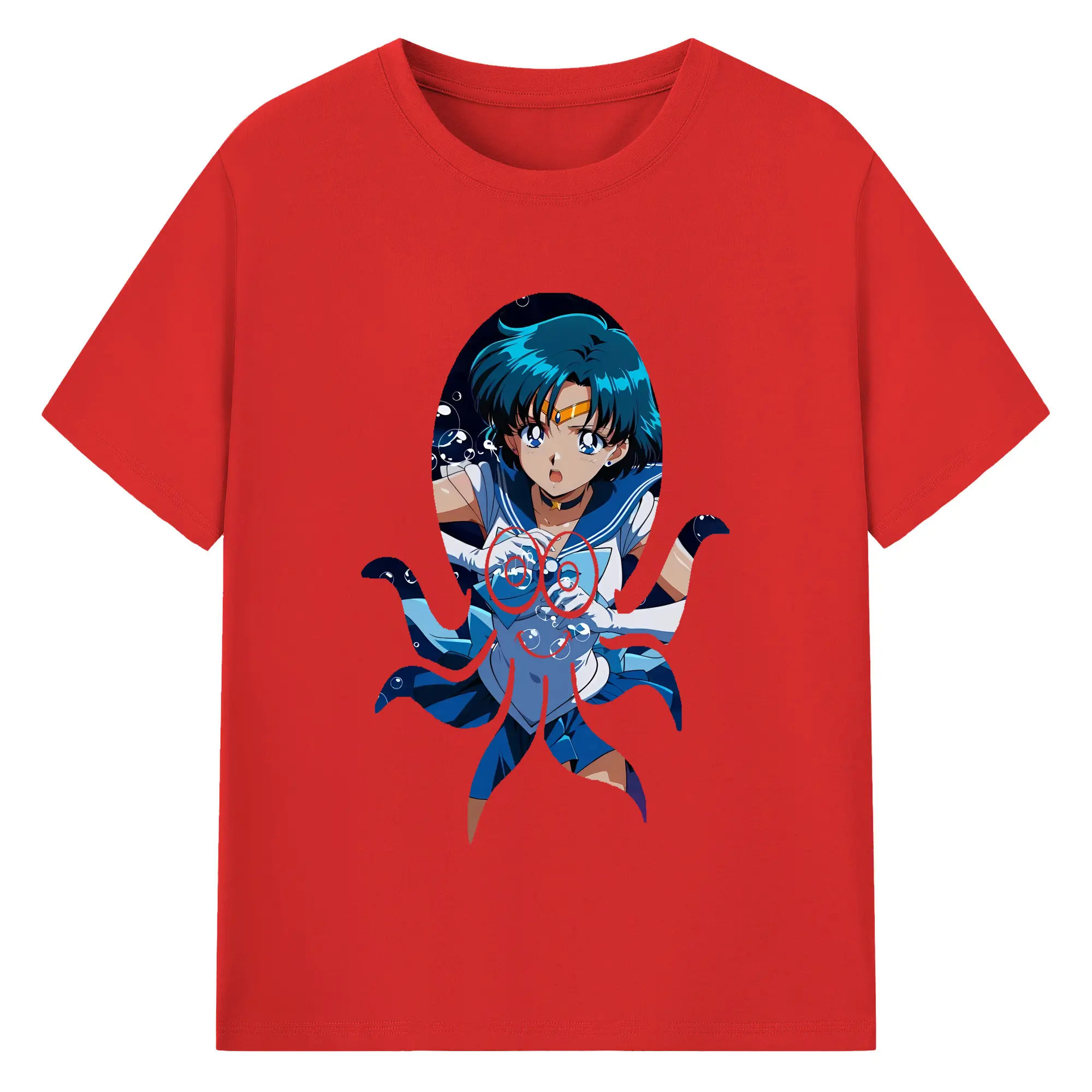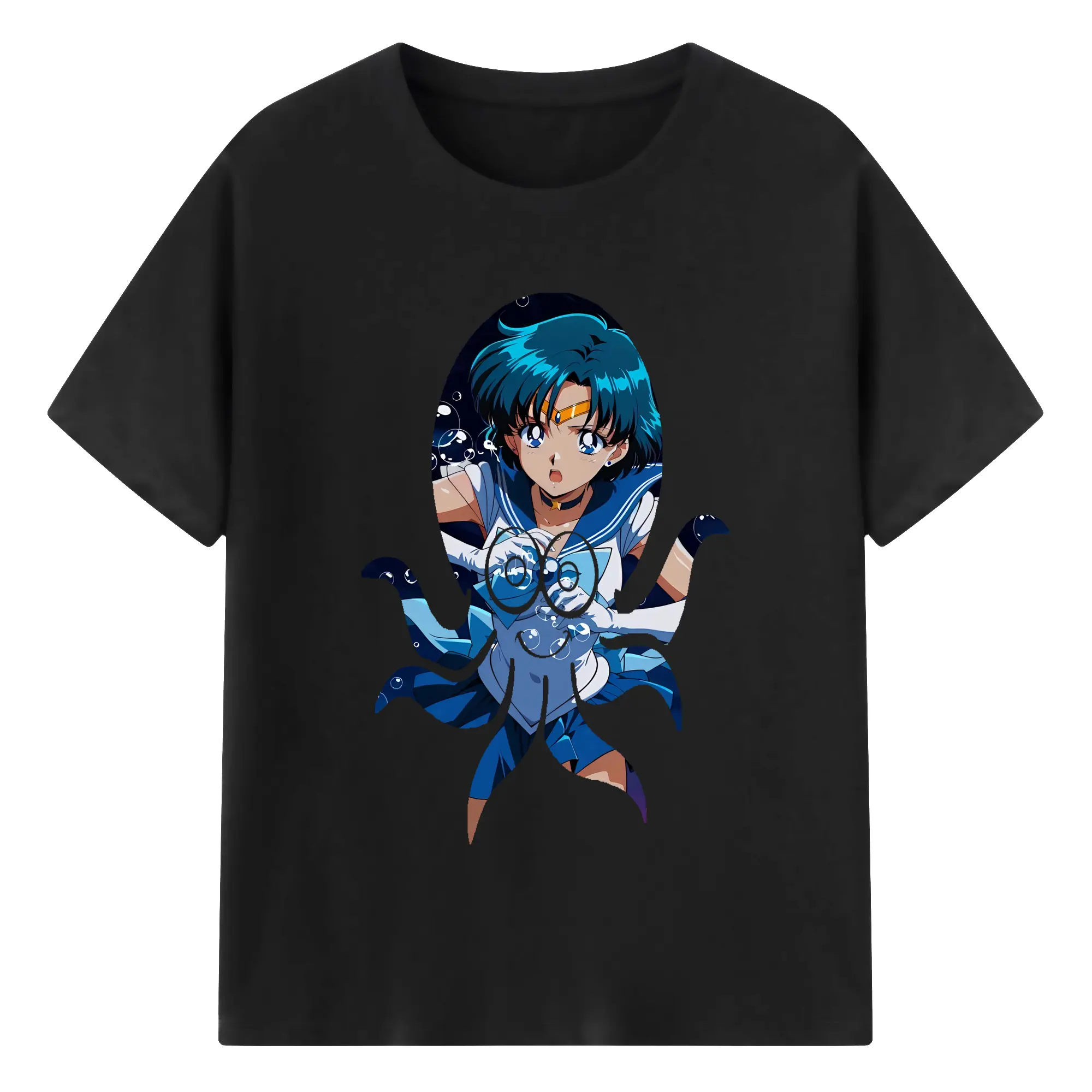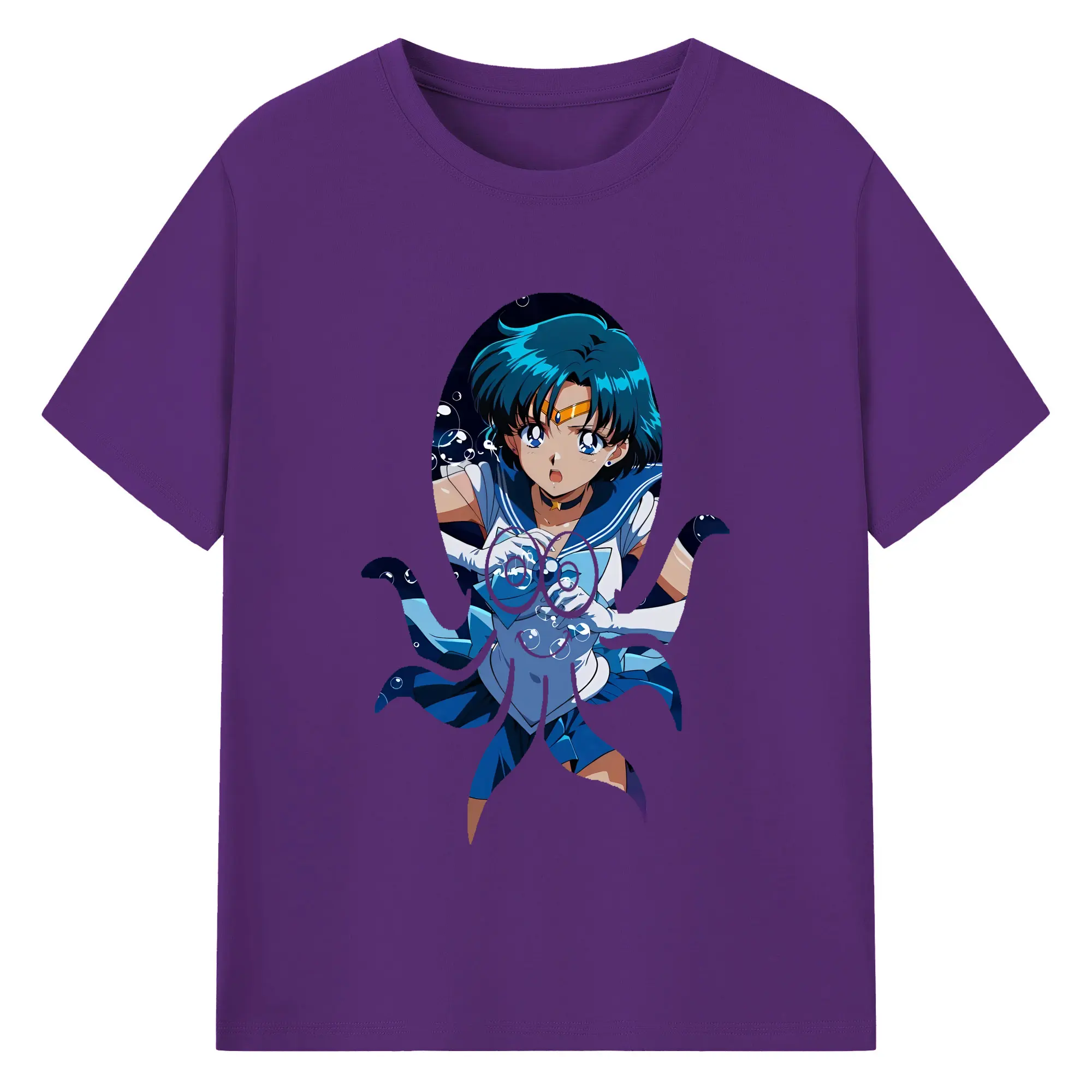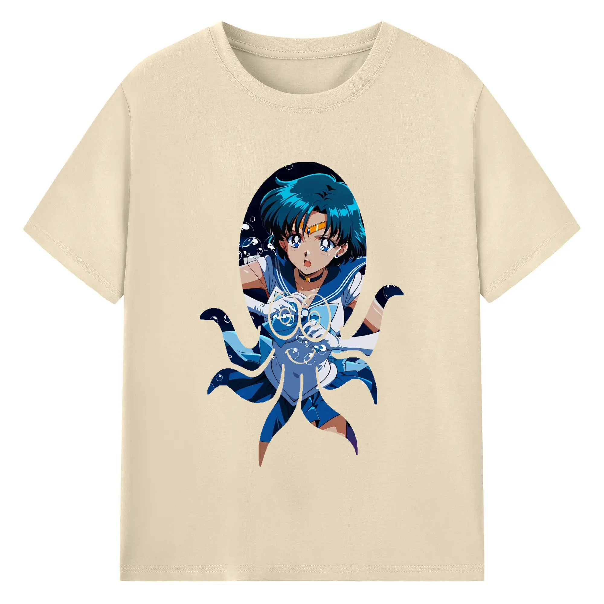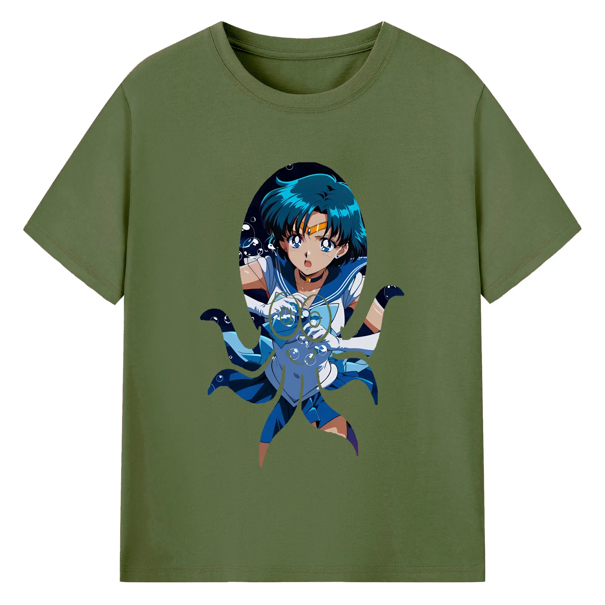 美少女戦士セーラームーン グッズ 水野 亜美 - 綿100% 半袖Tシャツ ・ バックプリント ・ 快適 通気性 ・ 日常使い 散歩 スポーツ用