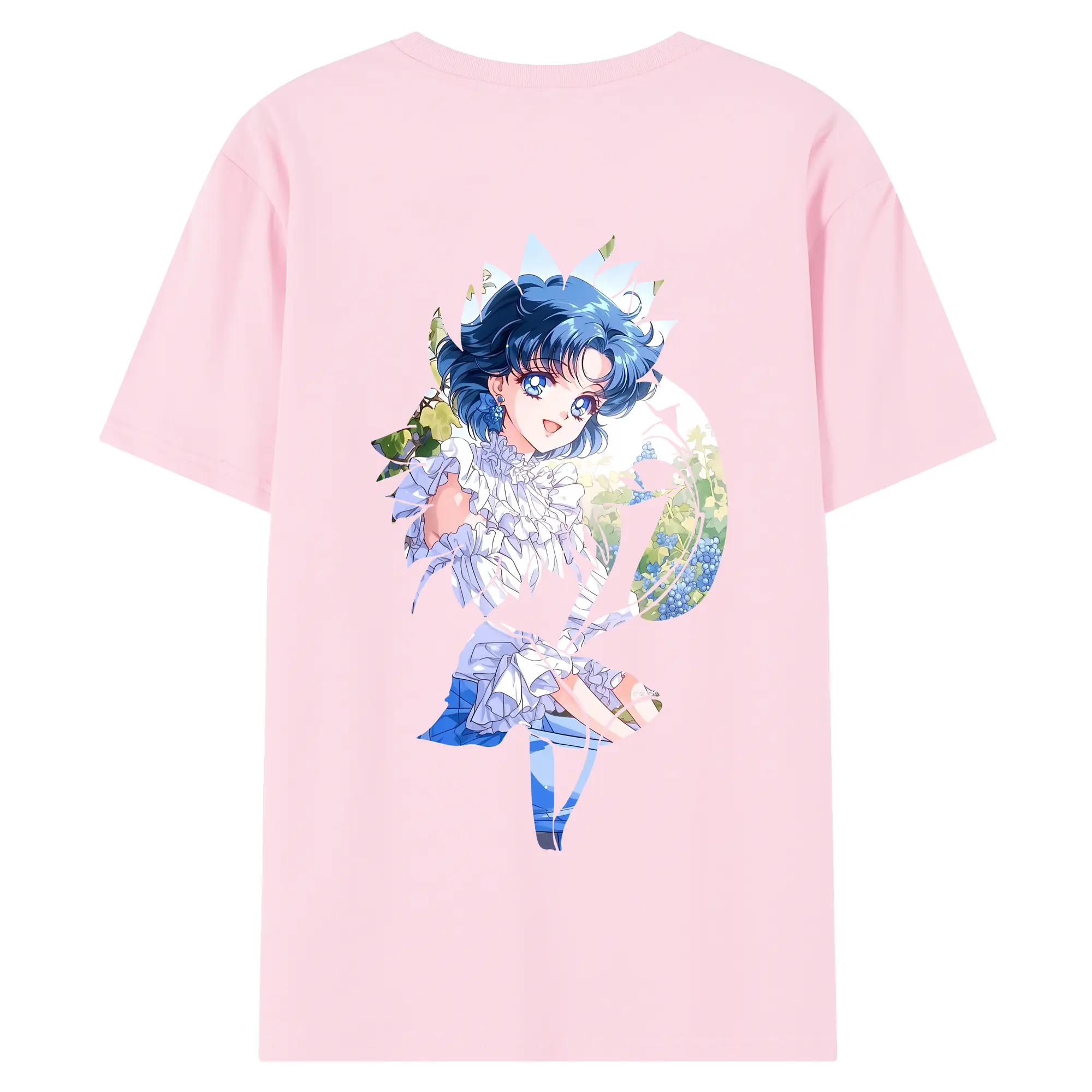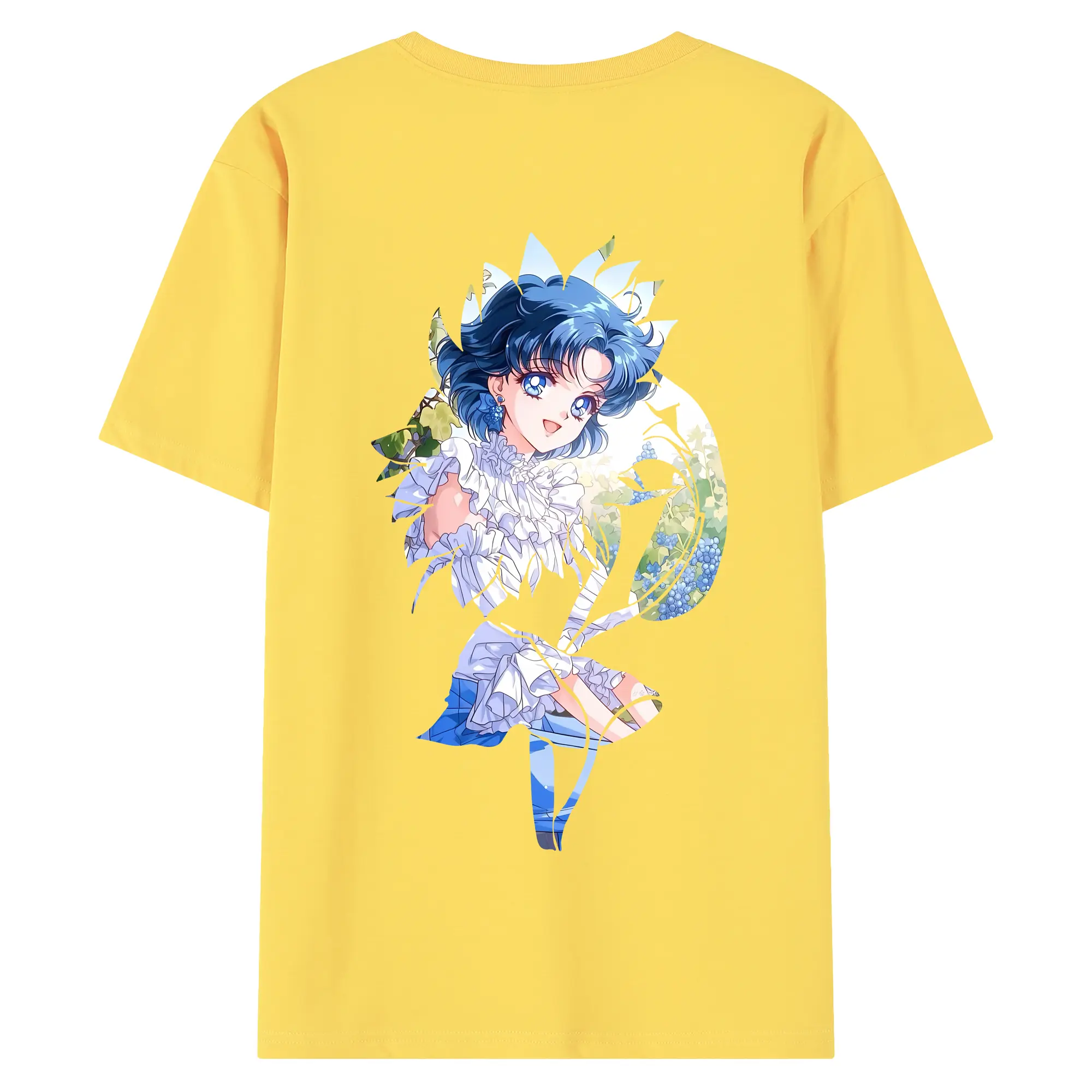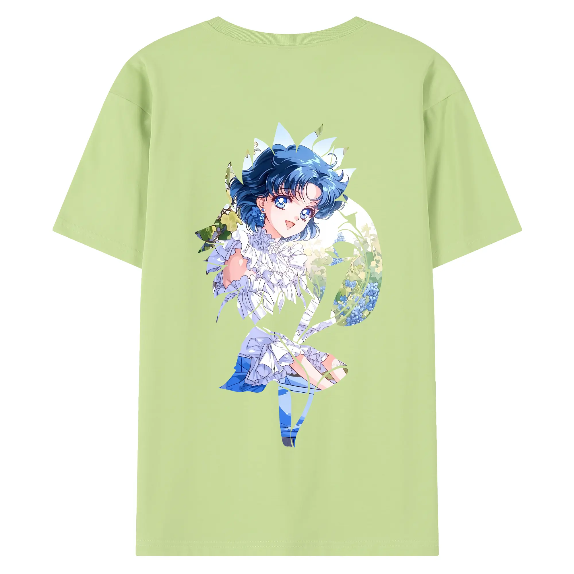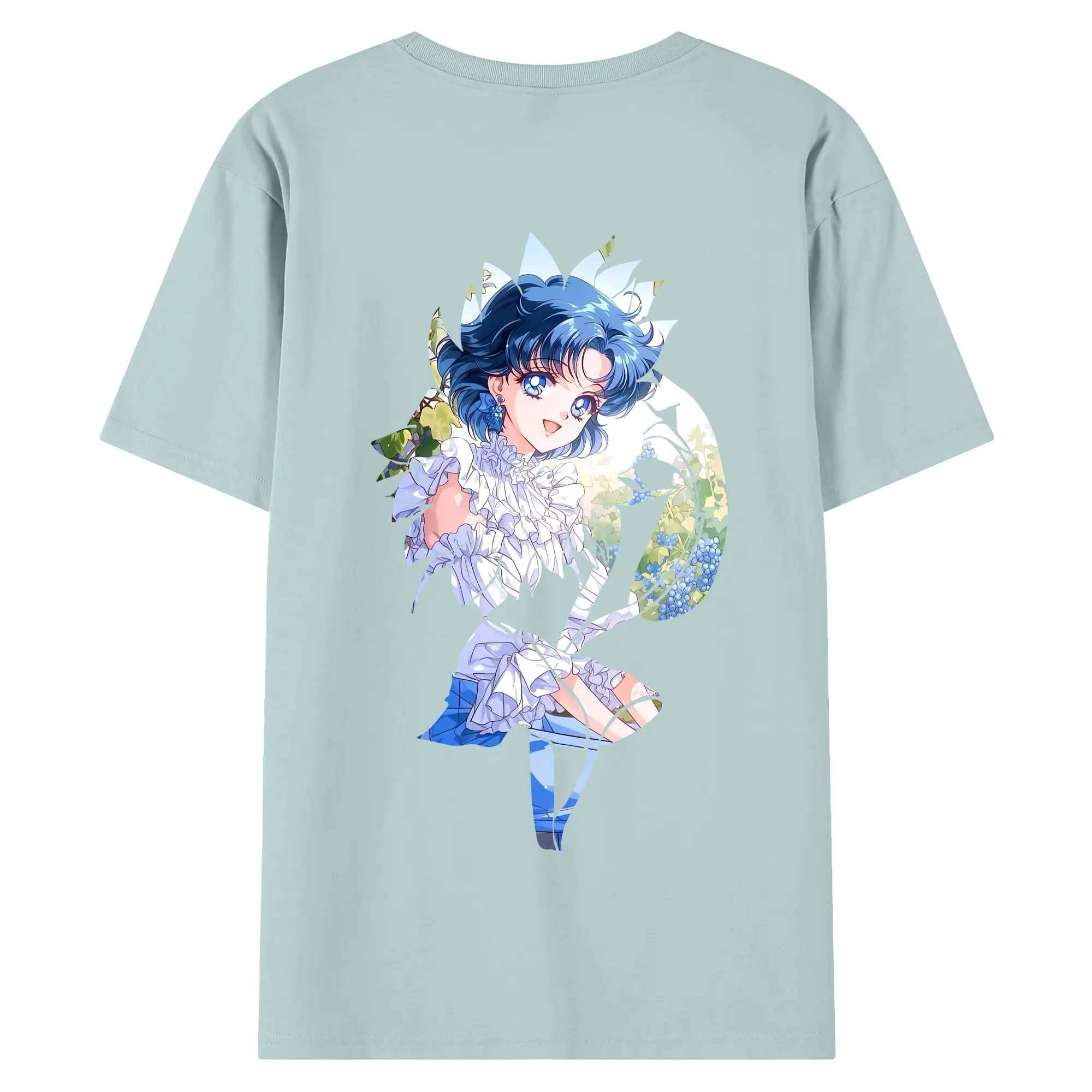 美少女戦士セーラームーン グッズ 水野 亜美 - 綿100% 半袖Tシャツ ・ フロントプリント ・ 快適 通気性 ・ 日常使い 散歩 スポーツ用