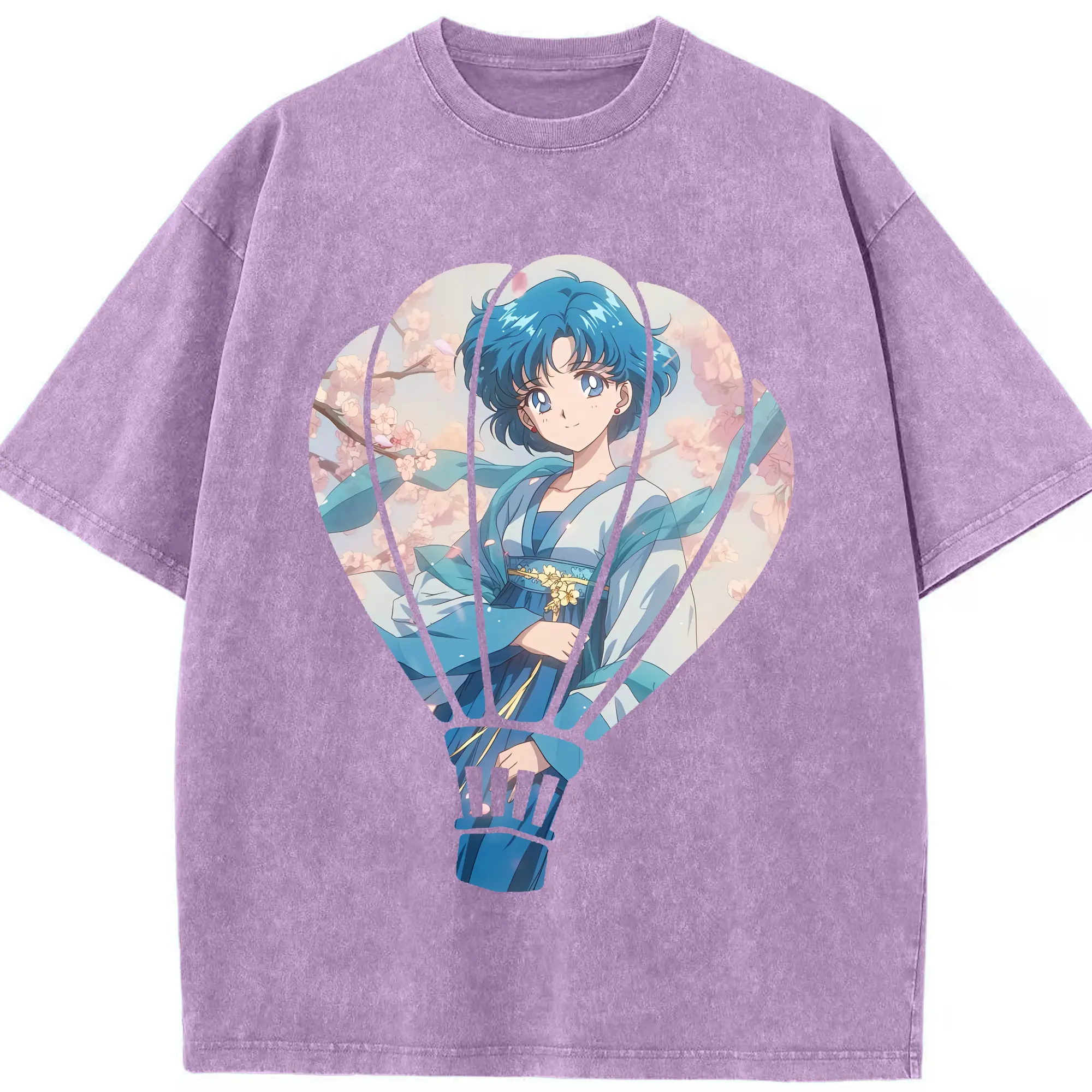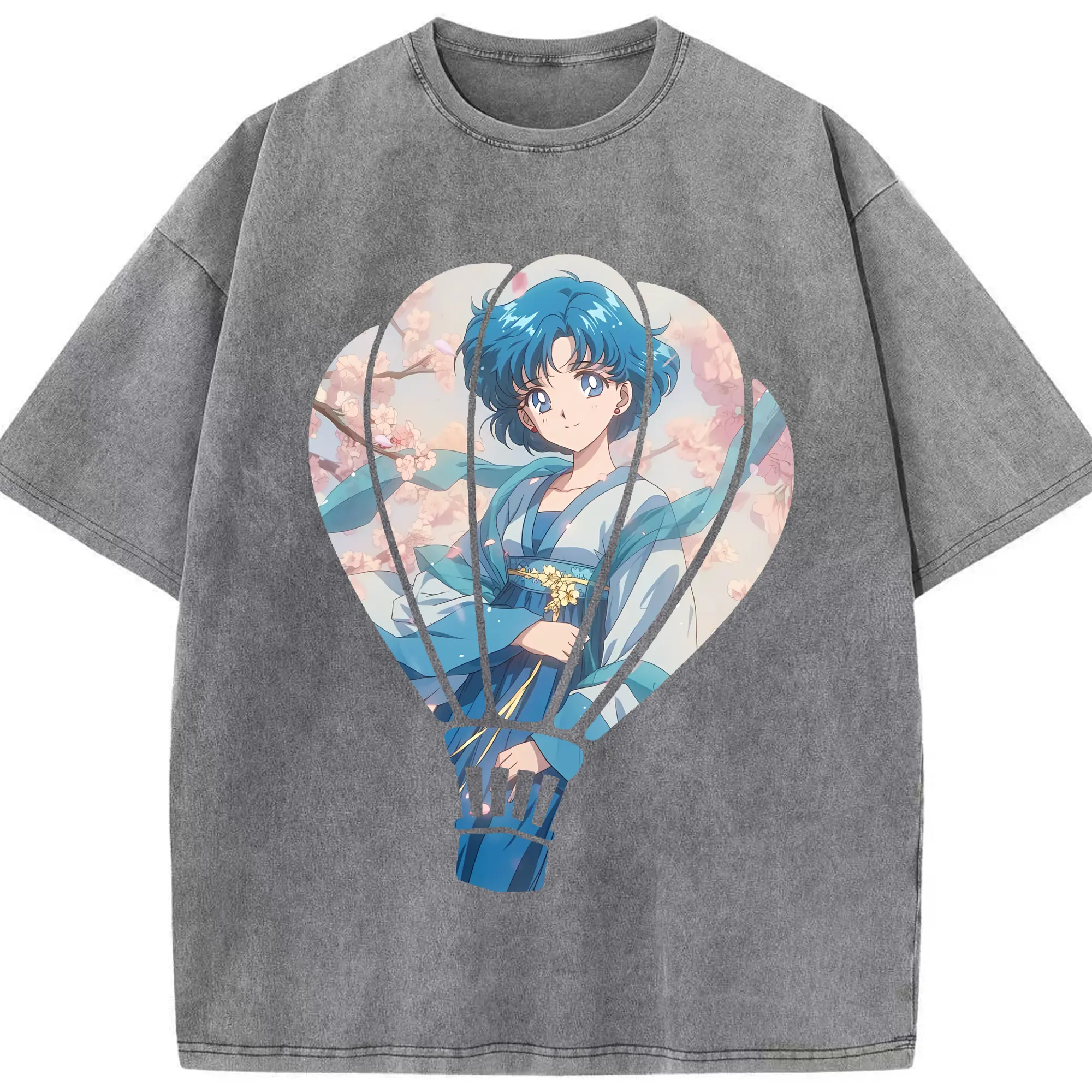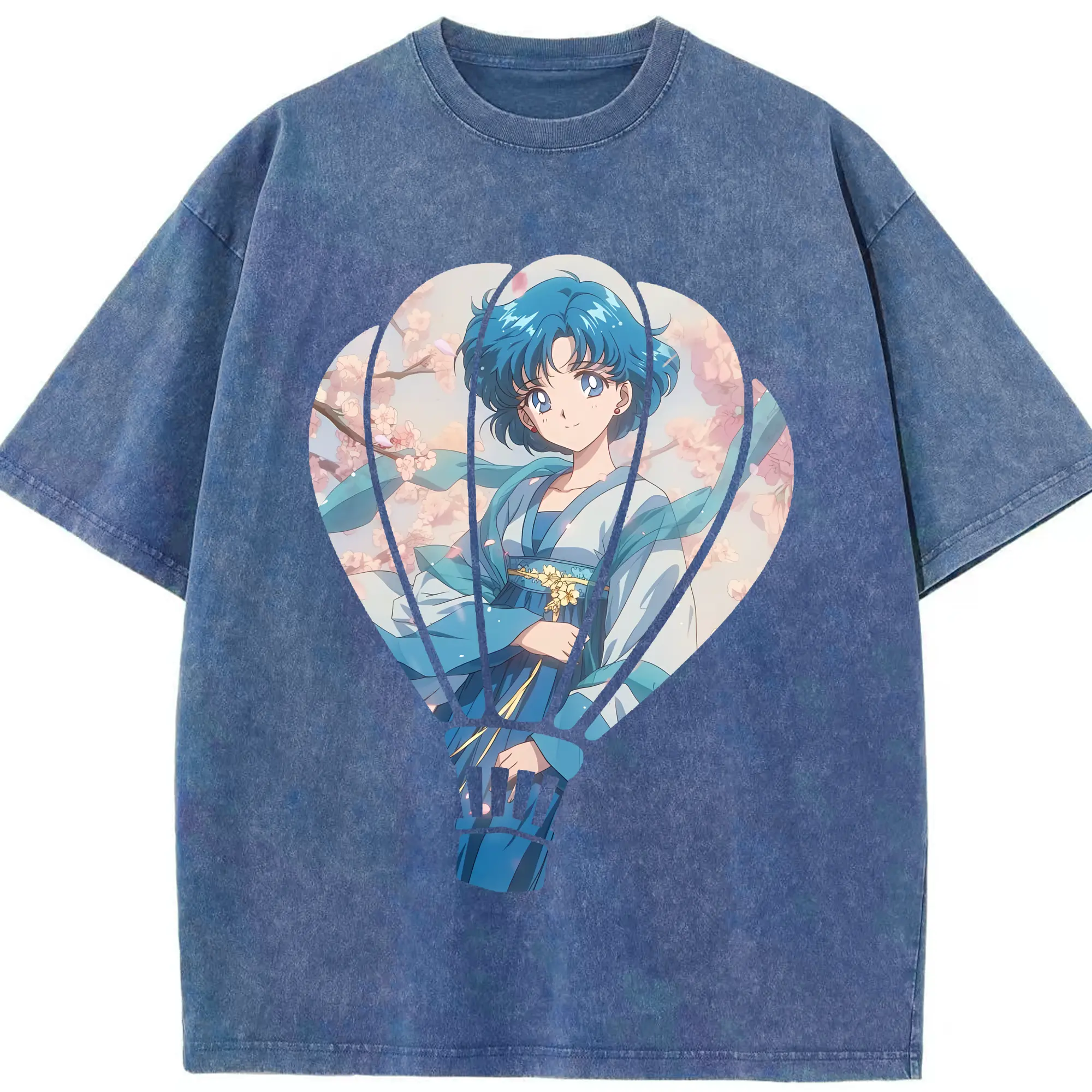 美少女戦士セーラームーン グッズ 水野 亜美 - 綿100% ヴィンテージ風 半袖Tシャツ ・ 背面プリント ・ 柔らか肌触り ・ 通気性 快適 ・ スポーツ カジュアル 外出用
