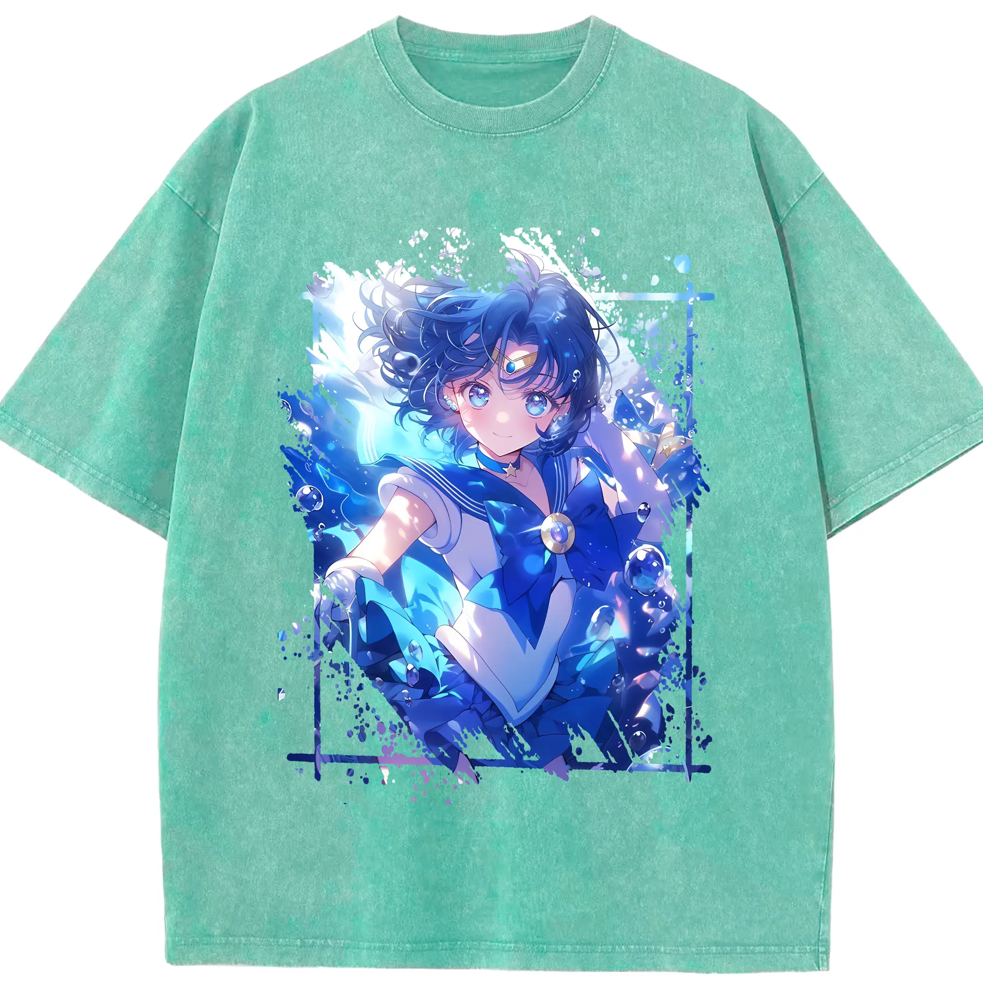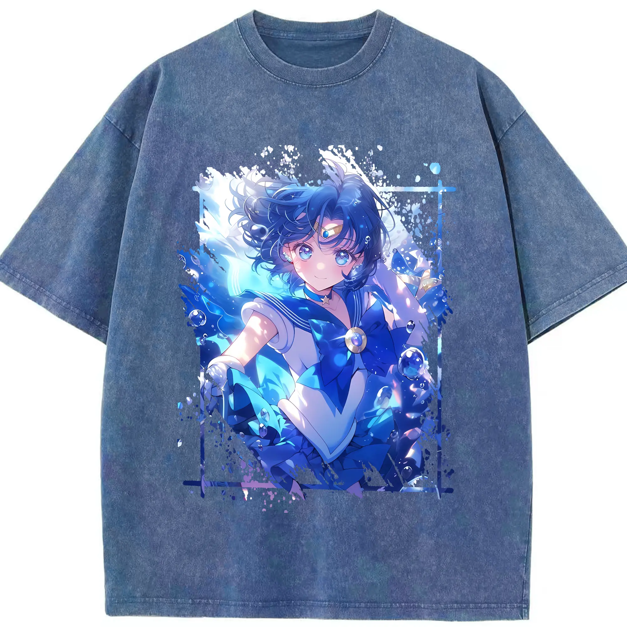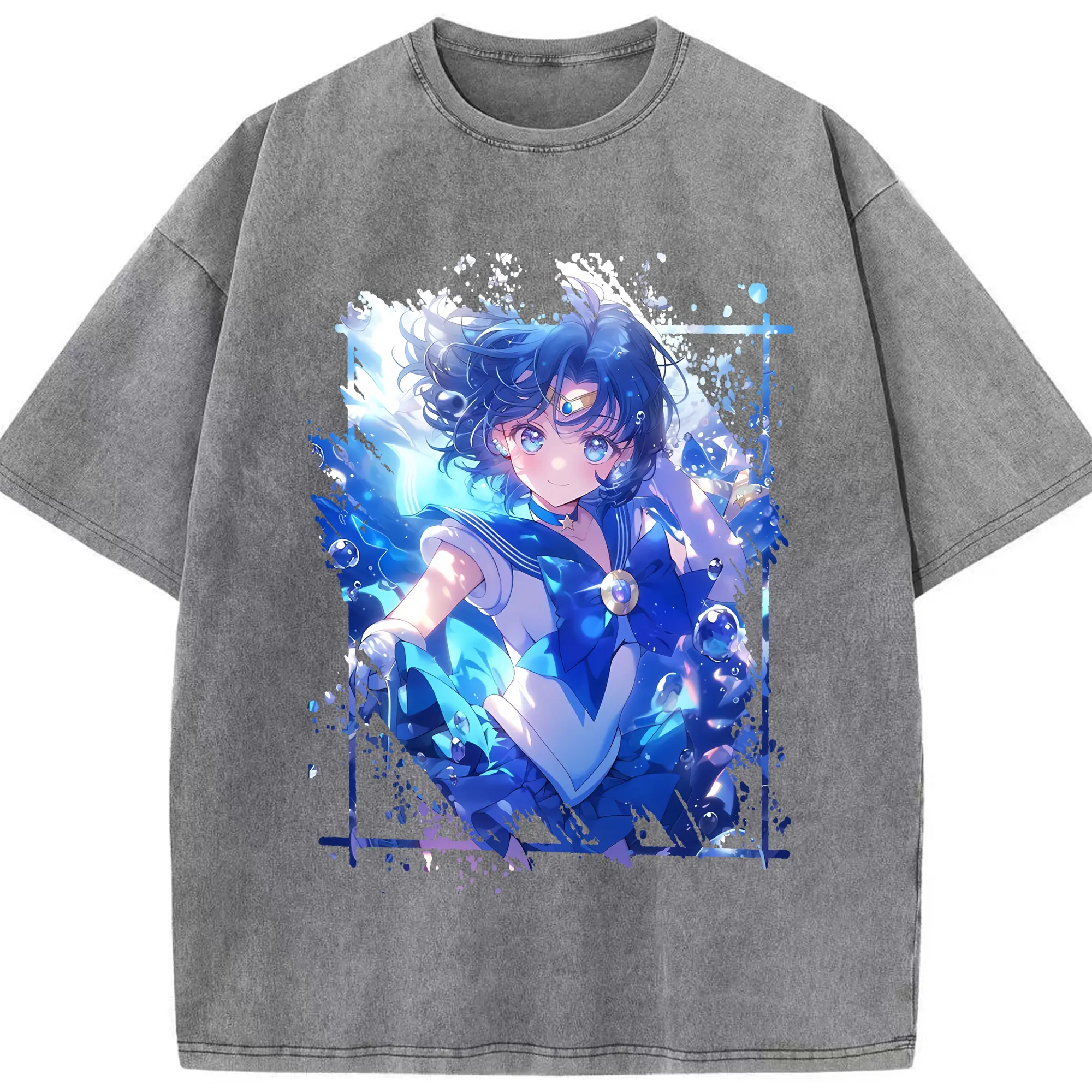 美少女戦士セーラームーン グッズ 水野 亜美 - 綿100% ヴィンテージ風 半袖Tシャツ ・ 背面プリント ・ 柔らか肌触り ・ 通気性 快適 ・ スポーツ カジュアル 外出用