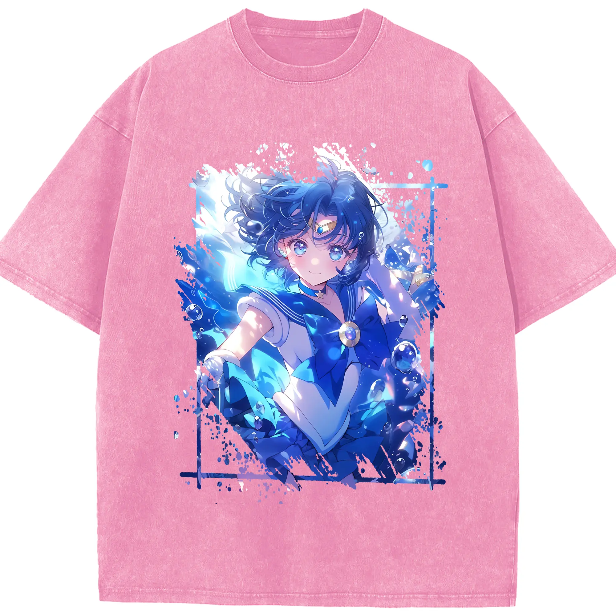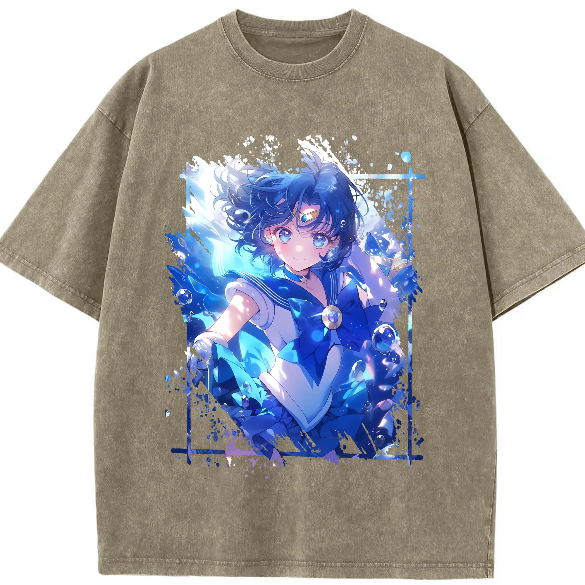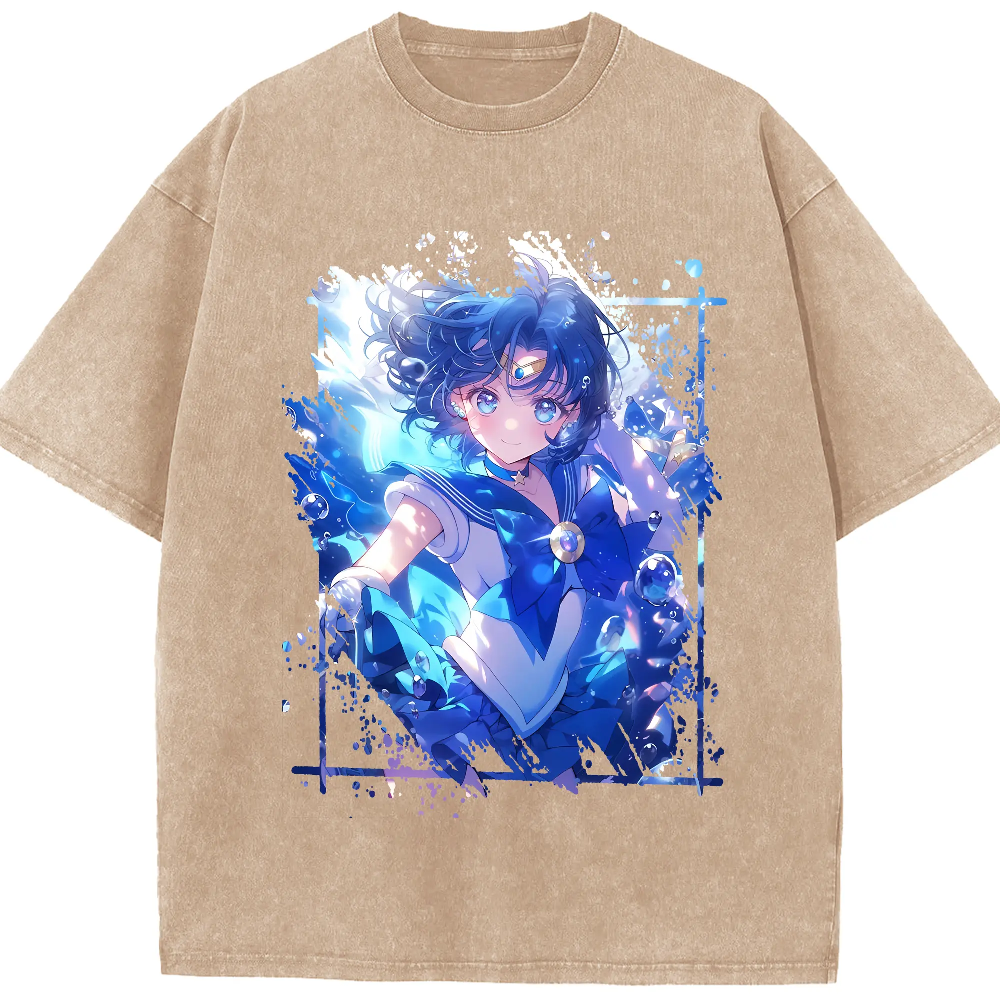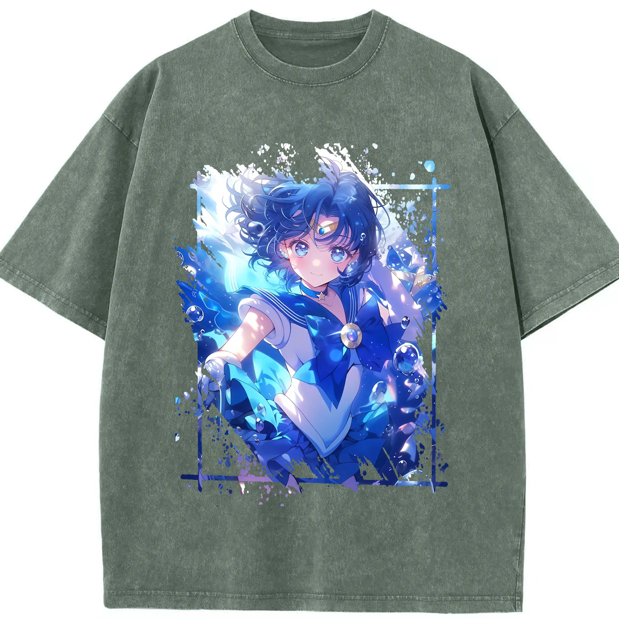美少女戦士セーラームーン グッズ 水野 亜美 - 綿100% ヴィンテージ風 半袖Tシャツ ・ 背面プリント ・ 柔らか肌触り ・ 通気性 快適 ・ スポーツ カジュアル 外出用
