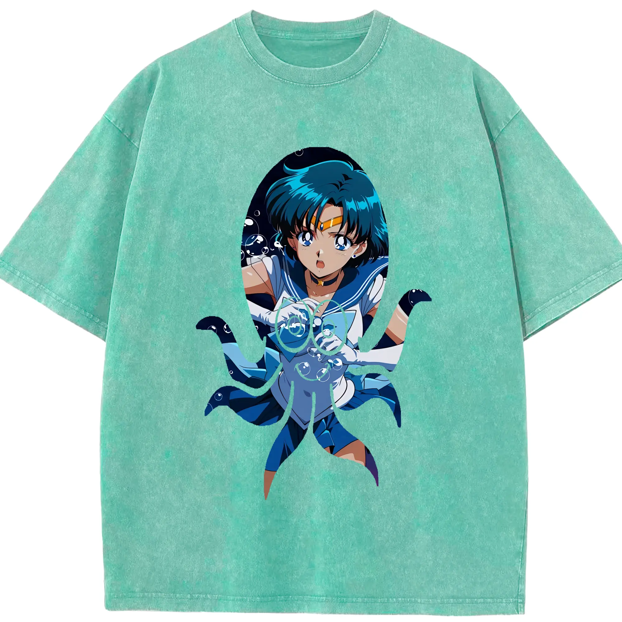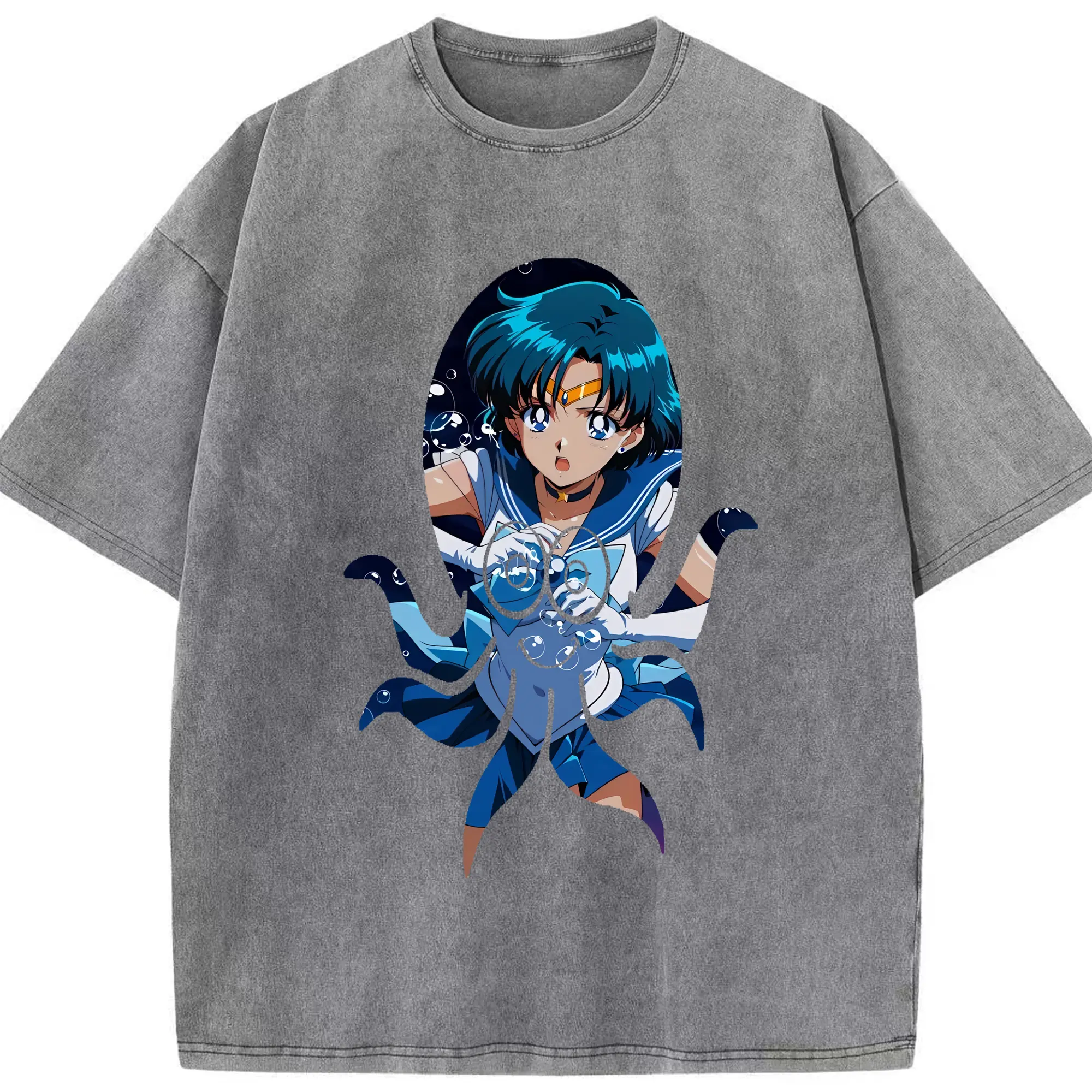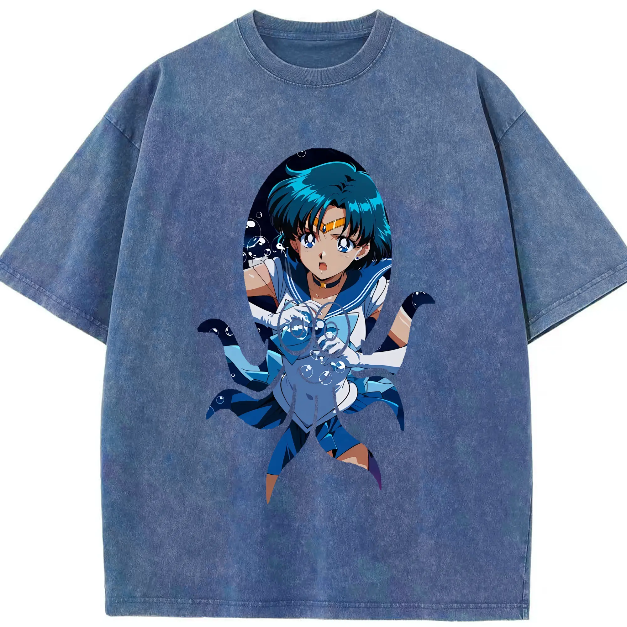 美少女戦士セーラームーン グッズ 水野 亜美 - 綿100% ヴィンテージ風 半袖Tシャツ ・ 背面プリント ・ 柔らか肌触り ・ 通気性 快適 ・ スポーツ カジュアル 外出用