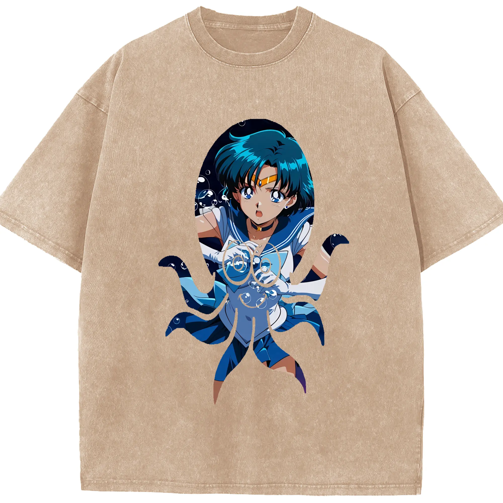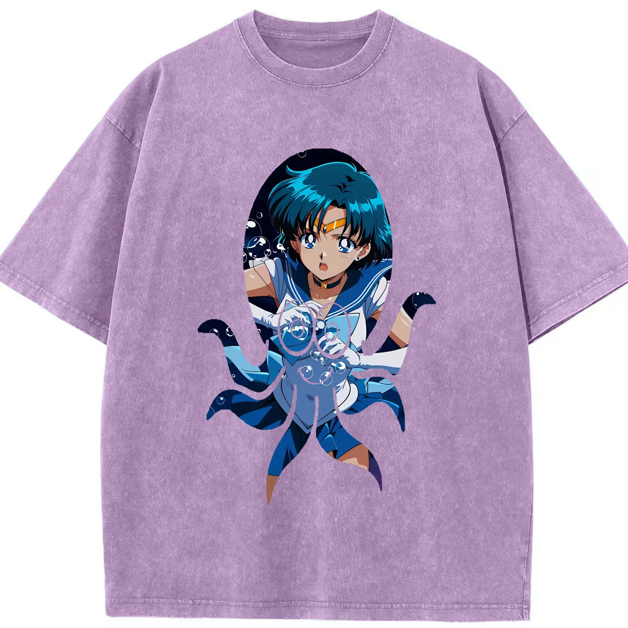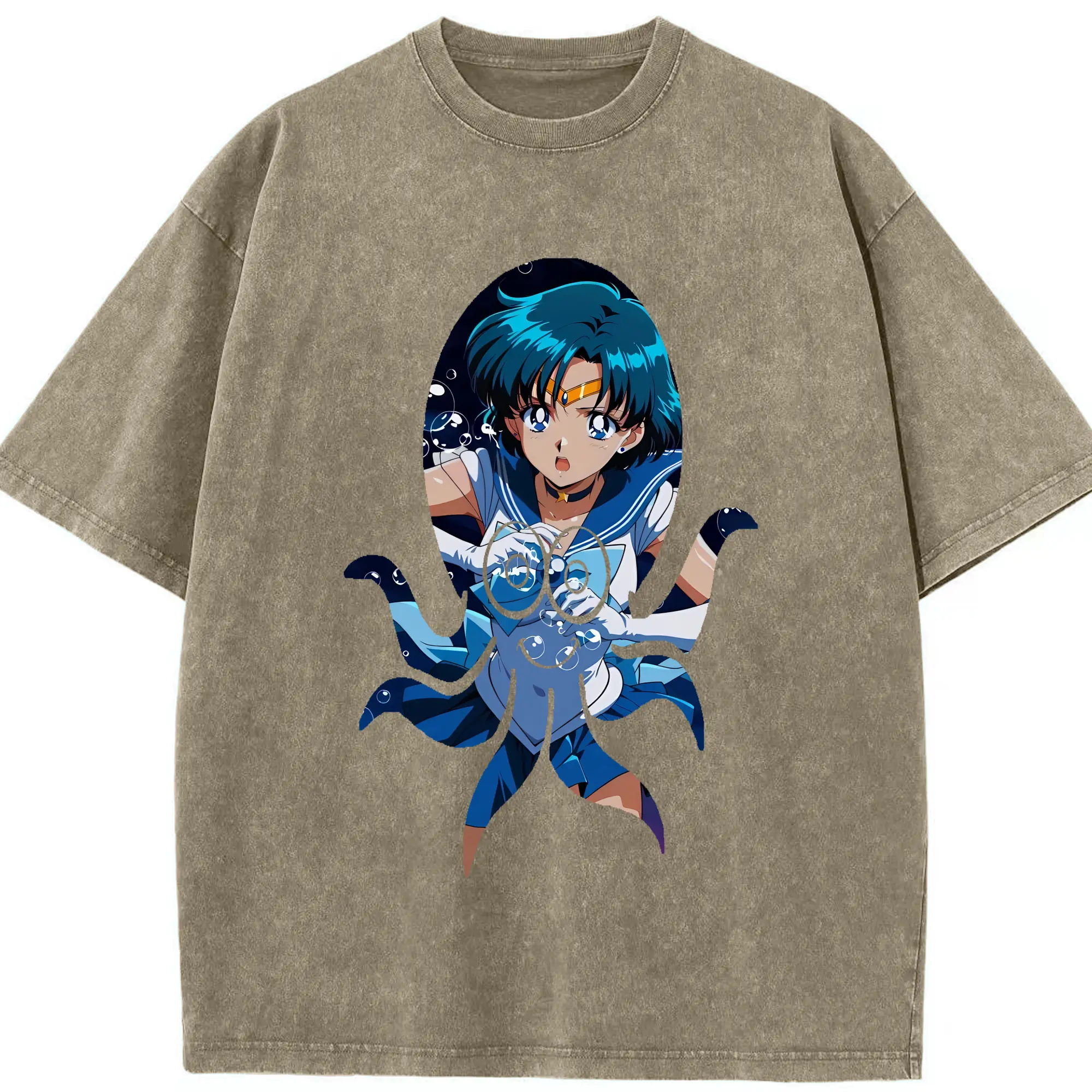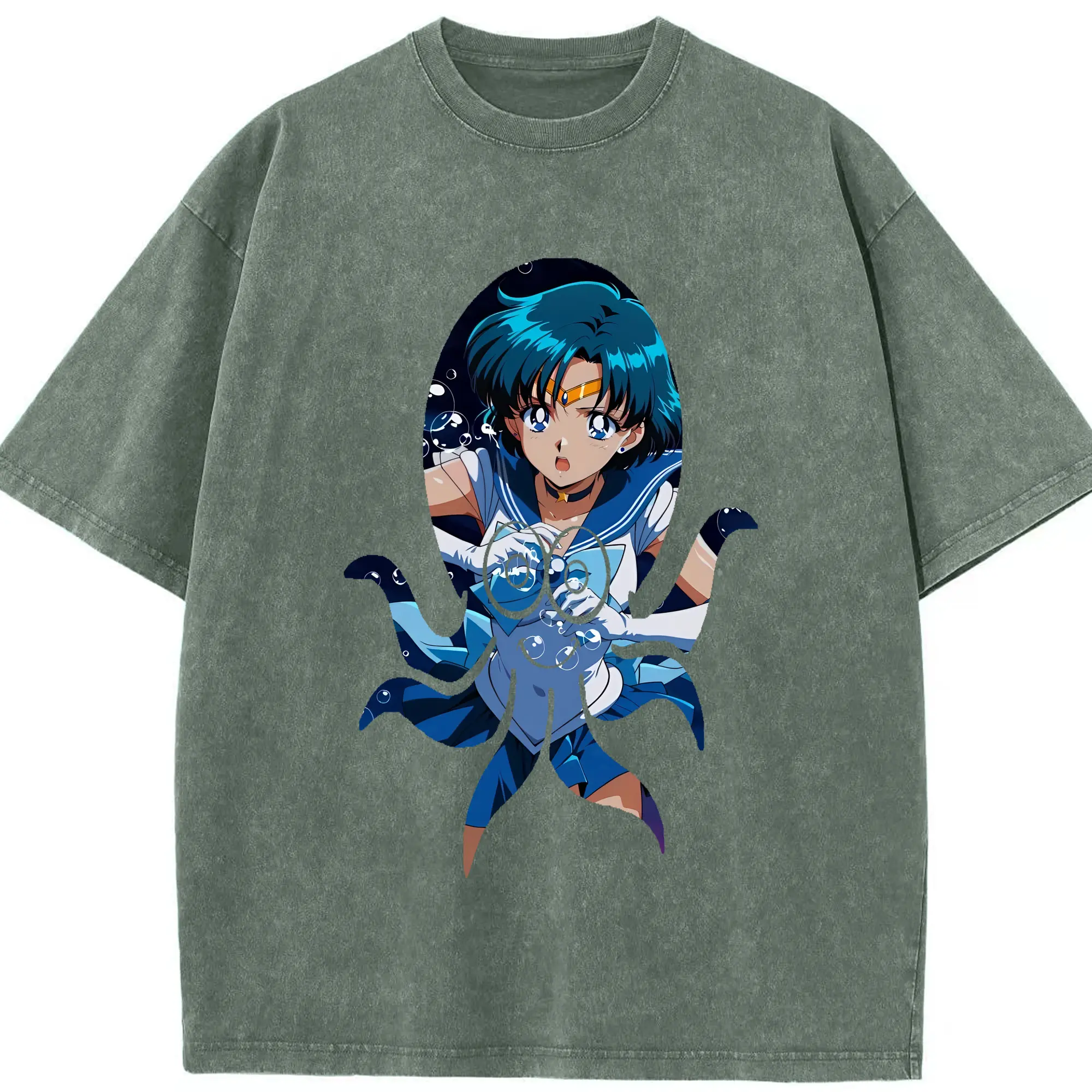 美少女戦士セーラームーン グッズ 水野 亜美 - 綿100% ヴィンテージ風 半袖Tシャツ ・ 背面プリント ・ 柔らか肌触り ・ 通気性 快適 ・ スポーツ カジュアル 外出用