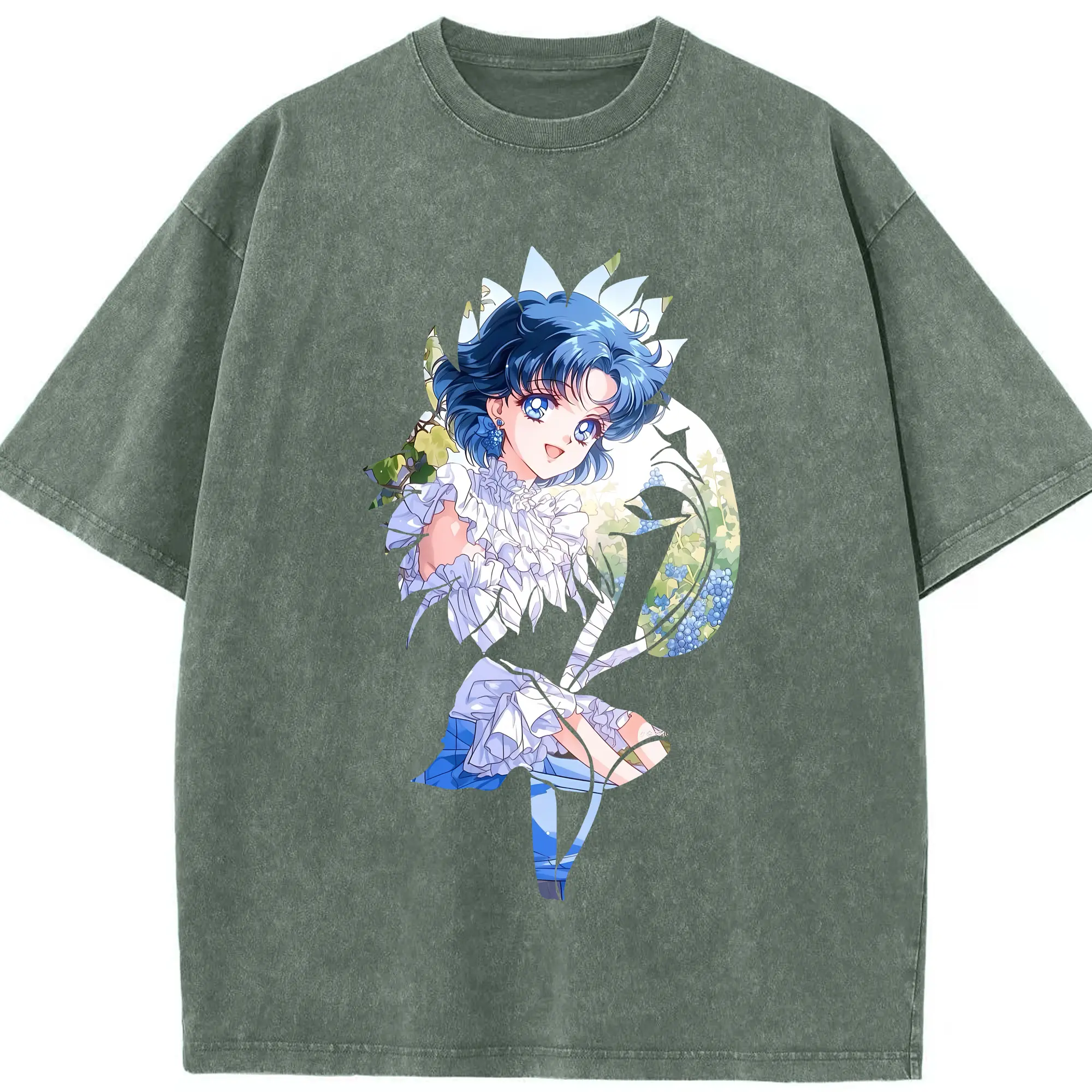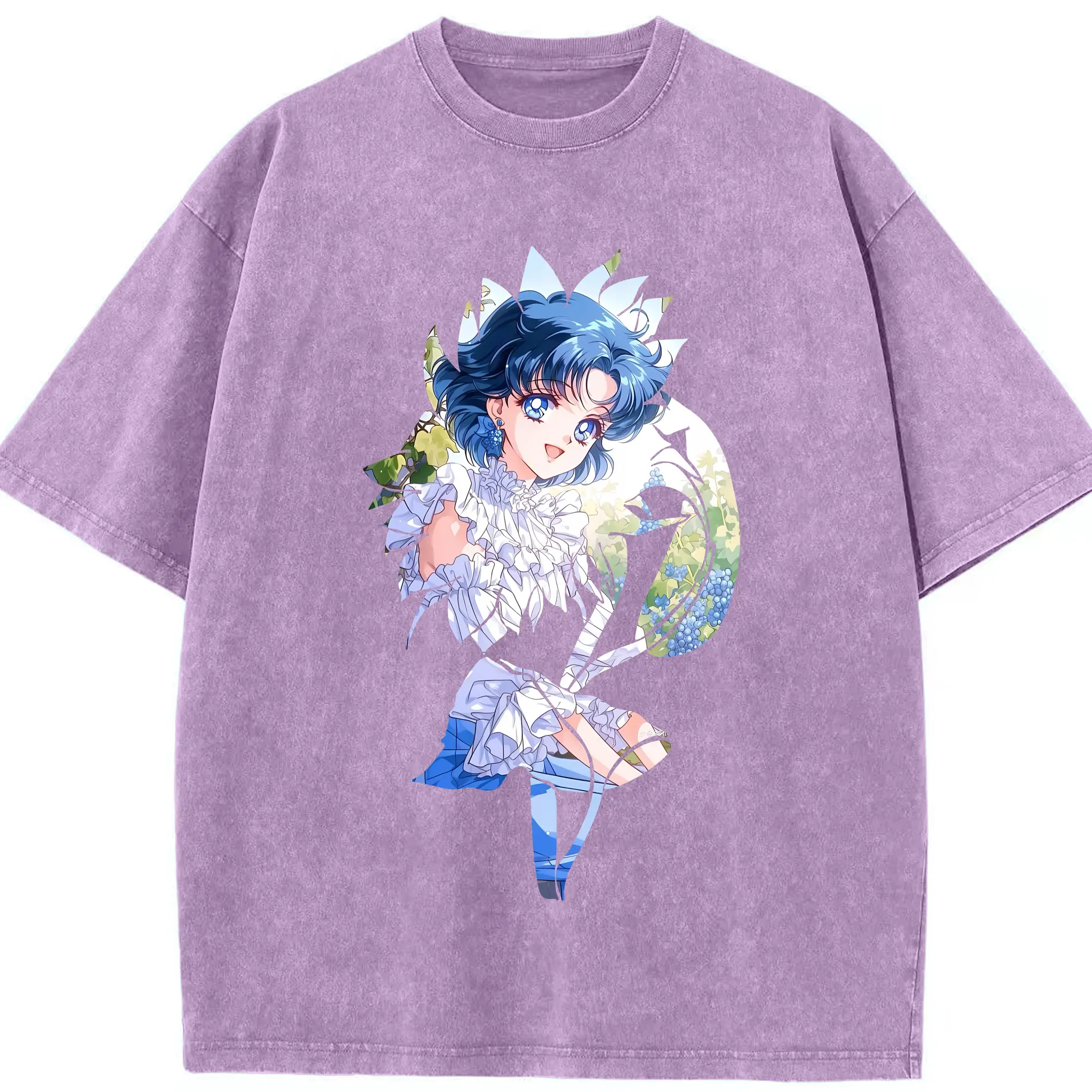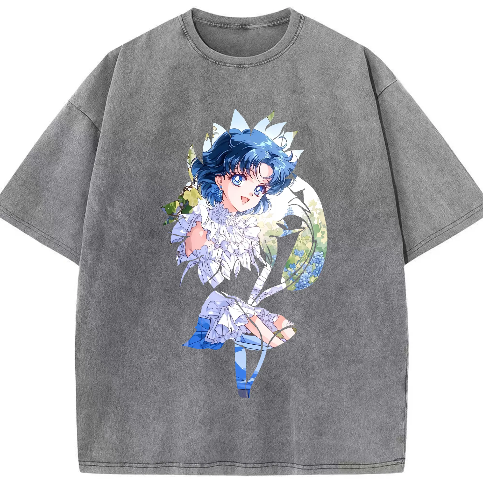 美少女戦士セーラームーン グッズ 水野 亜美 - 綿100% ヴィンテージ風 半袖Tシャツ ・ 背面プリント ・ 柔らか肌触り ・ 通気性 快適 ・ スポーツ カジュアル 外出用