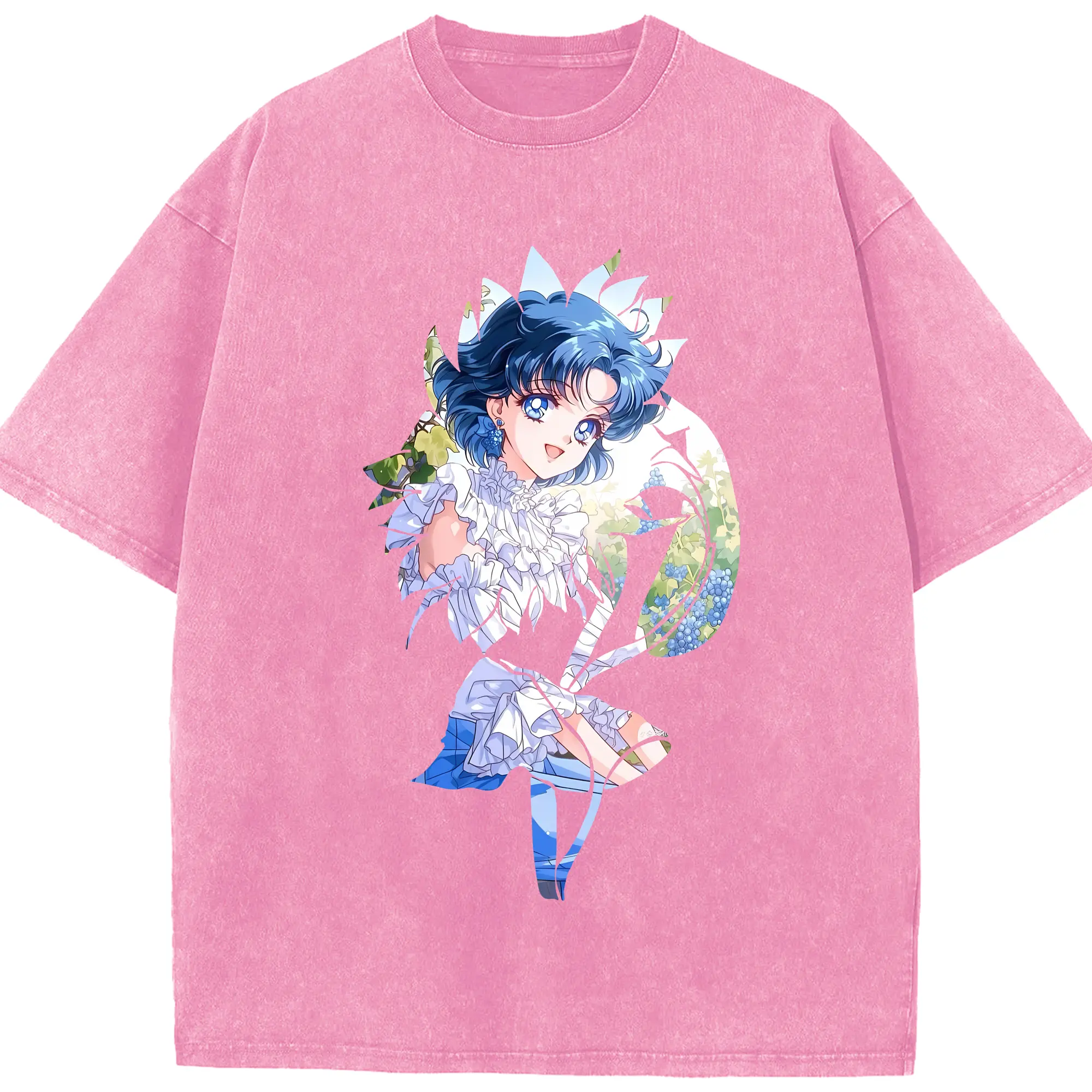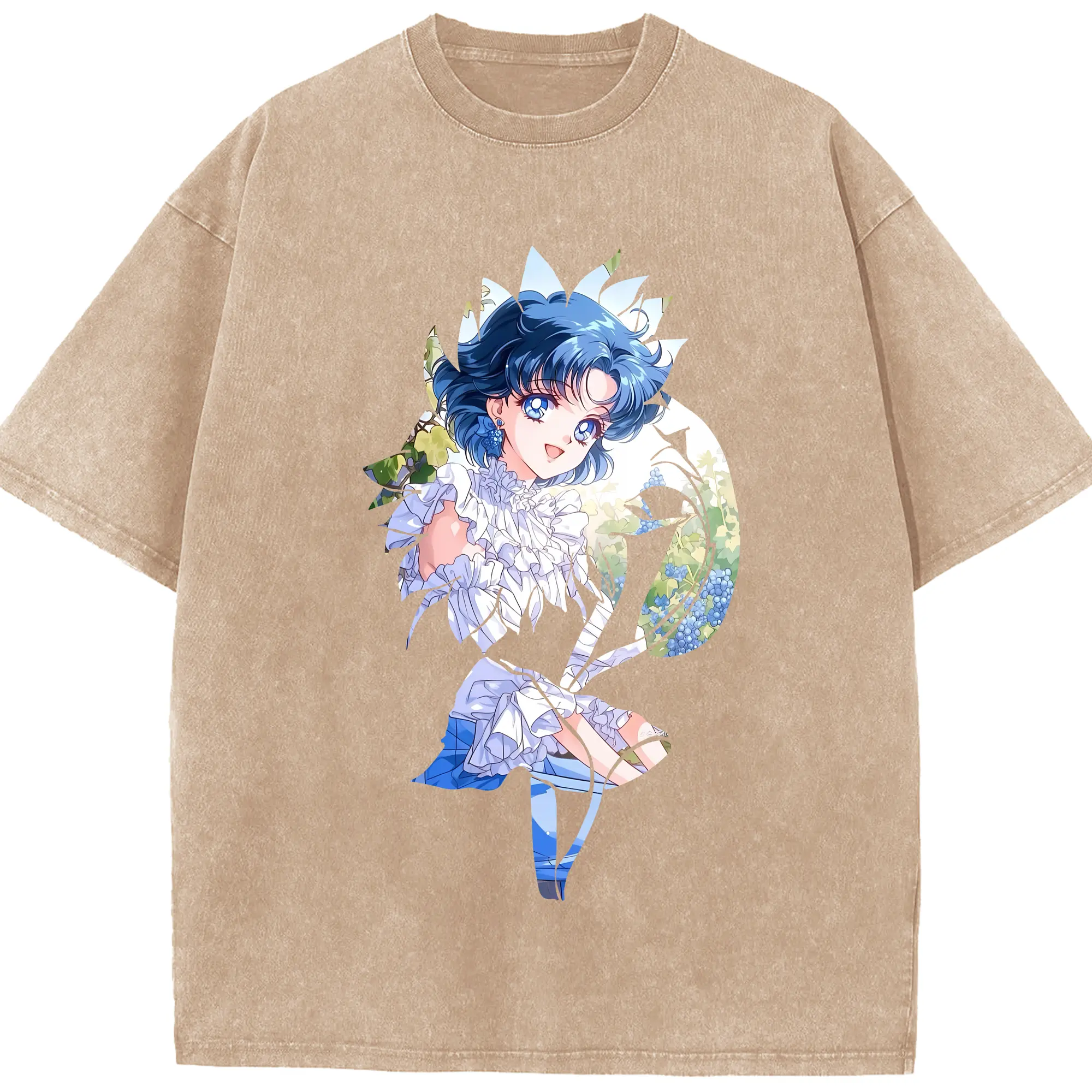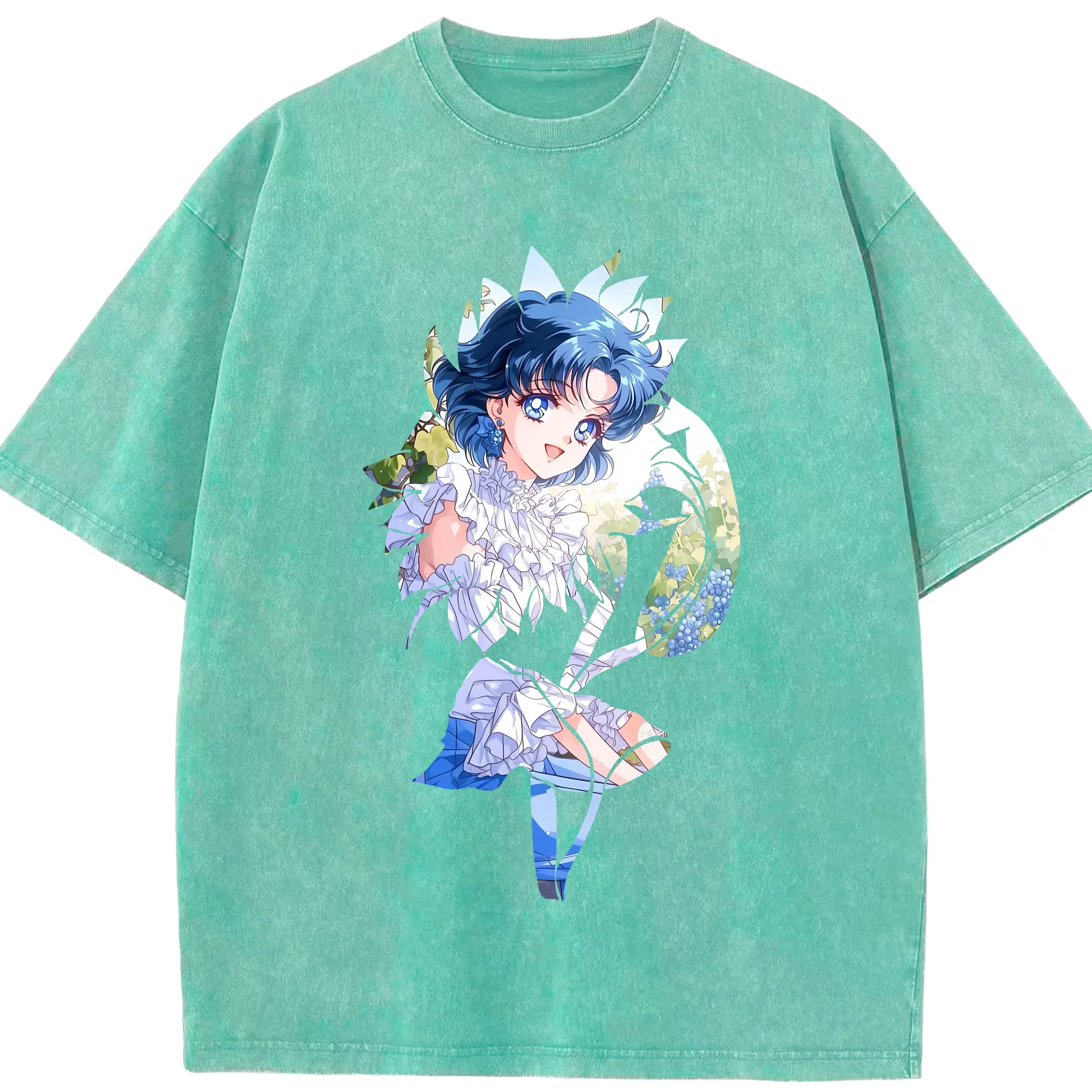 美少女戦士セーラームーン グッズ 水野 亜美 - 綿100% ヴィンテージ風 半袖Tシャツ ・ 背面プリント ・ 柔らか肌触り ・ 通気性 快適 ・ スポーツ カジュアル 外出用
