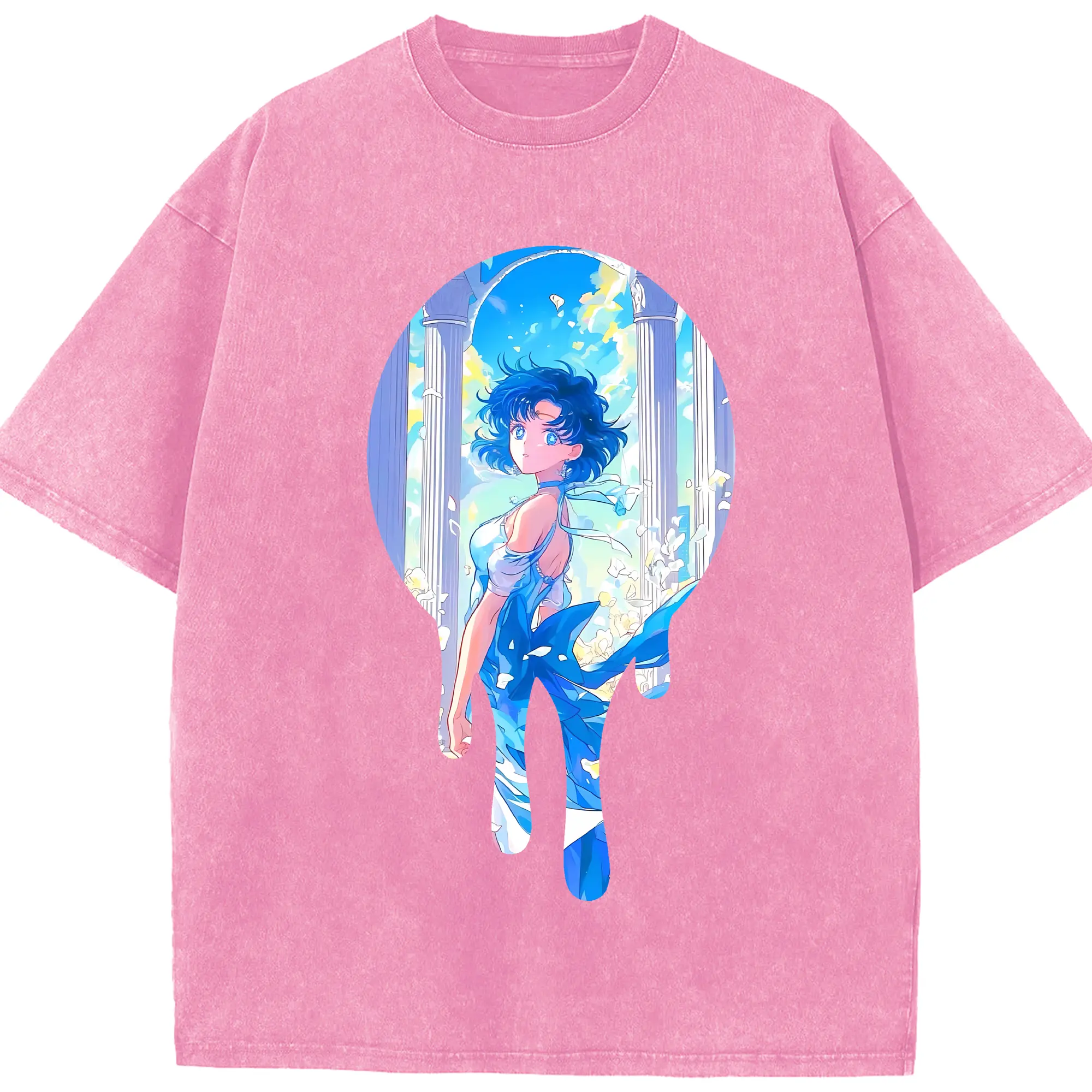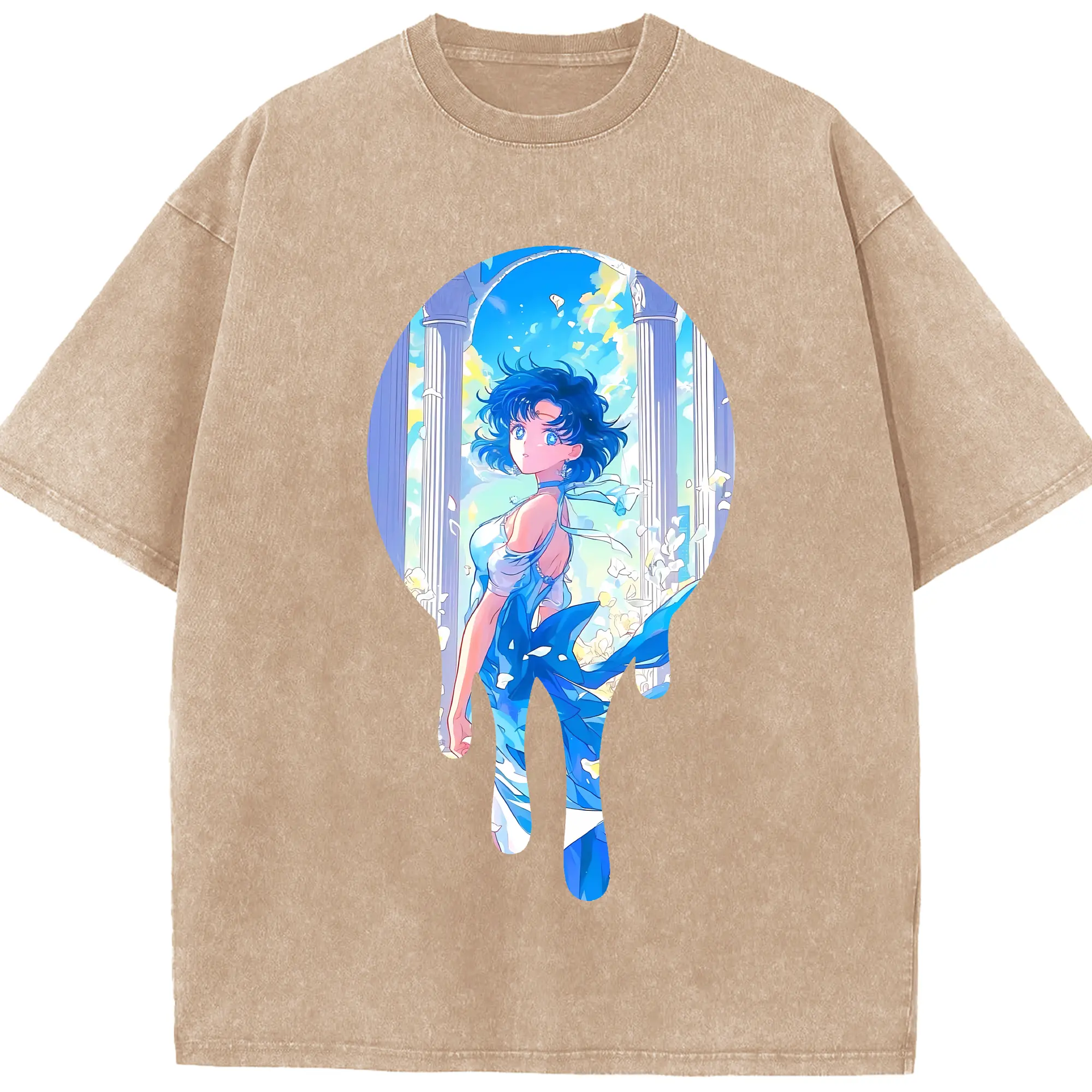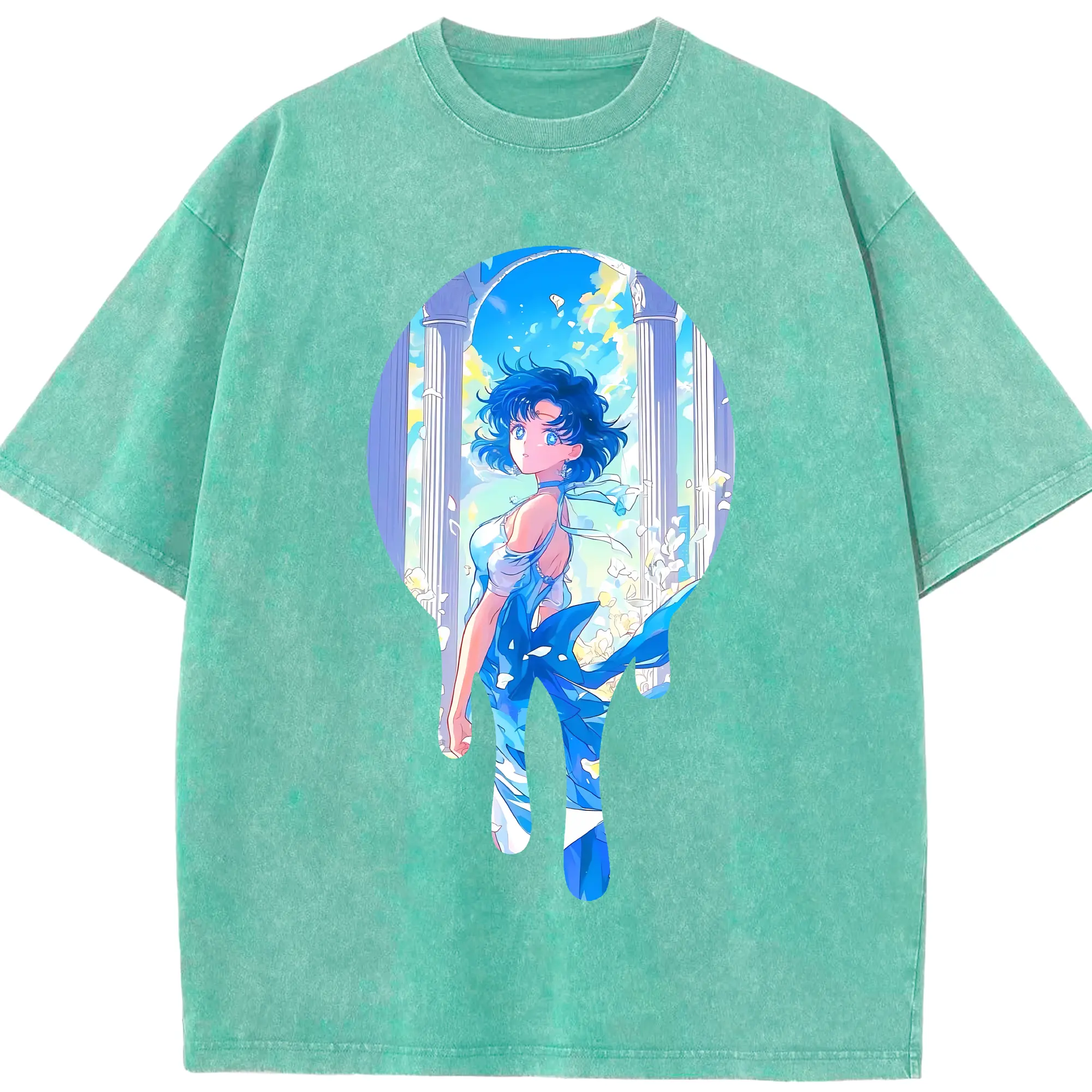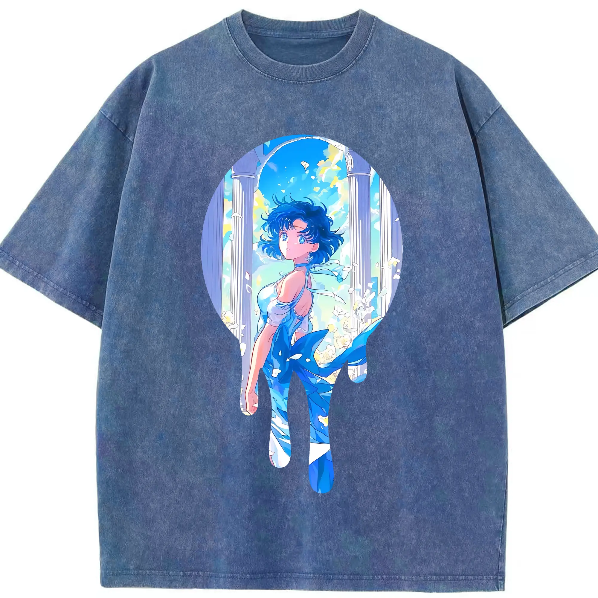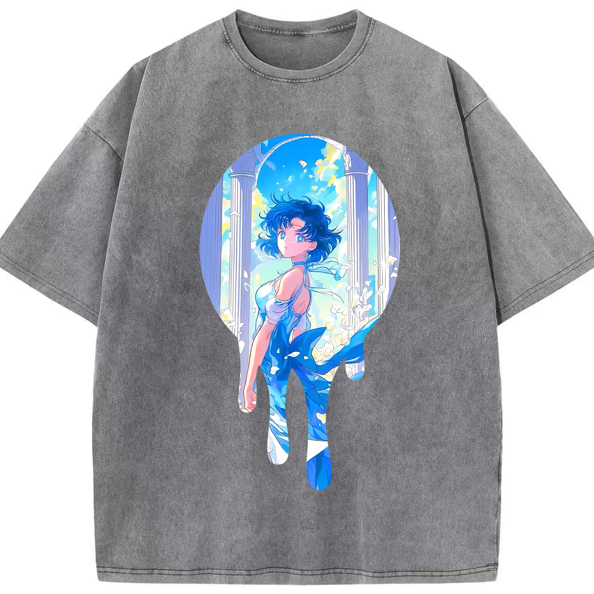 美少女戦士セーラームーン グッズ 水野 亜美 - 綿100% ヴィンテージ風 半袖Tシャツ ・ 背面プリント ・ 柔らか肌触り ・ 通気性 快適 ・ スポーツ カジュアル 外出用