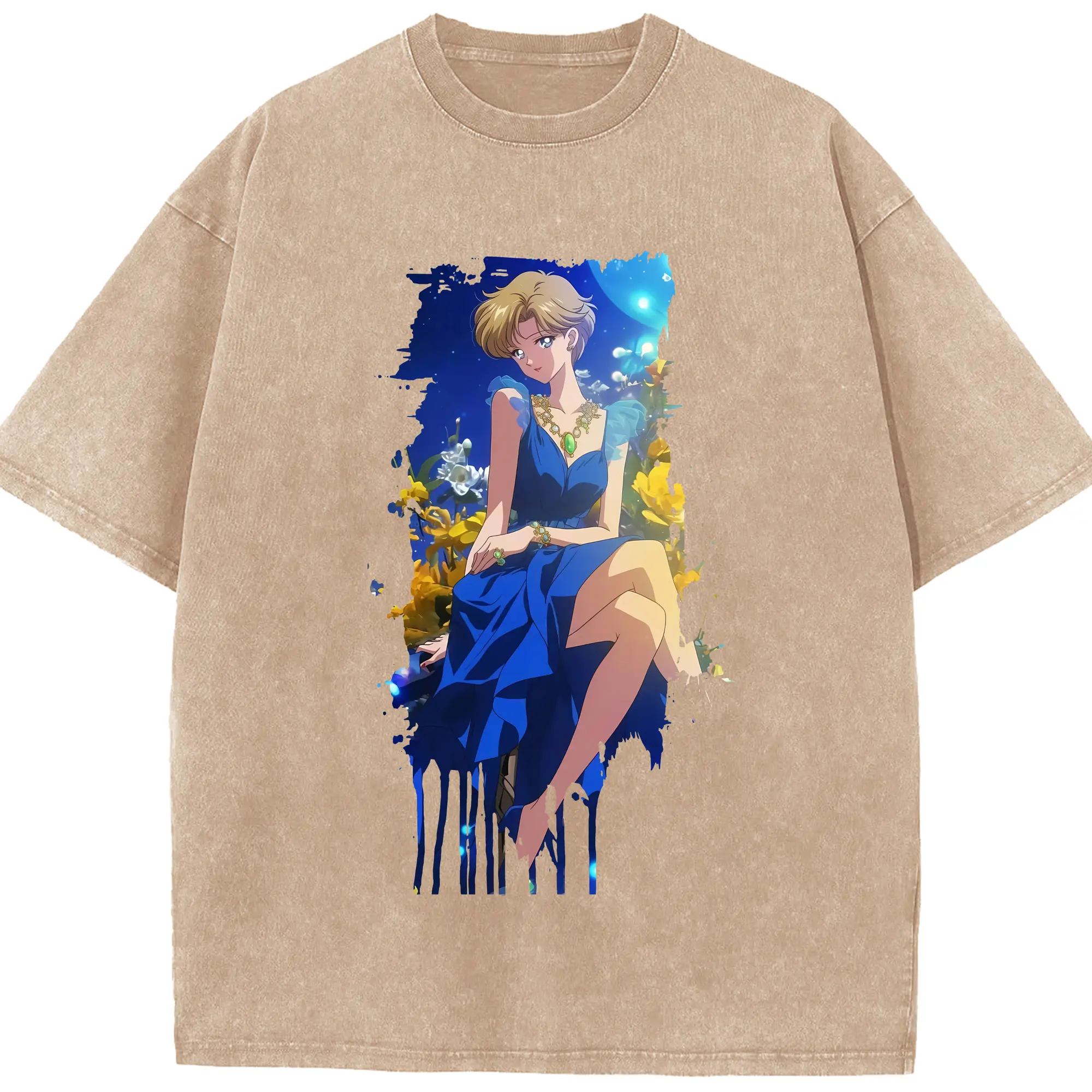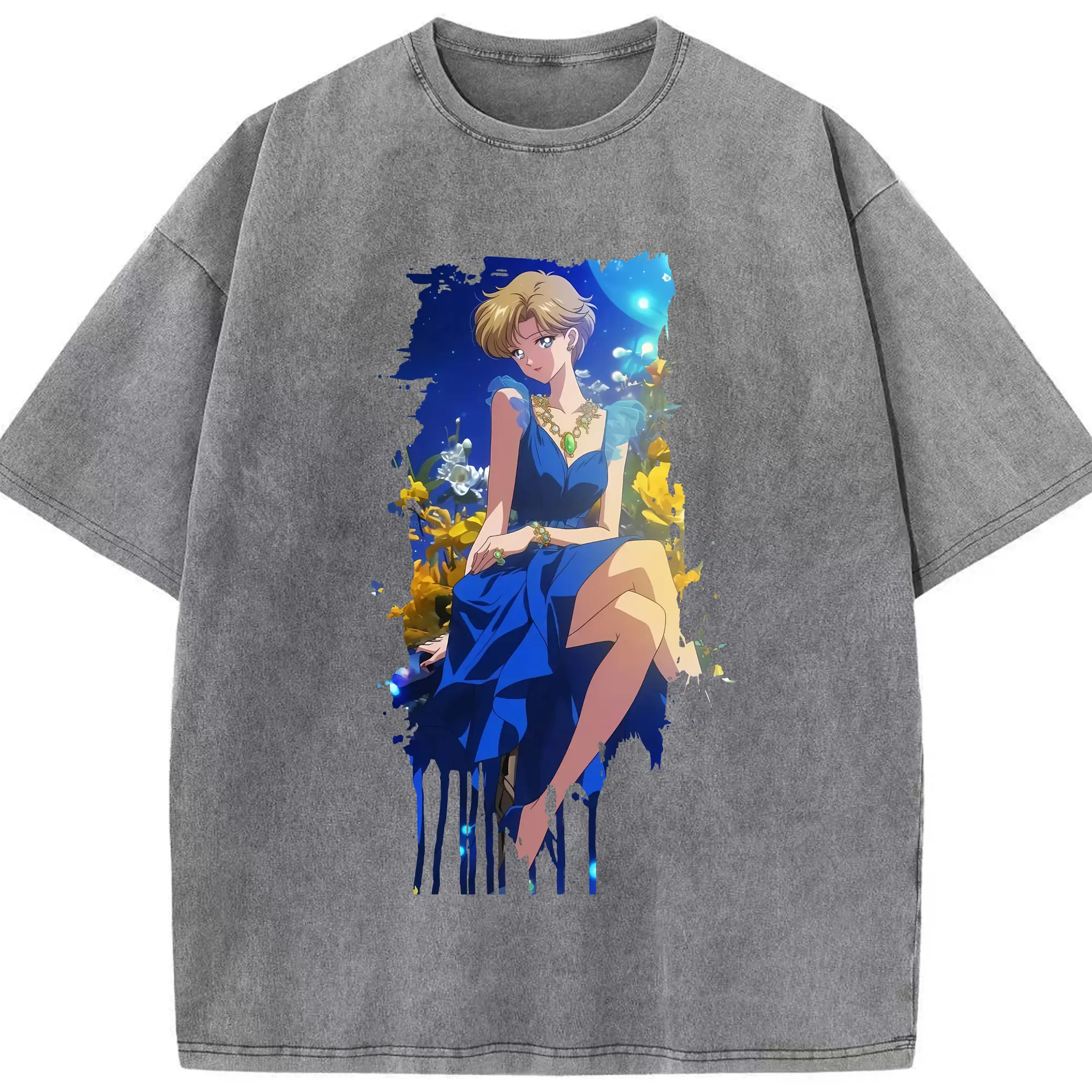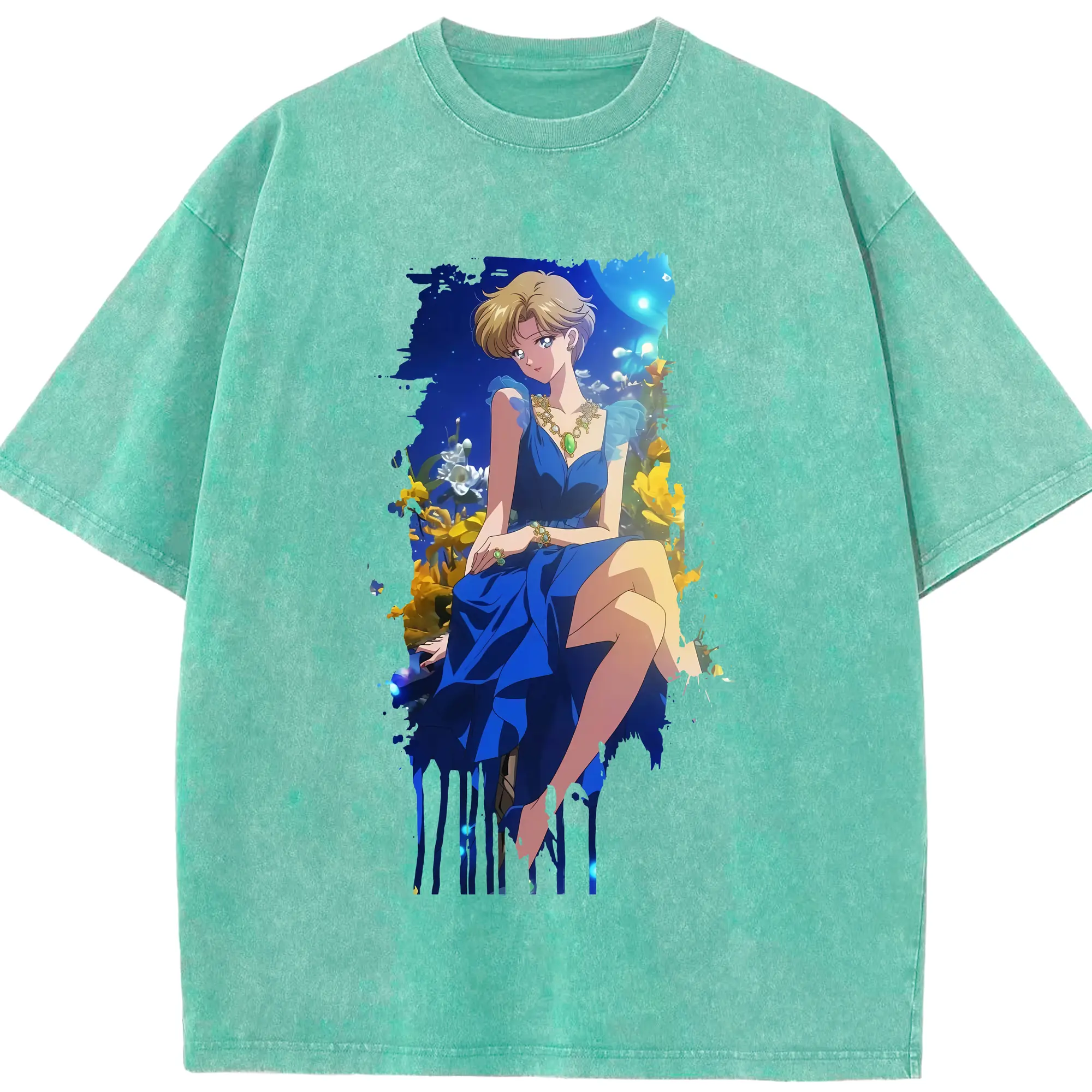 美少女戦士セーラームーン グッズ 天王 はるか - 綿100% ヴィンテージ風 半袖Tシャツ ・ 背面プリント ・ 柔らか肌触り ・ 通気性 快適 ・ スポーツ カジュアル 外出用