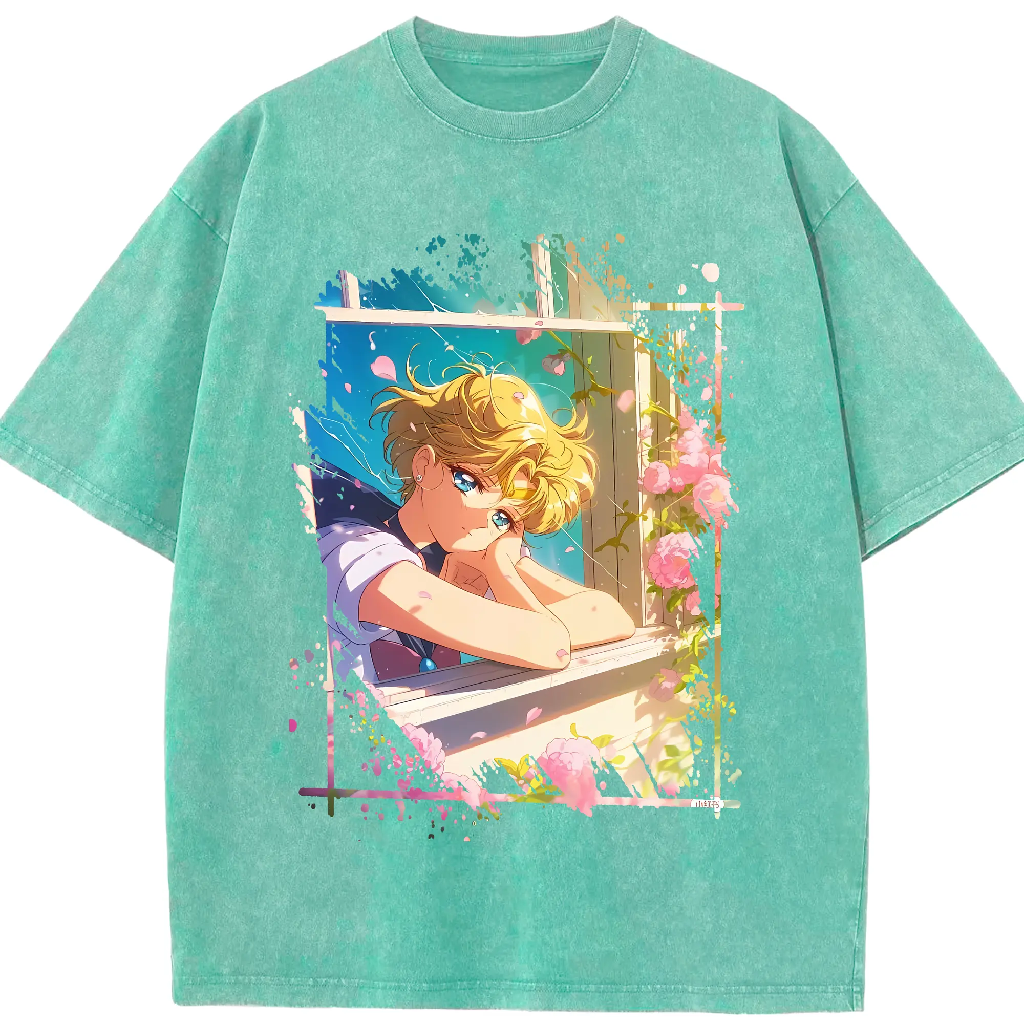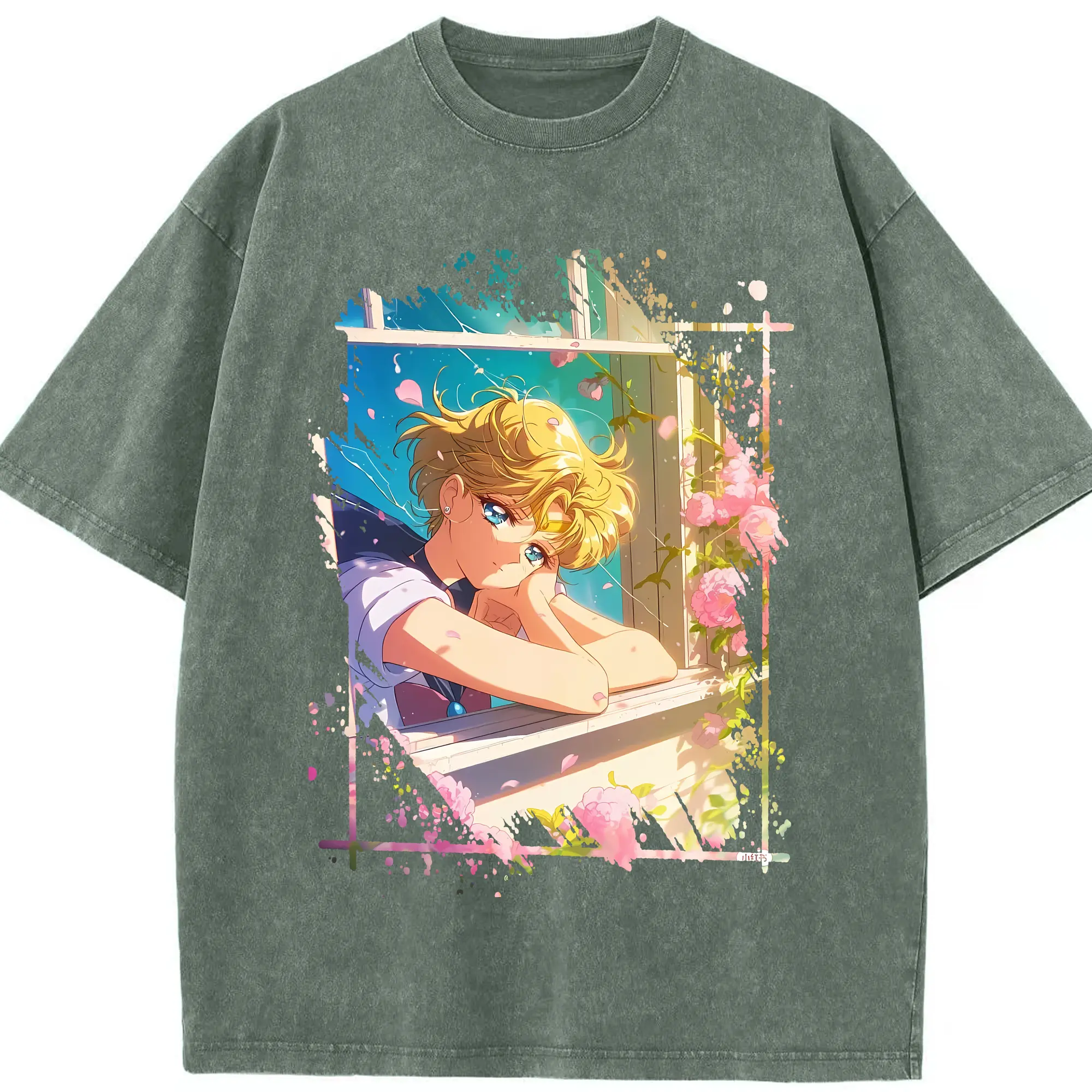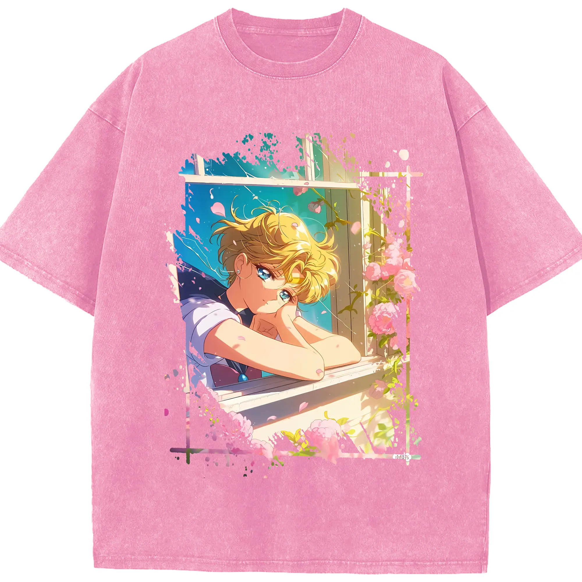 美少女戦士セーラームーン グッズ 天王 はるか - 綿100% ヴィンテージ風 半袖Tシャツ ・ 背面プリント ・ 柔らか肌触り ・ 通気性 快適 ・ スポーツ カジュアル 外出用