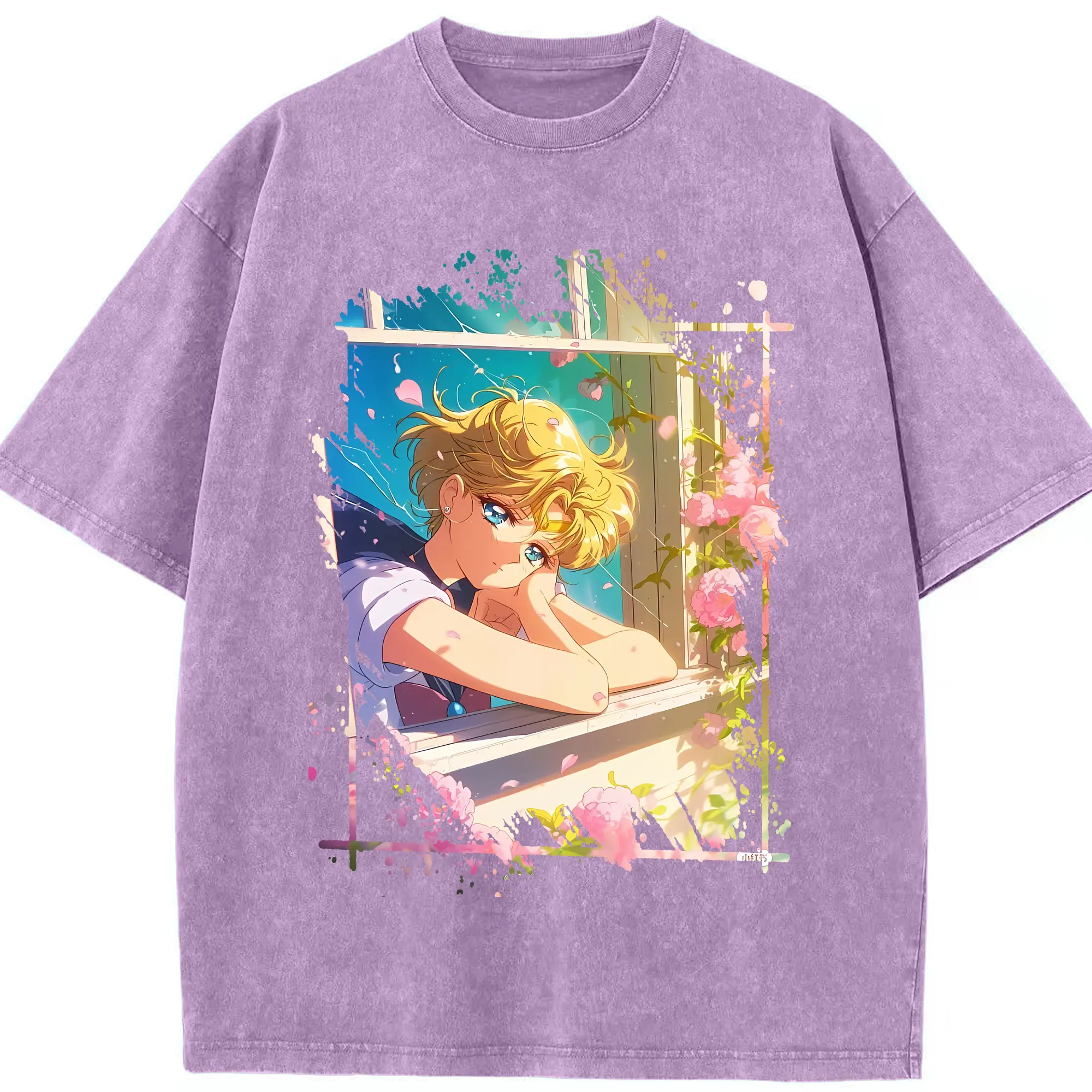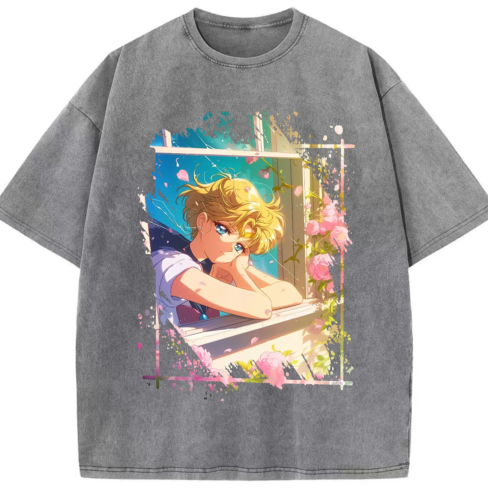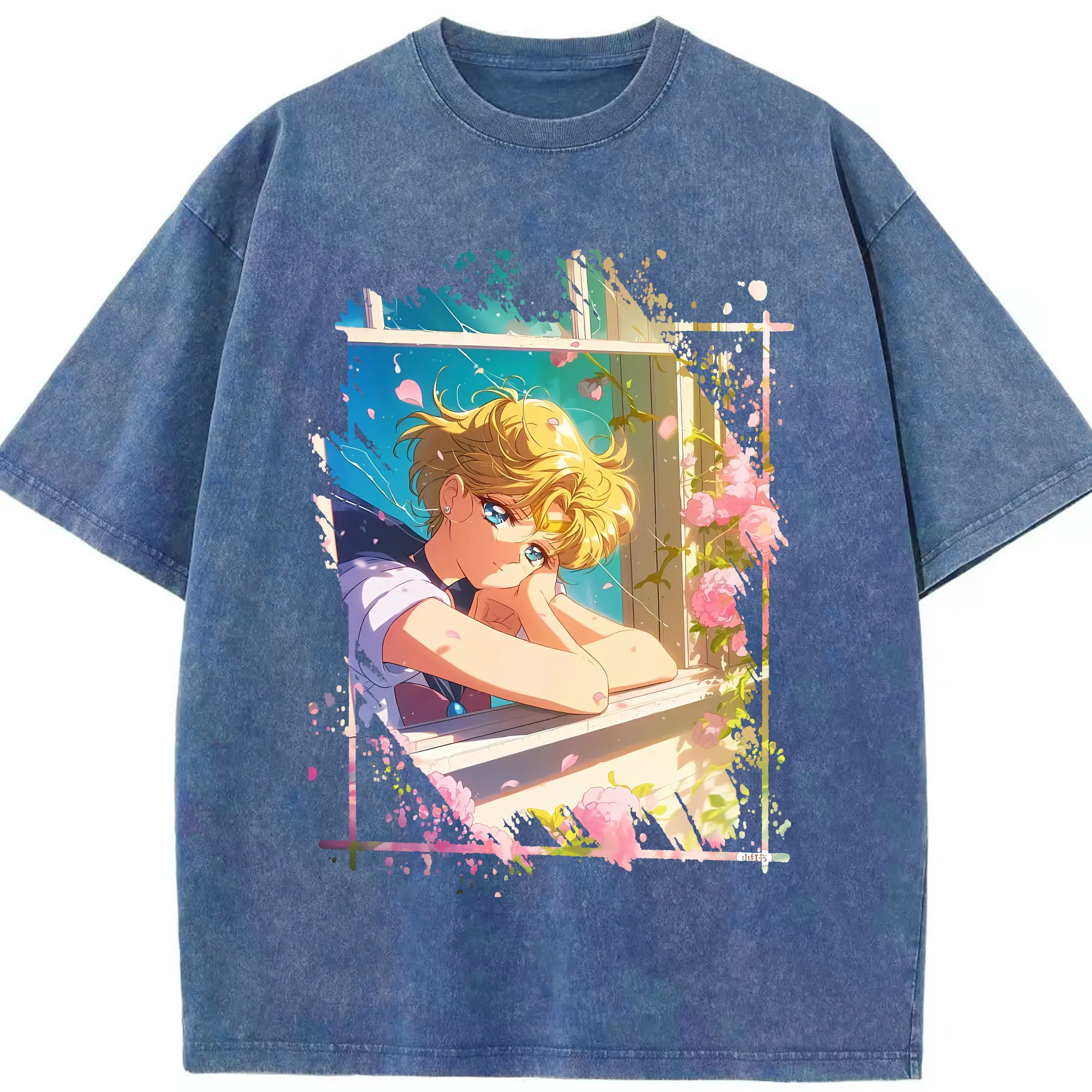 美少女戦士セーラームーン グッズ 天王 はるか - 綿100% ヴィンテージ風 半袖Tシャツ ・ 背面プリント ・ 柔らか肌触り ・ 通気性 快適 ・ スポーツ カジュアル 外出用