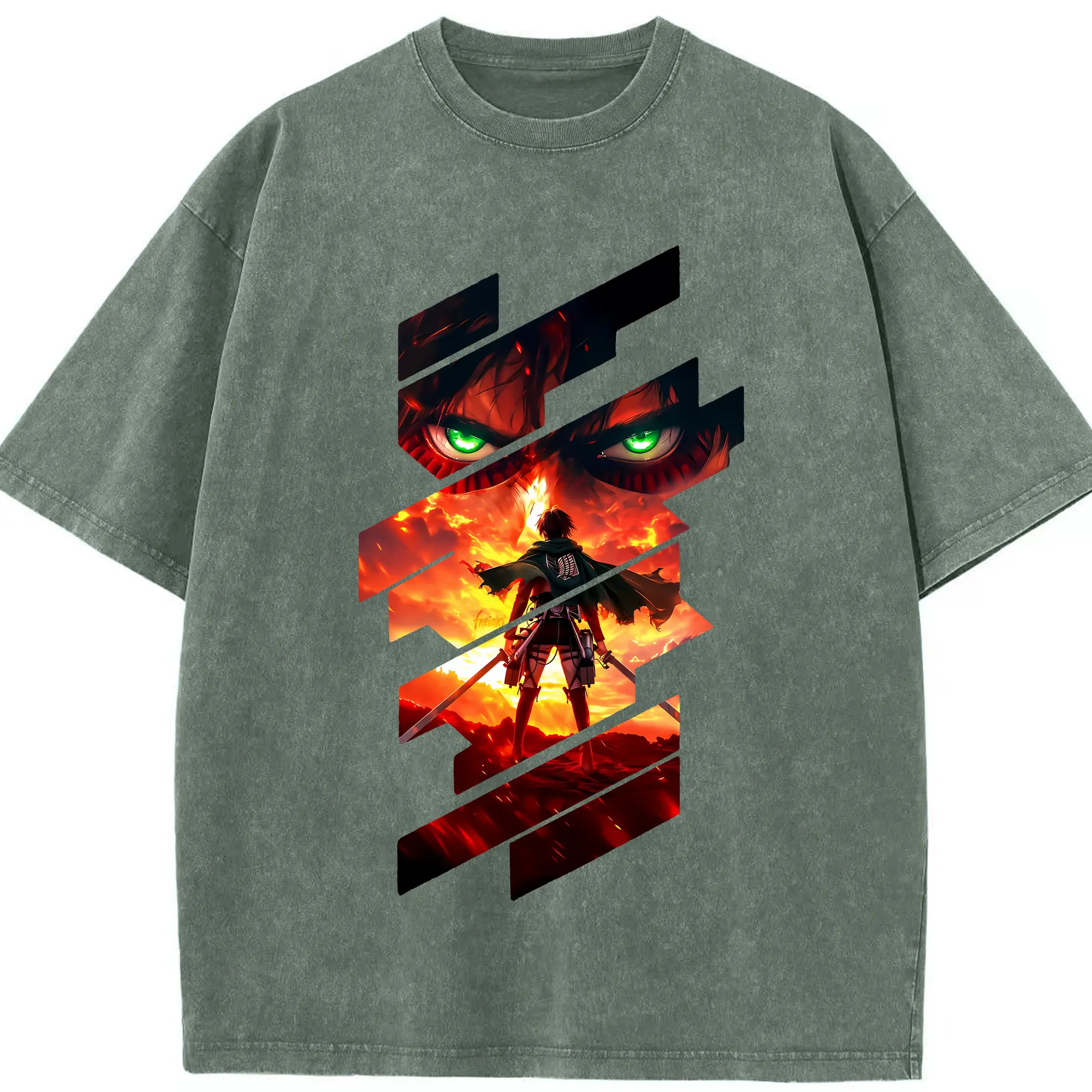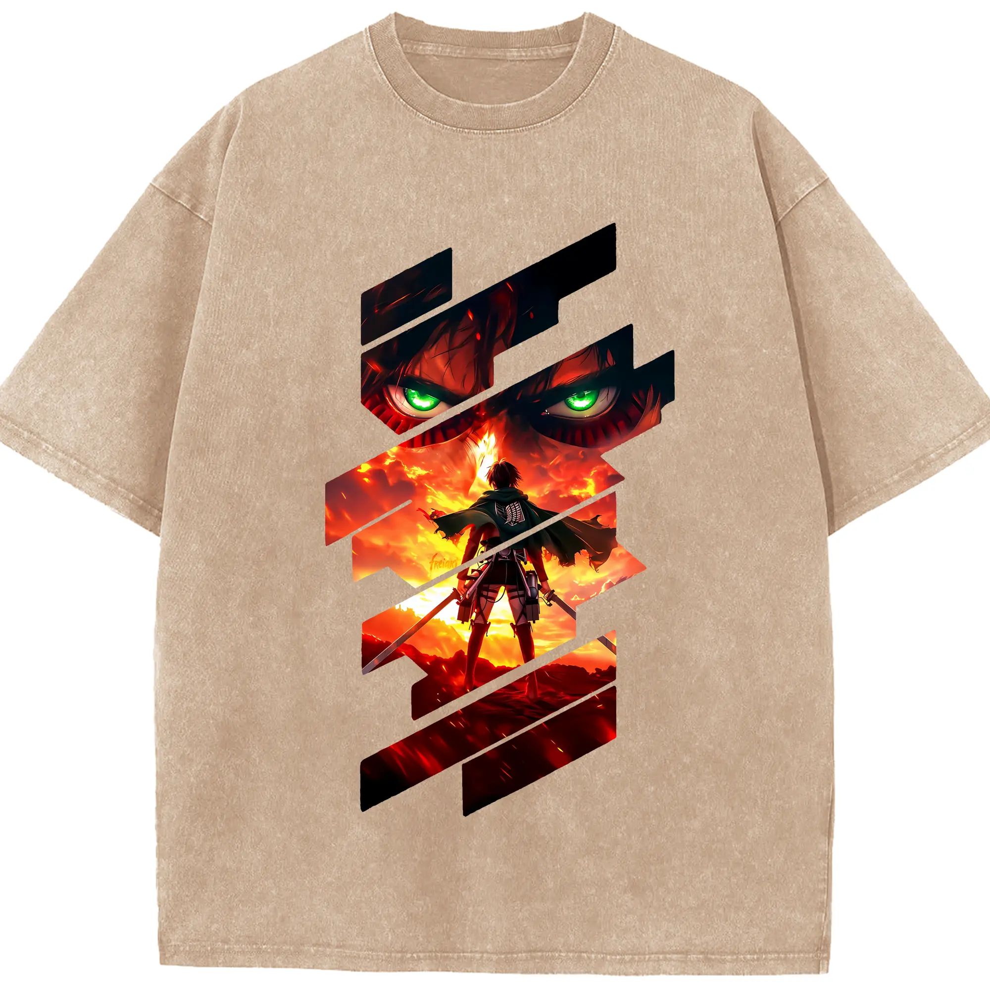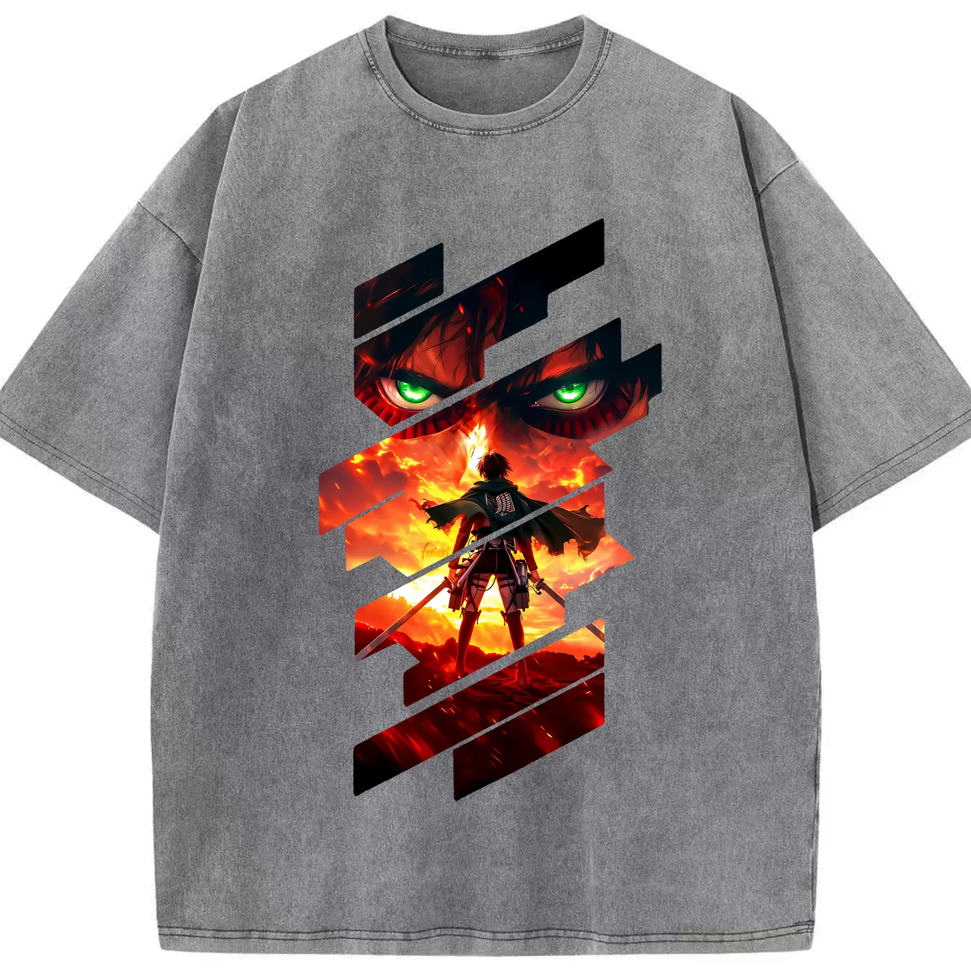 進撃の巨人 グッズ エレン・イェーガー - 綿100% ヴィンテージ風 半袖Tシャツ ・ 背面プリント ・ 柔らか肌触り ・ 通気性 快適 ・ スポーツ カジュアル 外出用