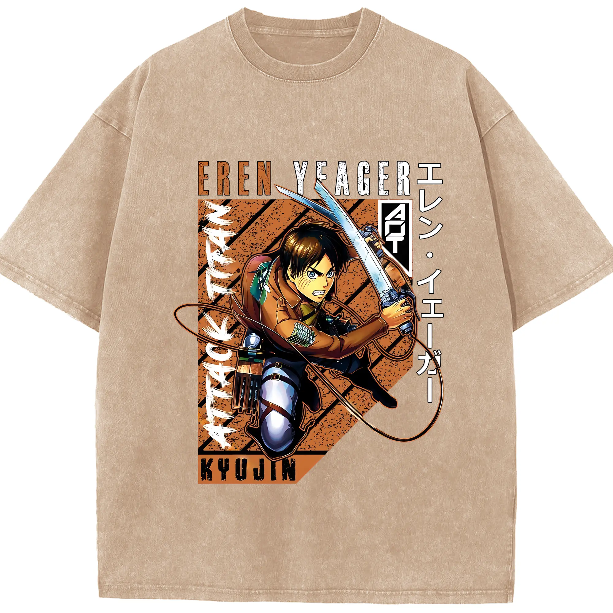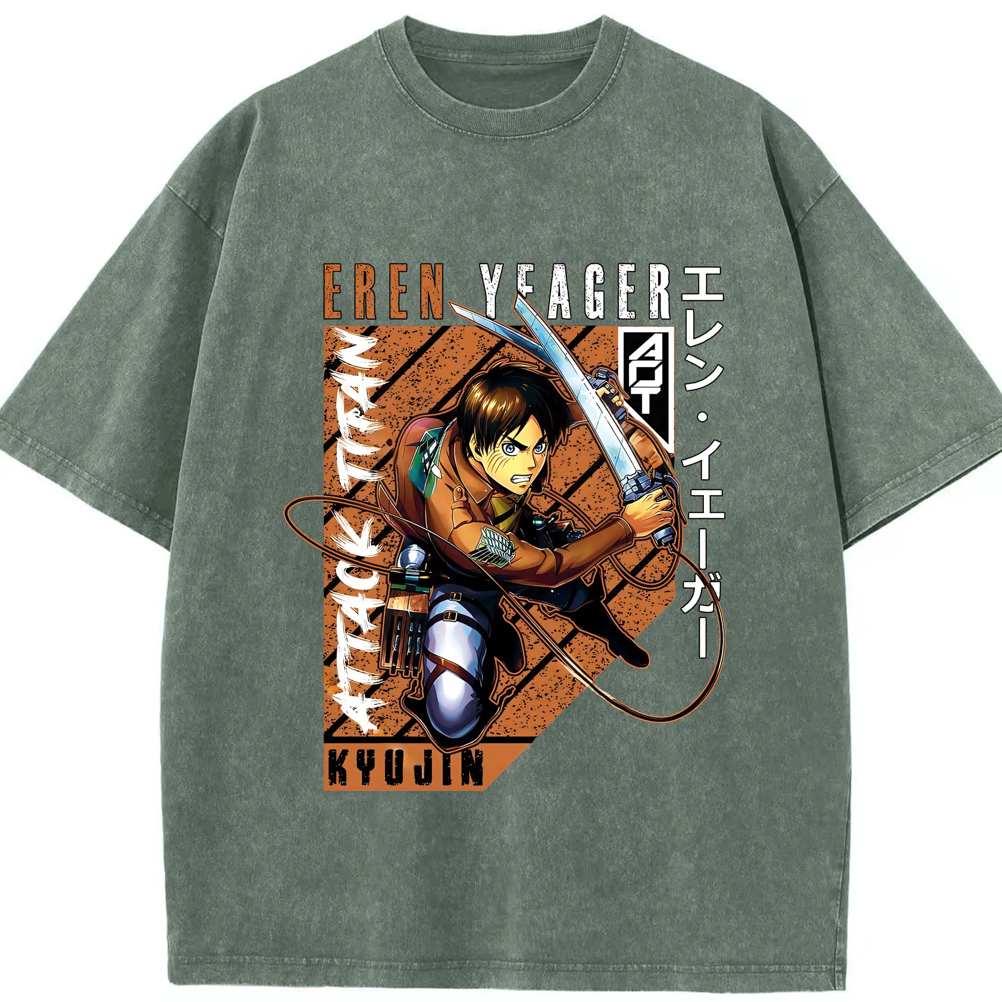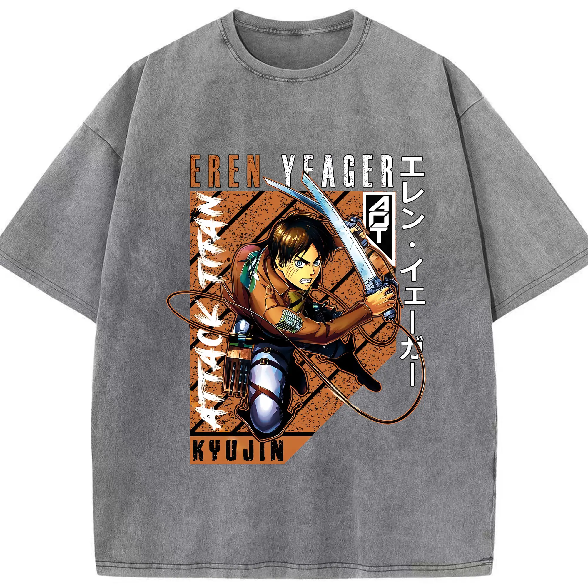 進撃の巨人 グッズ エレン・イェーガー - 綿100% ヴィンテージ風 半袖Tシャツ ・ 背面プリント ・ 柔らか肌触り ・ 通気性 快適 ・ スポーツ カジュアル 外出用