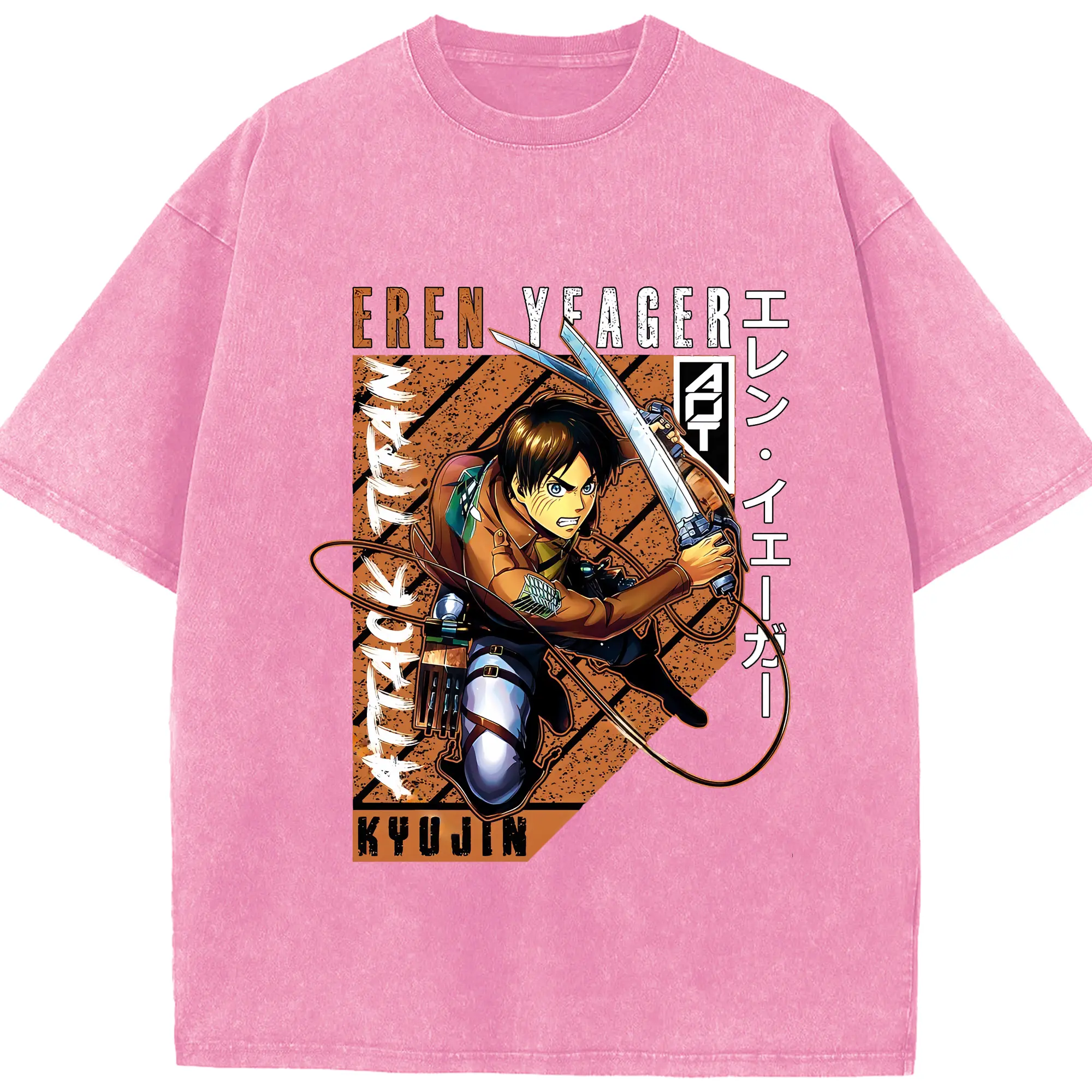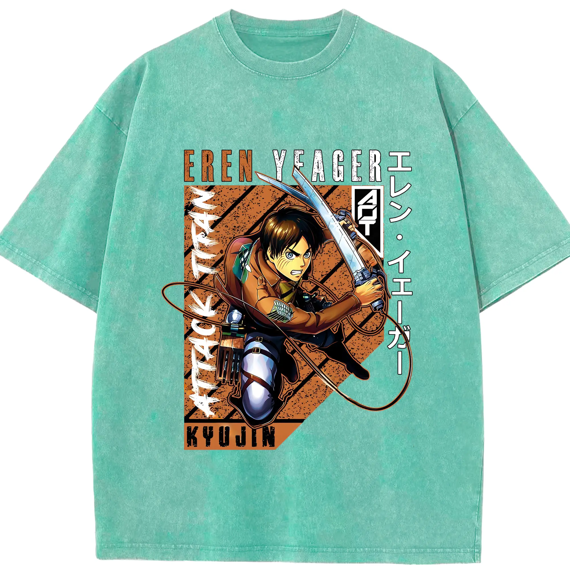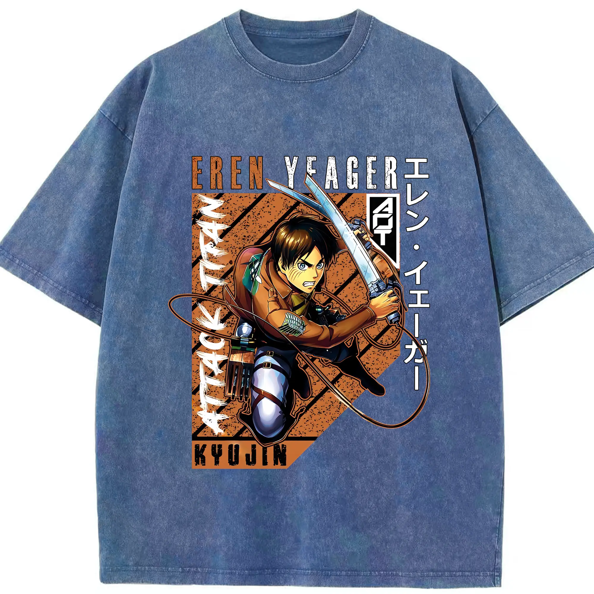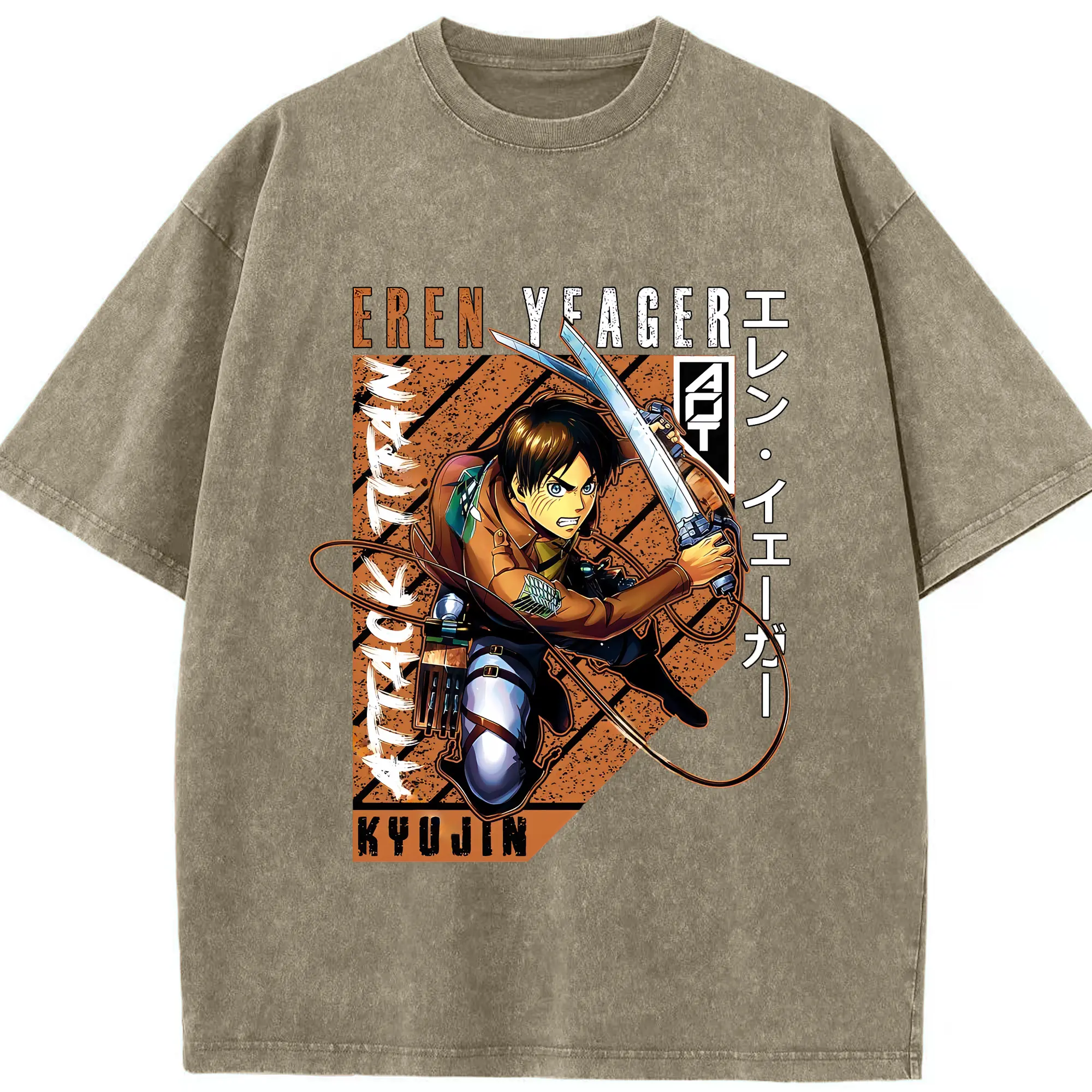 進撃の巨人 グッズ エレン・イェーガー - 綿100% ヴィンテージ風 半袖Tシャツ ・ 背面プリント ・ 柔らか肌触り ・ 通気性 快適 ・ スポーツ カジュアル 外出用