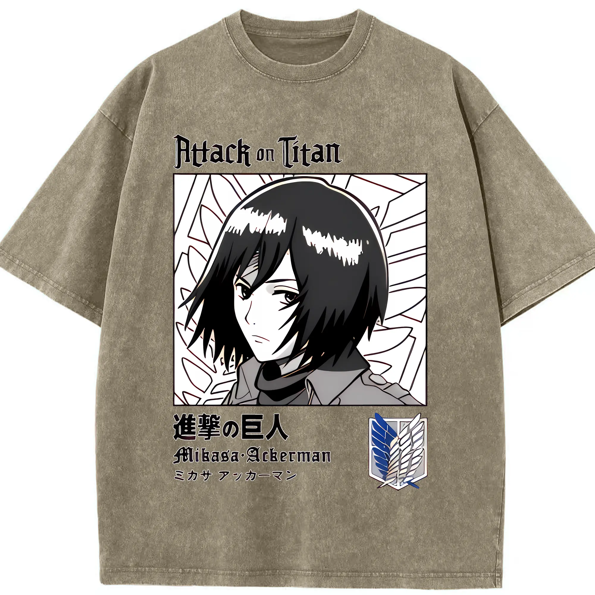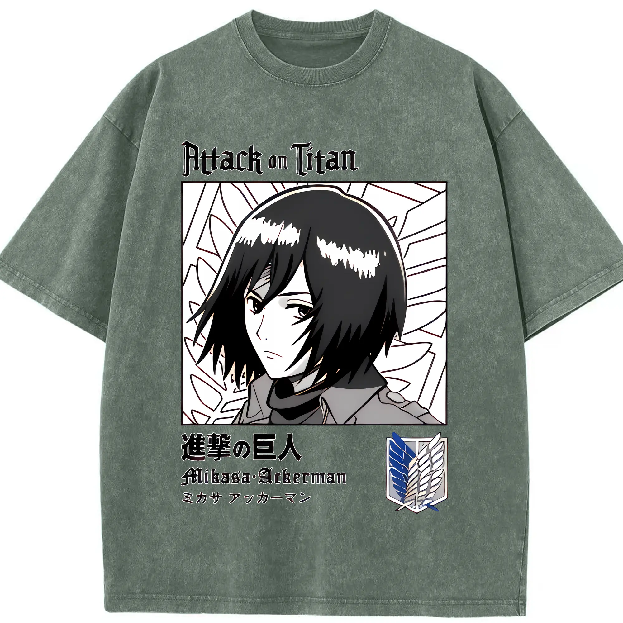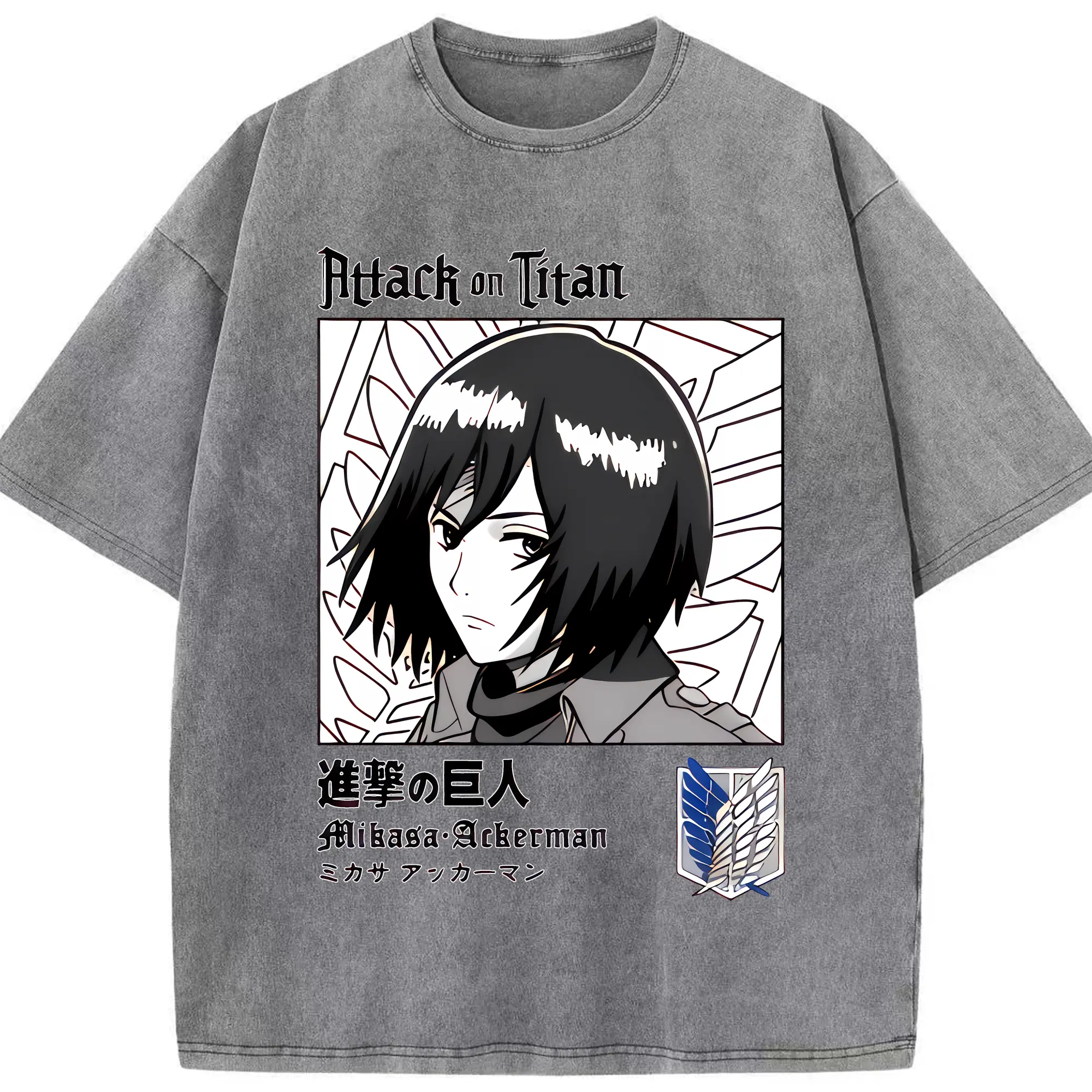 進撃の巨人 グッズ ミカサ・アッカーマン - 綿100% ヴィンテージ風 半袖Tシャツ ・ 背面プリント ・ 柔らか肌触り ・ 通気性 快適 ・ スポーツ カジュアル 外出用