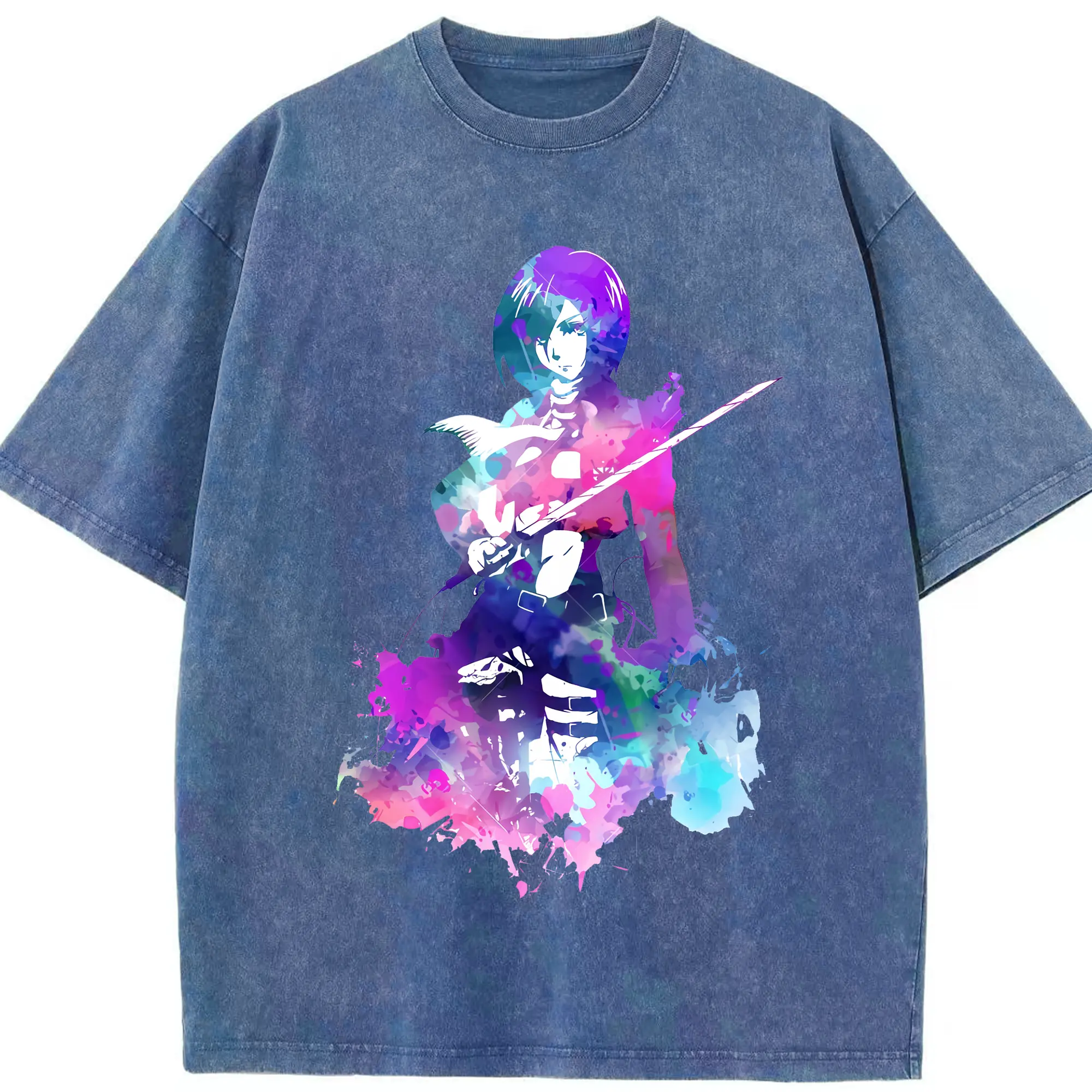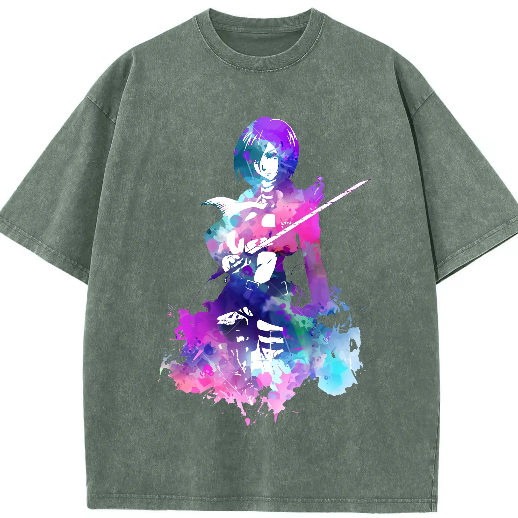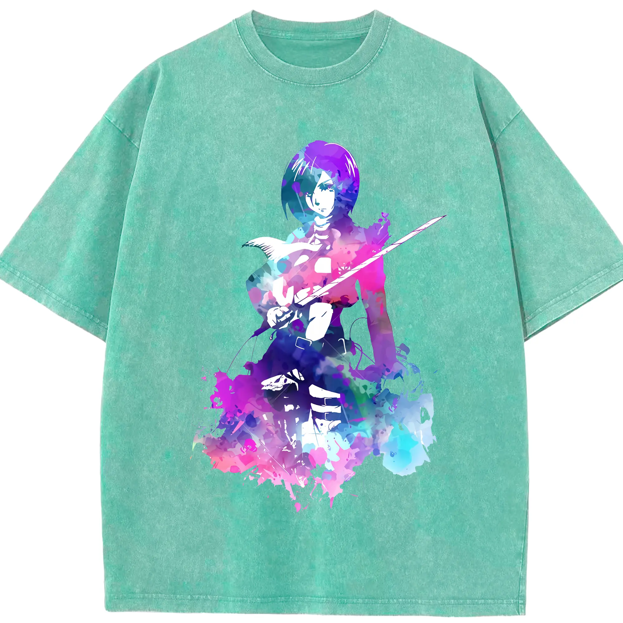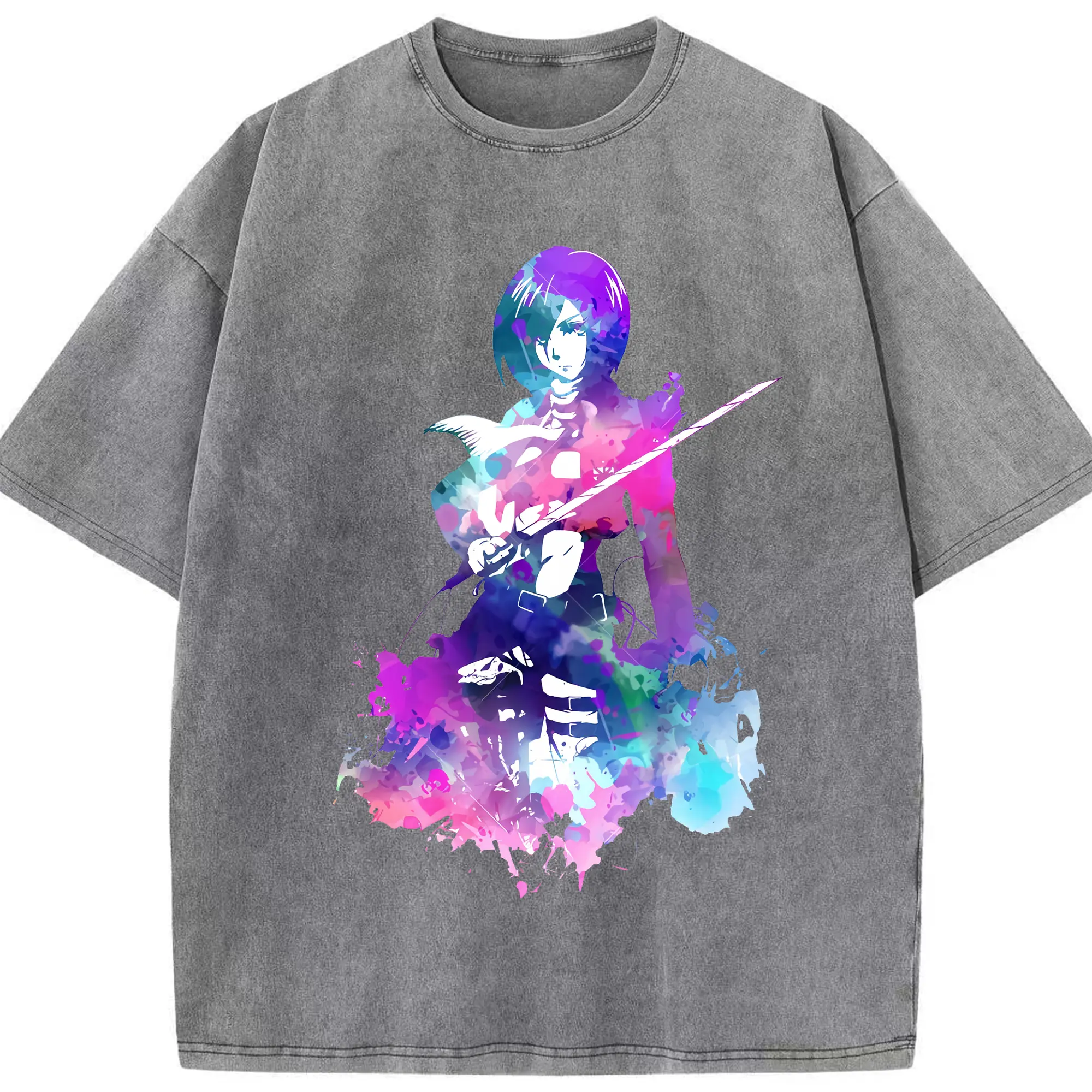 進撃の巨人 グッズ ミカサ・アッカーマン - 綿100% ヴィンテージ風 半袖Tシャツ ・ 背面プリント ・ 柔らか肌触り ・ 通気性 快適 ・ スポーツ カジュアル 外出用