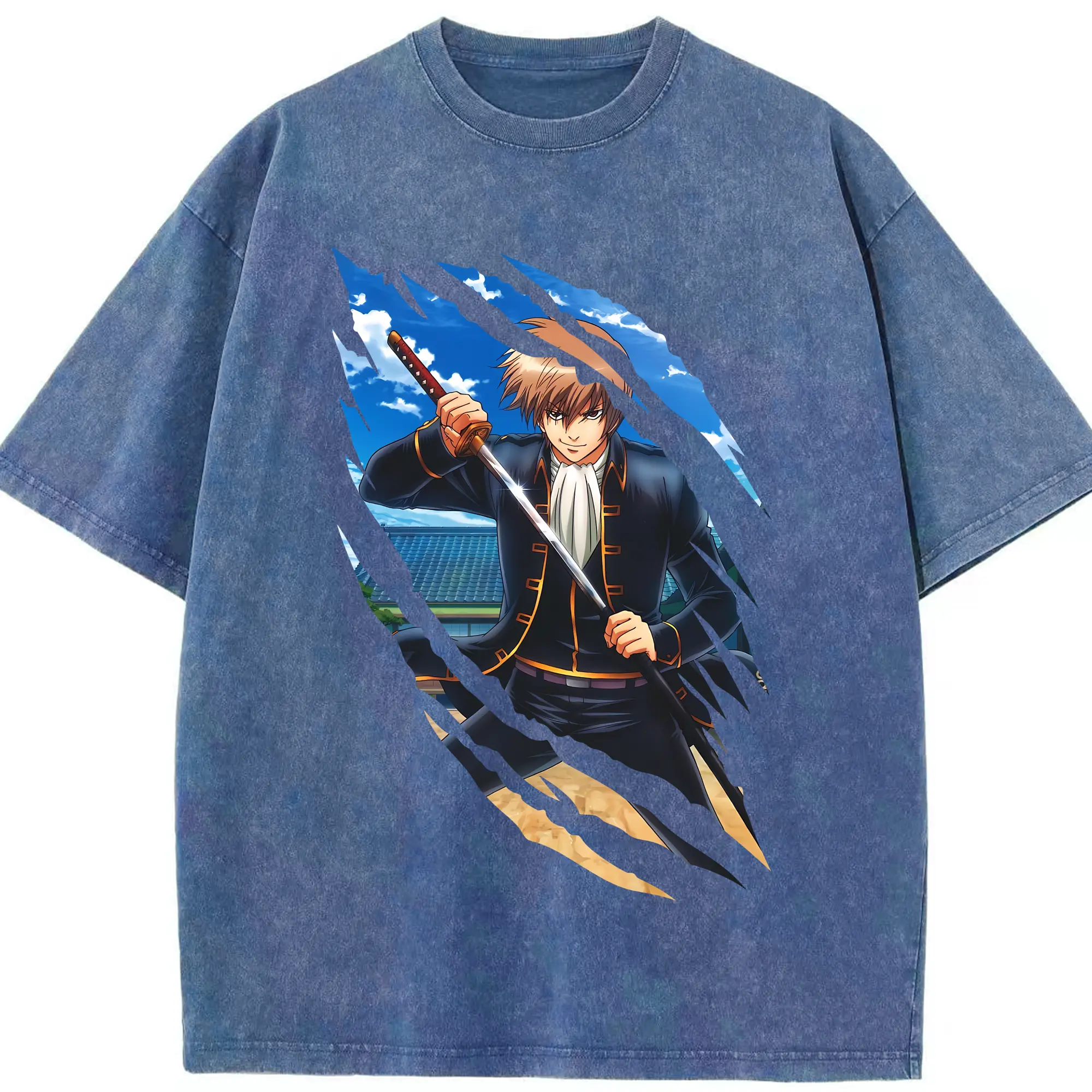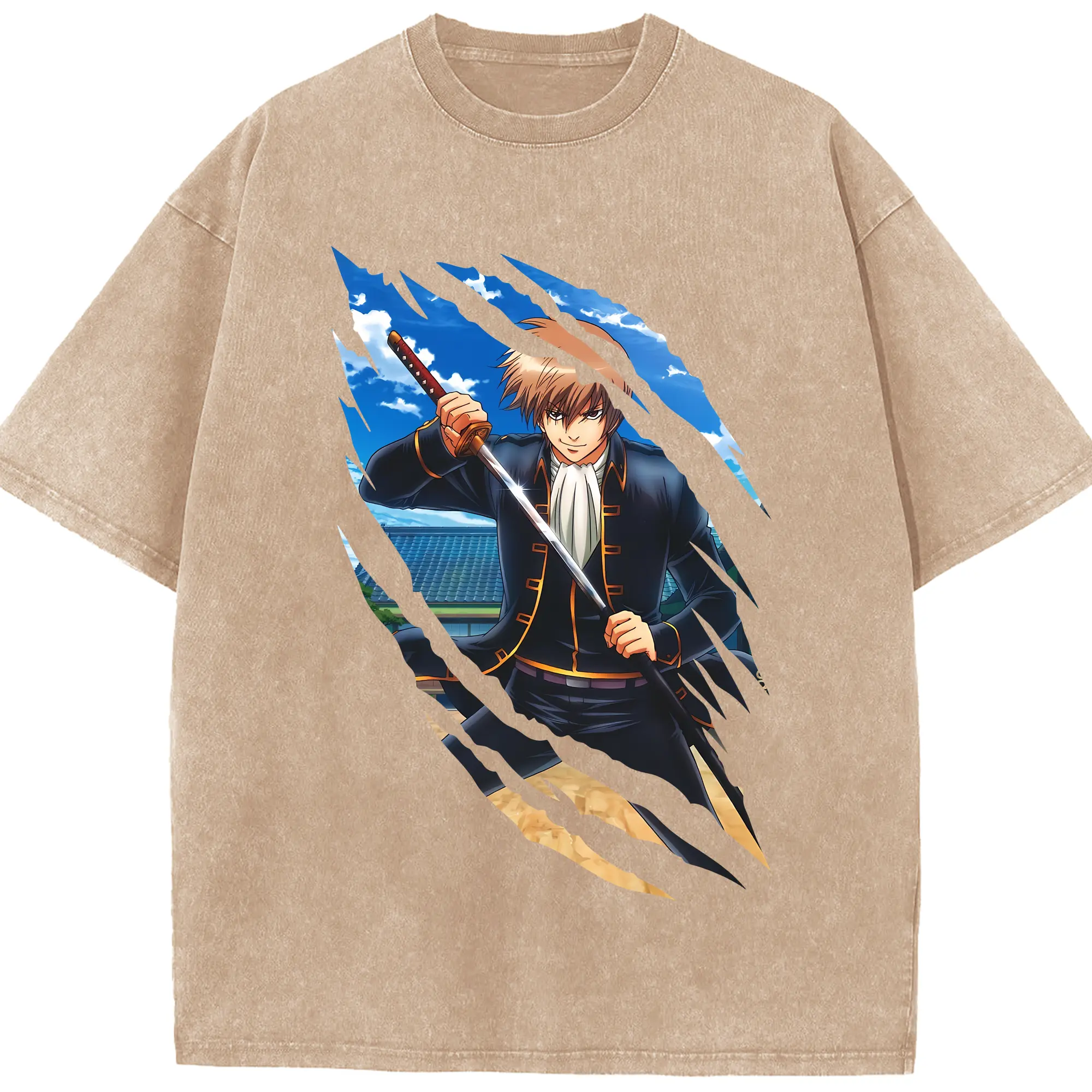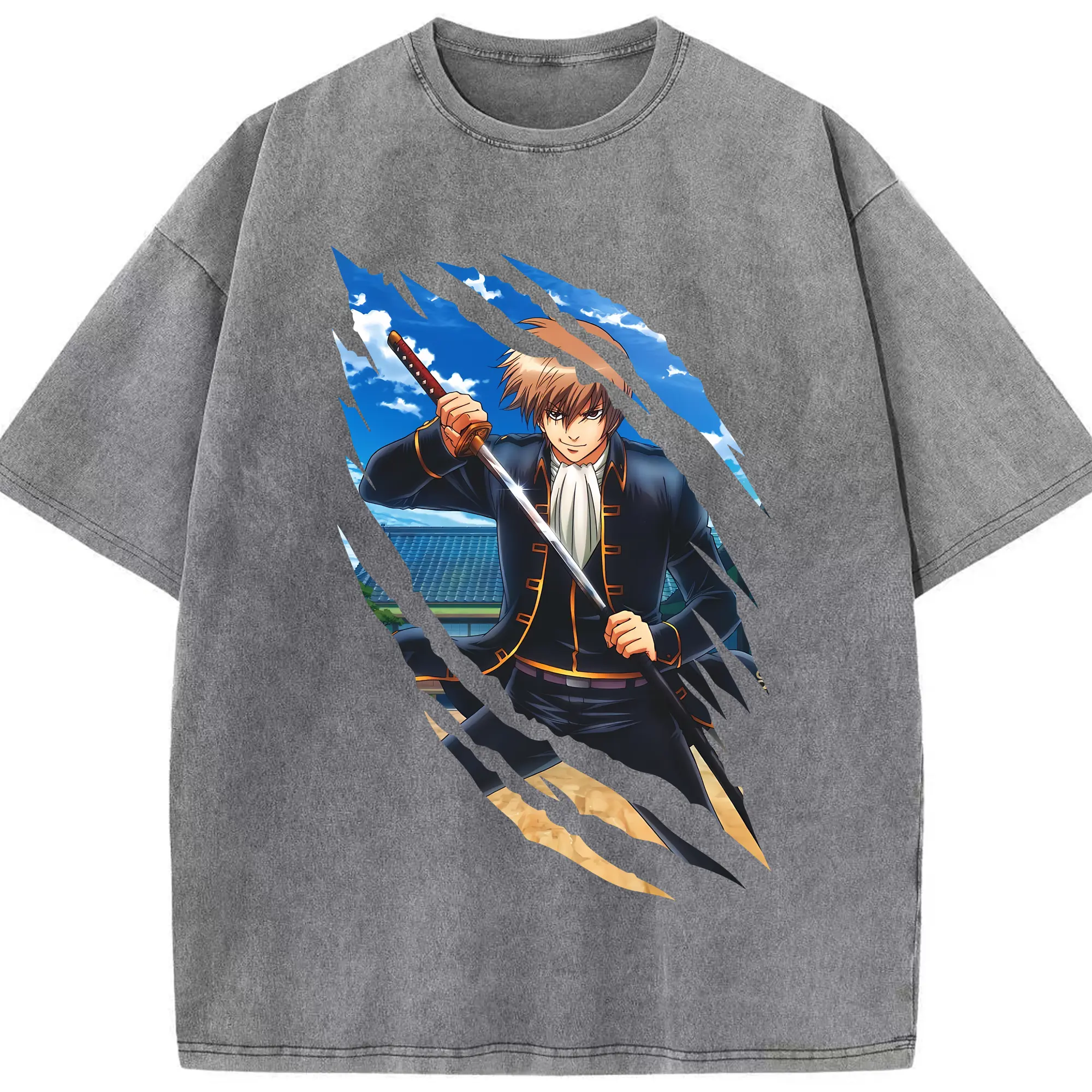 銀魂 グッズ 沖田 総悟 - 綿100% ヴィンテージ風 半袖Tシャツ ・ 背面プリント ・ 柔らか肌触り ・ 通気性 快適 ・ スポーツ カジュアル 外出用