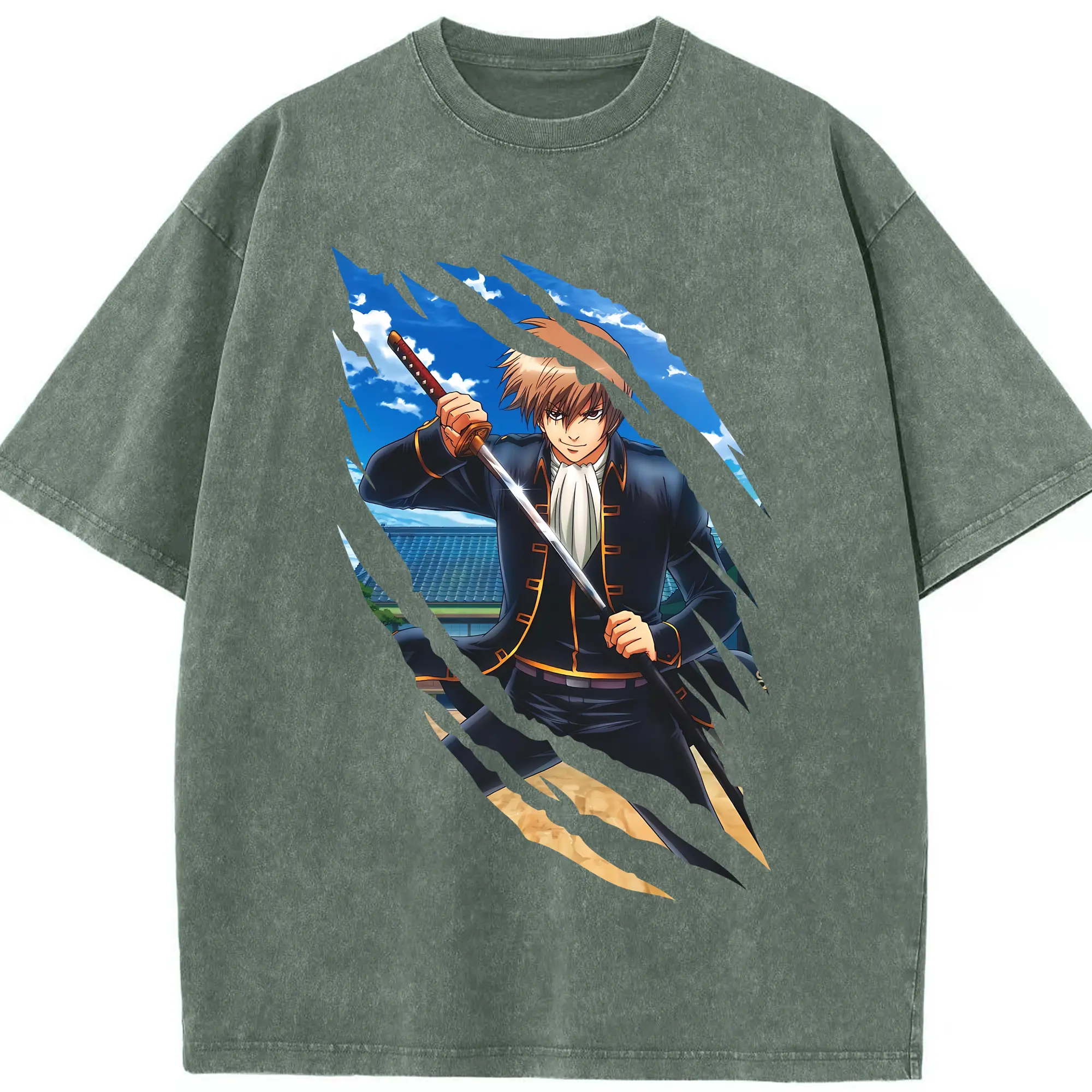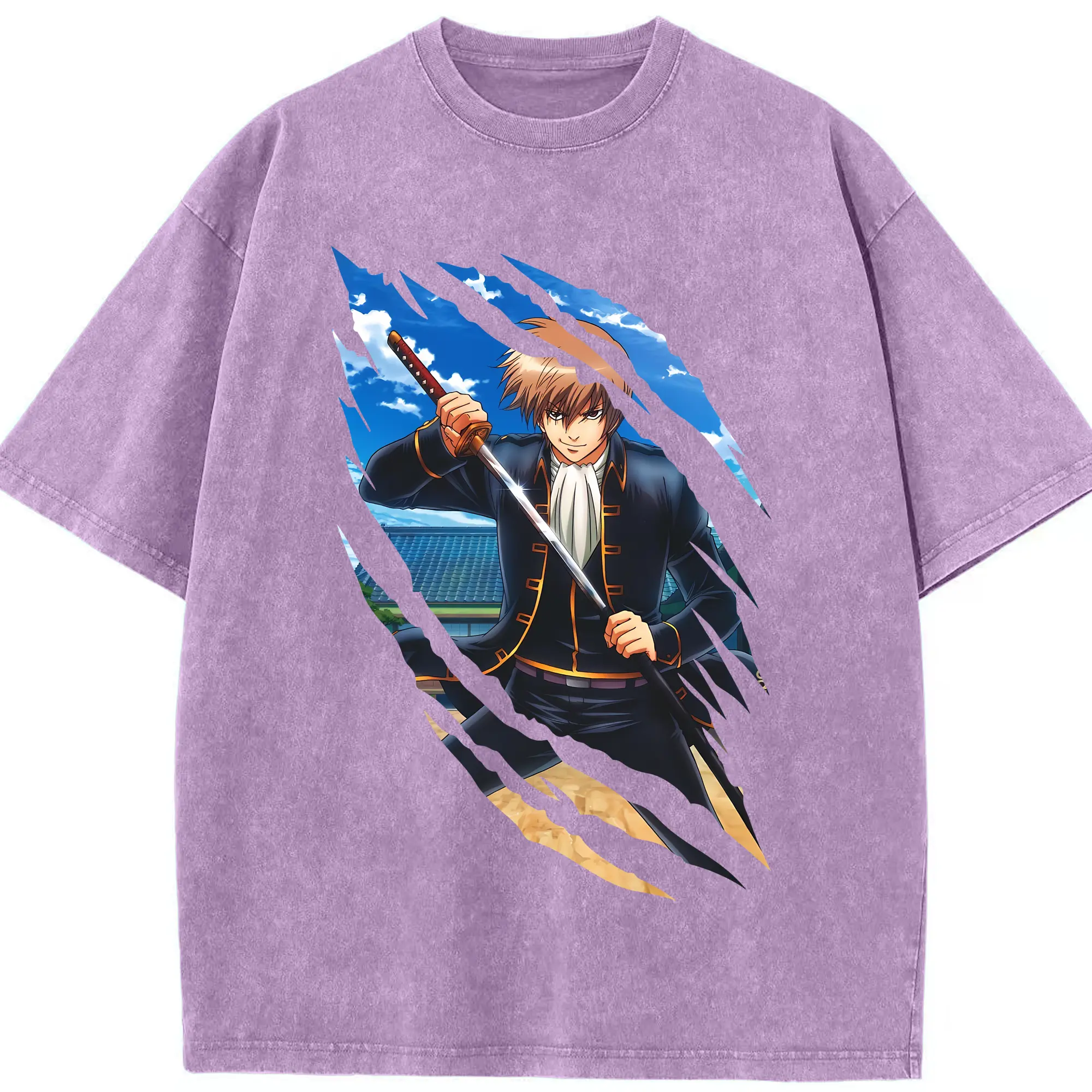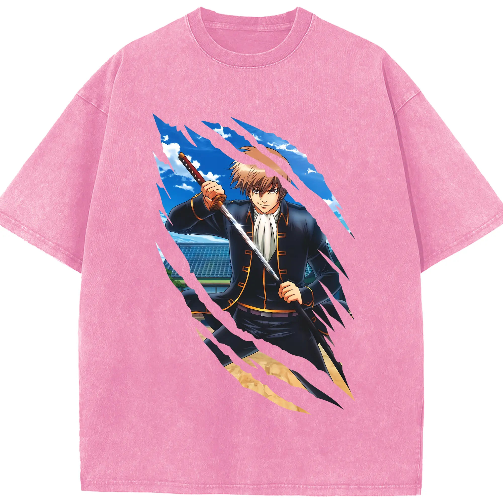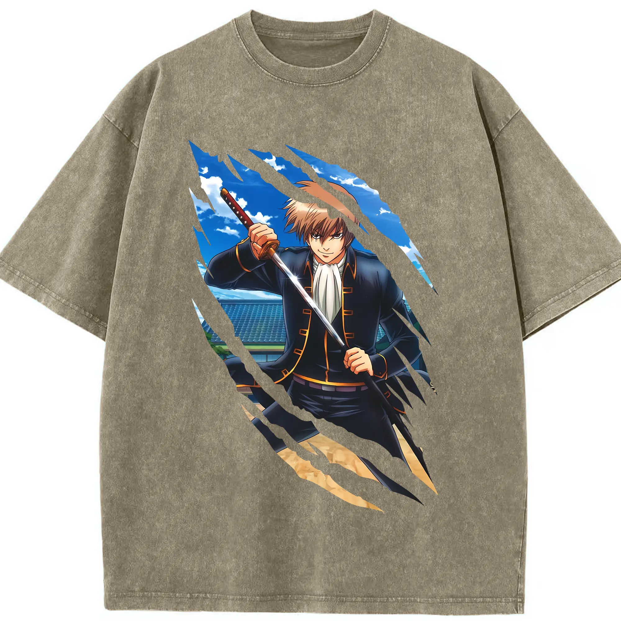 銀魂 グッズ 沖田 総悟 - 綿100% ヴィンテージ風 半袖Tシャツ ・ 背面プリント ・ 柔らか肌触り ・ 通気性 快適 ・ スポーツ カジュアル 外出用