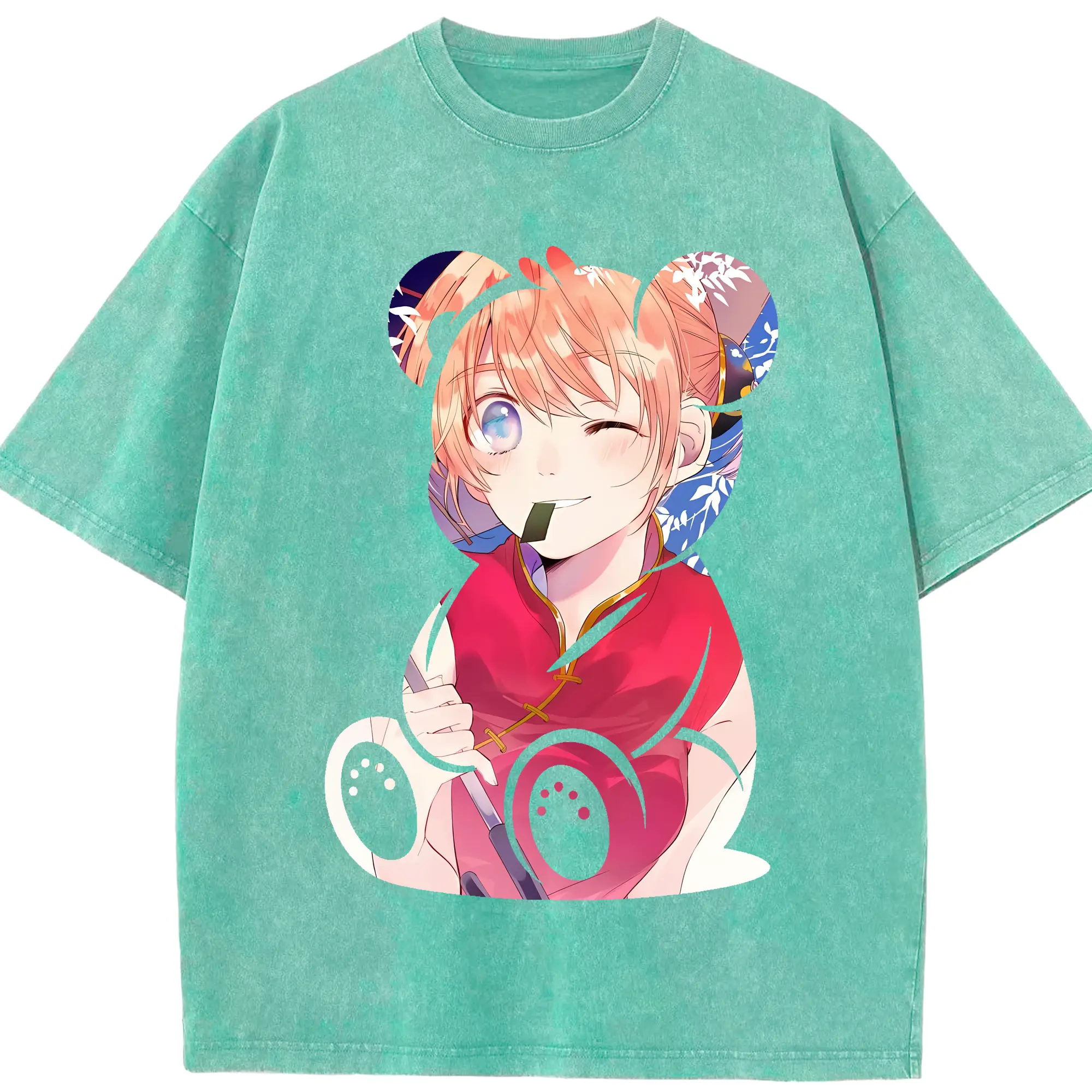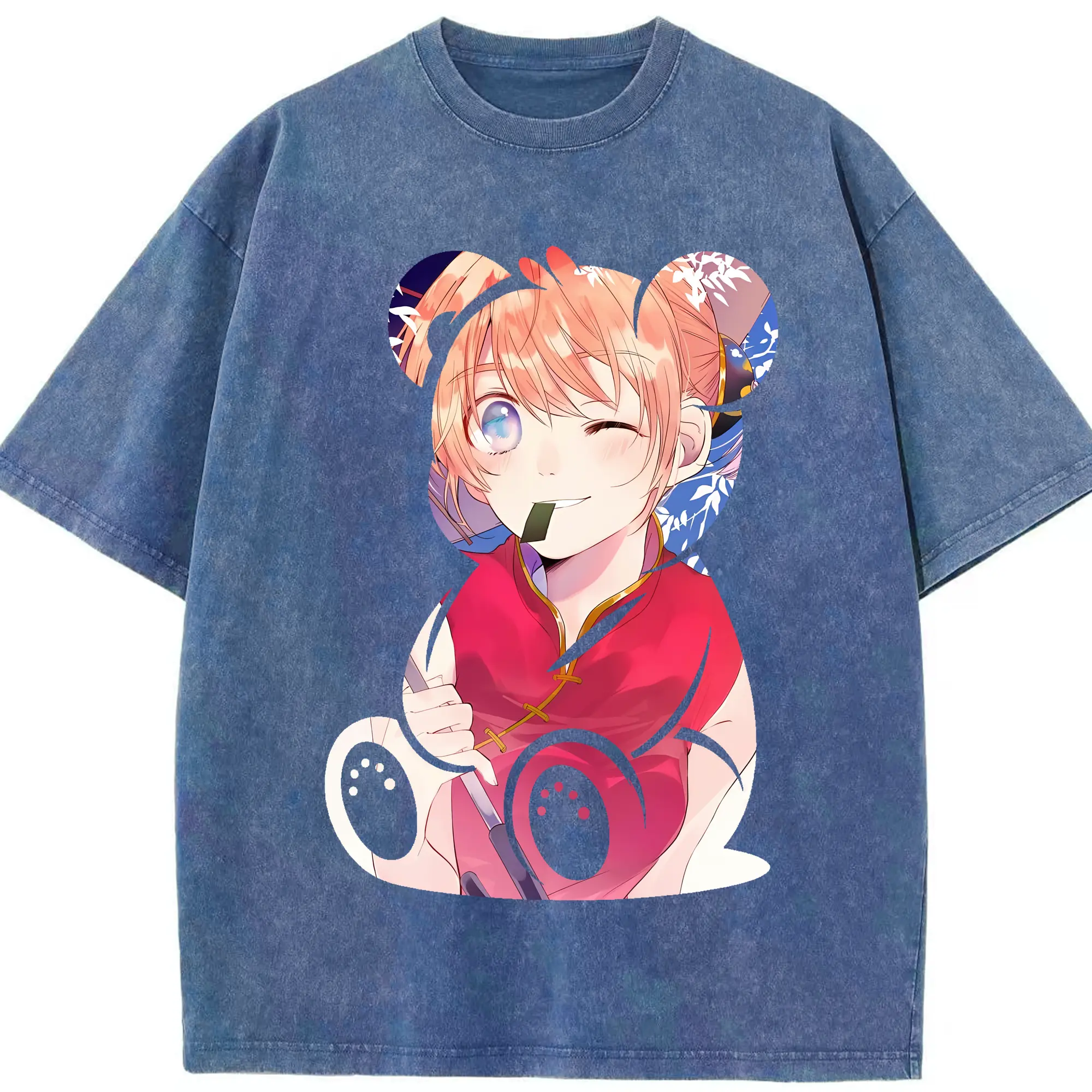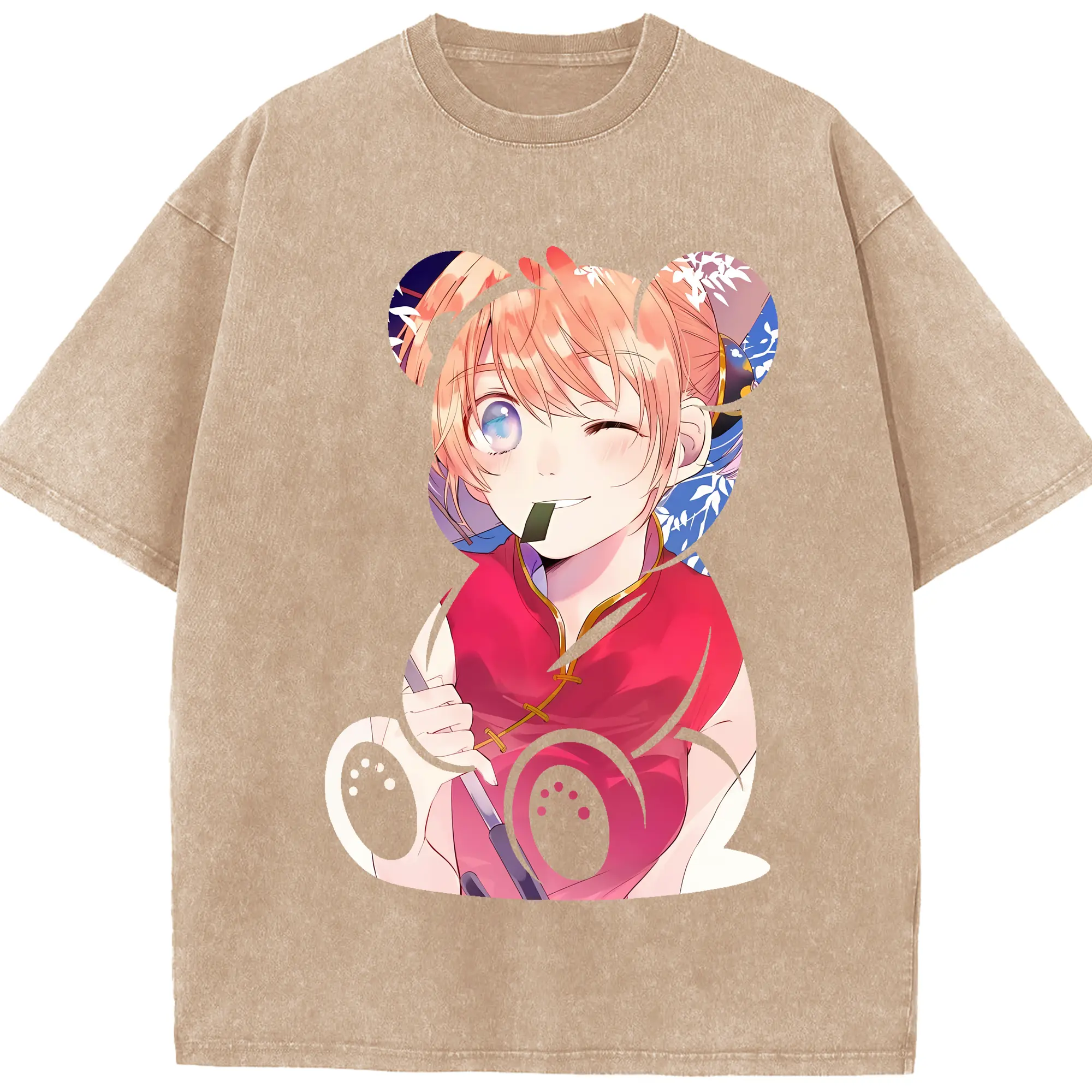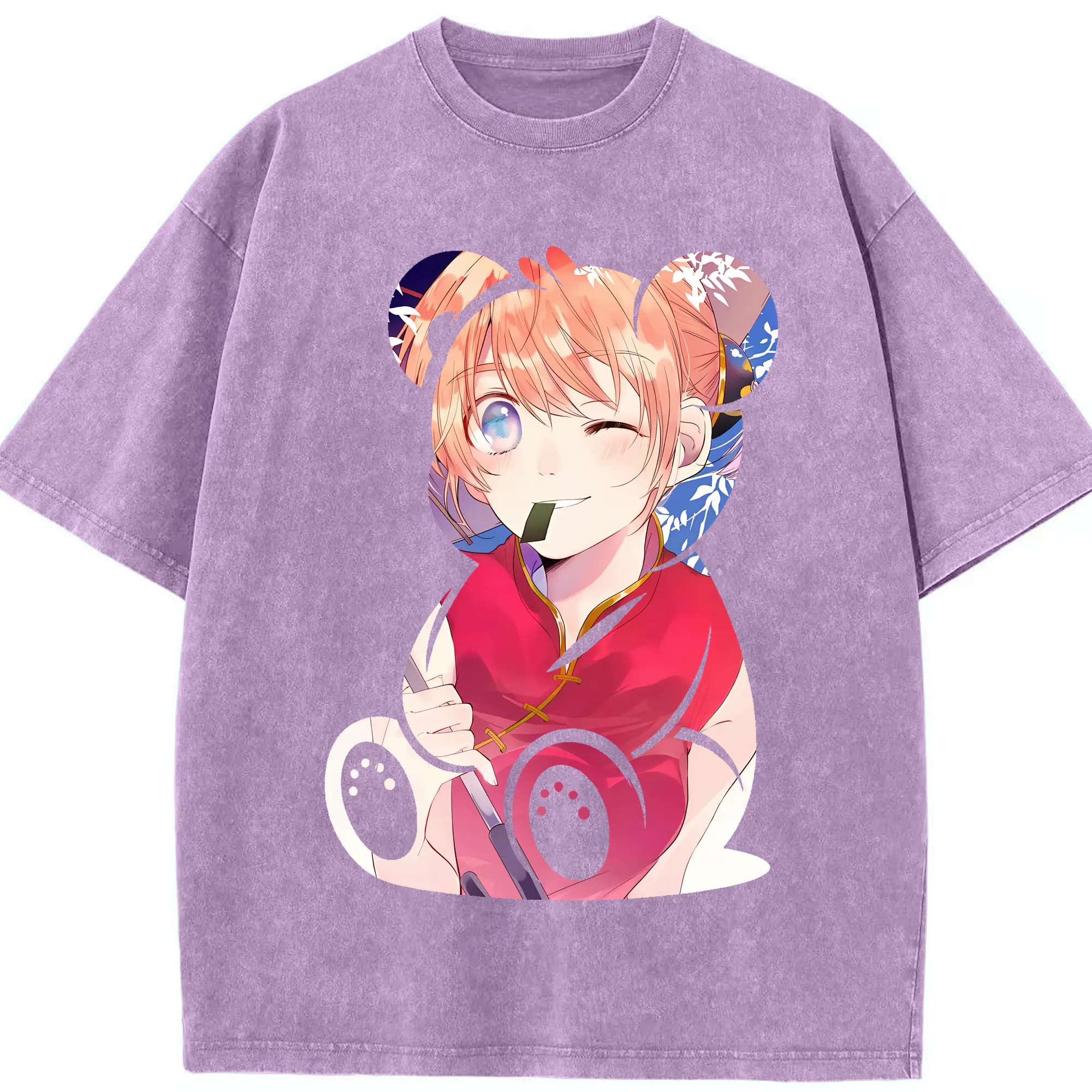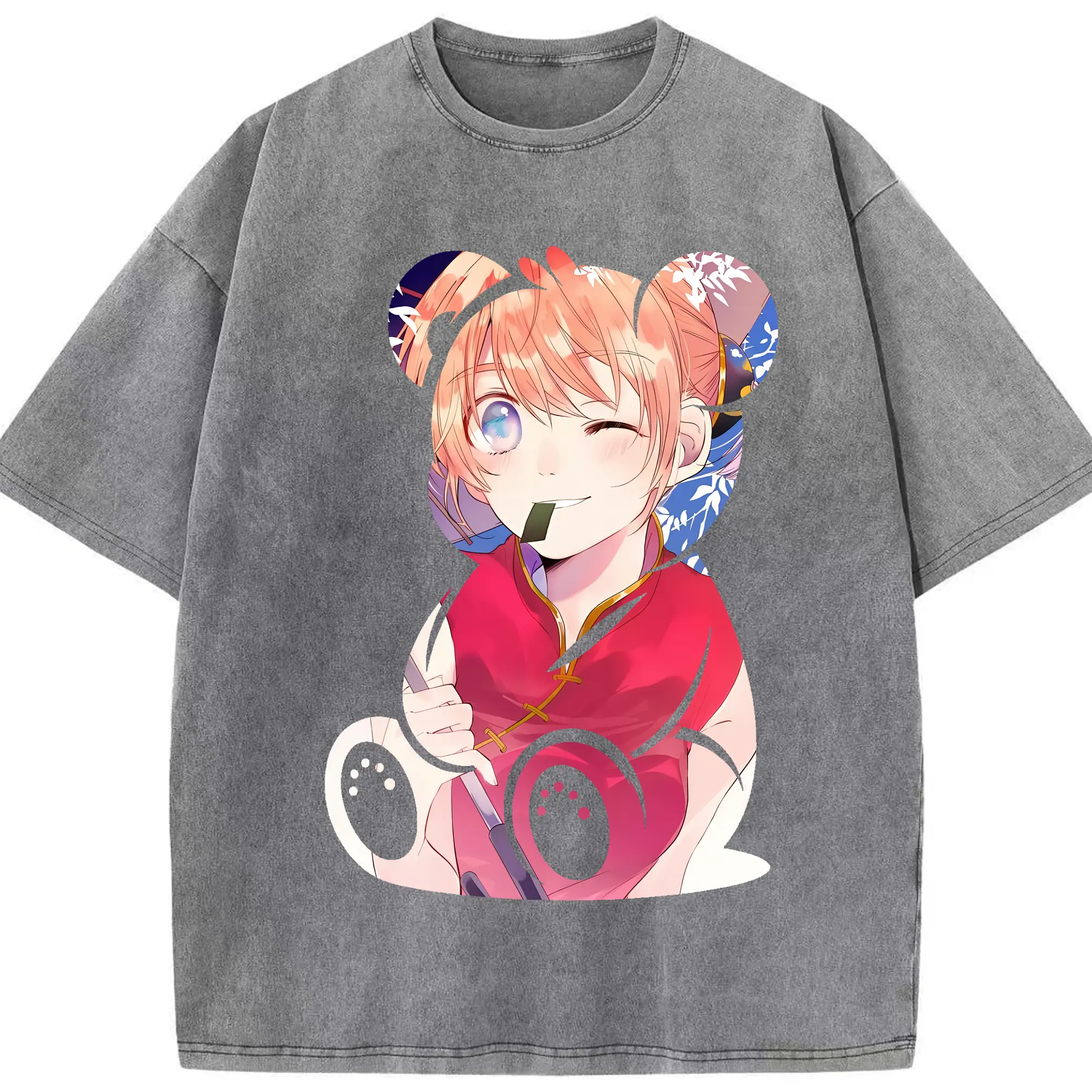 銀魂 グッズ 神楽 - 綿100% ヴィンテージ風 半袖Tシャツ ・ 背面プリント ・ 柔らか肌触り ・ 通気性 快適 ・ スポーツ カジュアル 外出用