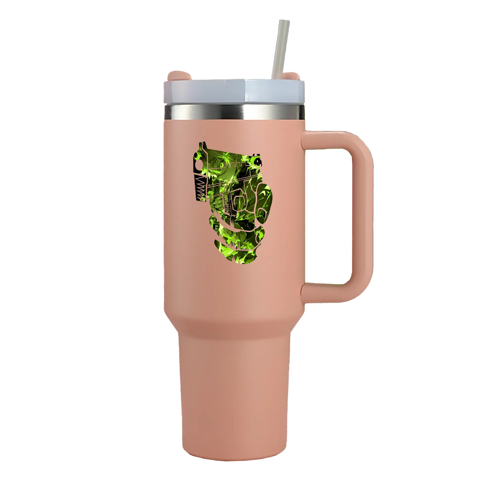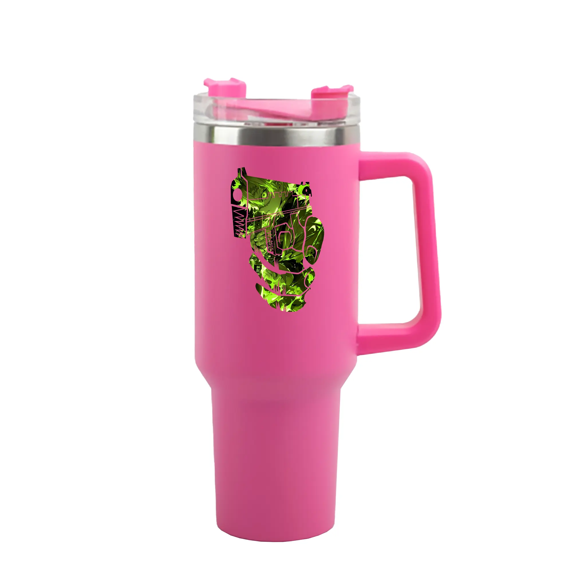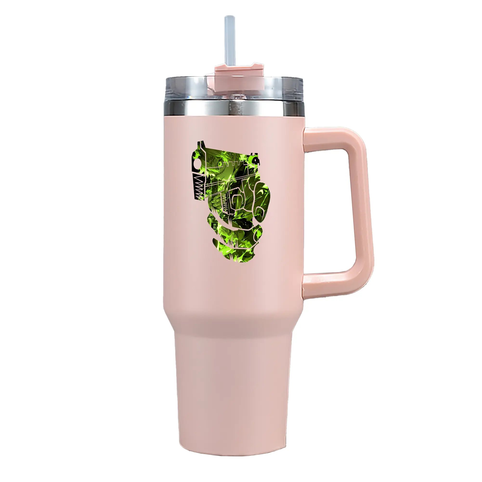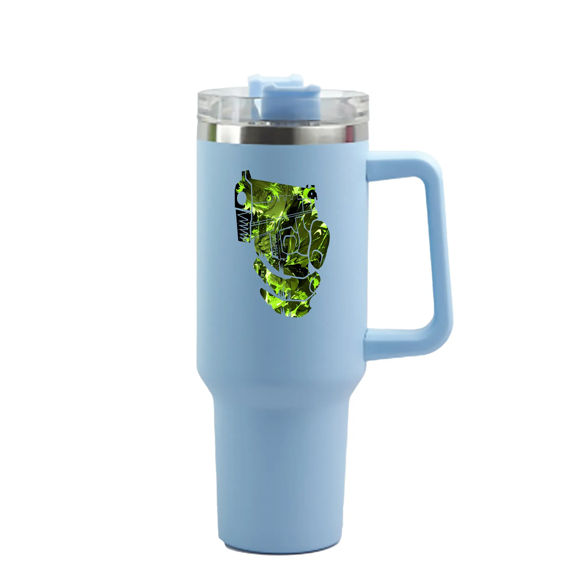 1200mL(40オンス)の大容量ハンドル付きカータンブラー。キラキラと輝くクリスタルステッカーデザインが、毎日の使用に華やかさをプラスします。食品グレード304ステンレスの内側と頑丈な201ステンレスの外側を採用し、耐久性・耐腐食性・安全性を兼ね備えています。