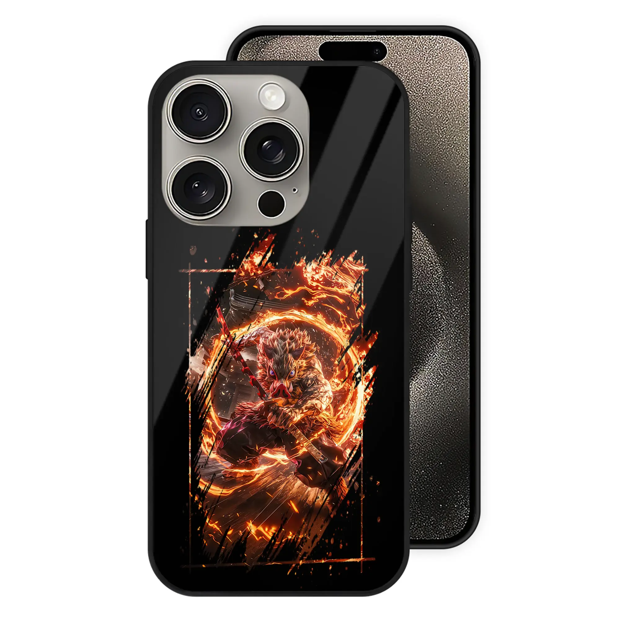 鬼滅の刃 グッズ,嘴平 伊之助 - IPhone15Pro対応 ・ スマホケース ・ 背面ガラス ・ TPU+強化ガラス ・ 耐衝撃 ・ 黄変防止 ・ ワイヤレス充電対応 ・ 3D立体ボタン