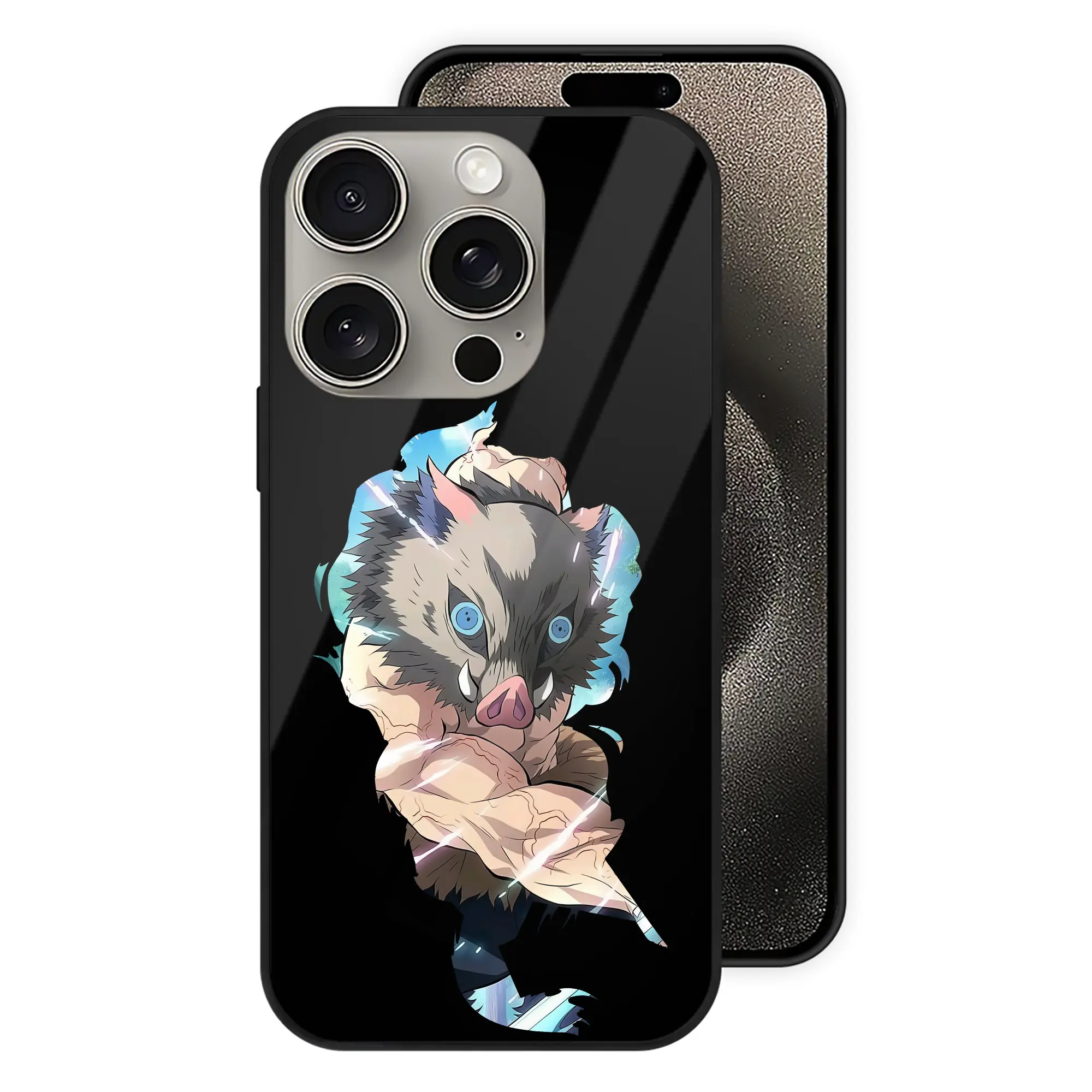 鬼滅の刃 グッズ,嘴平 伊之助 - IPhone15Pro対応 ・ スマホケース ・ 背面ガラス ・ TPU+強化ガラス ・ 耐衝撃 ・ 黄変防止 ・ ワイヤレス充電対応 ・ 3D立体ボタン