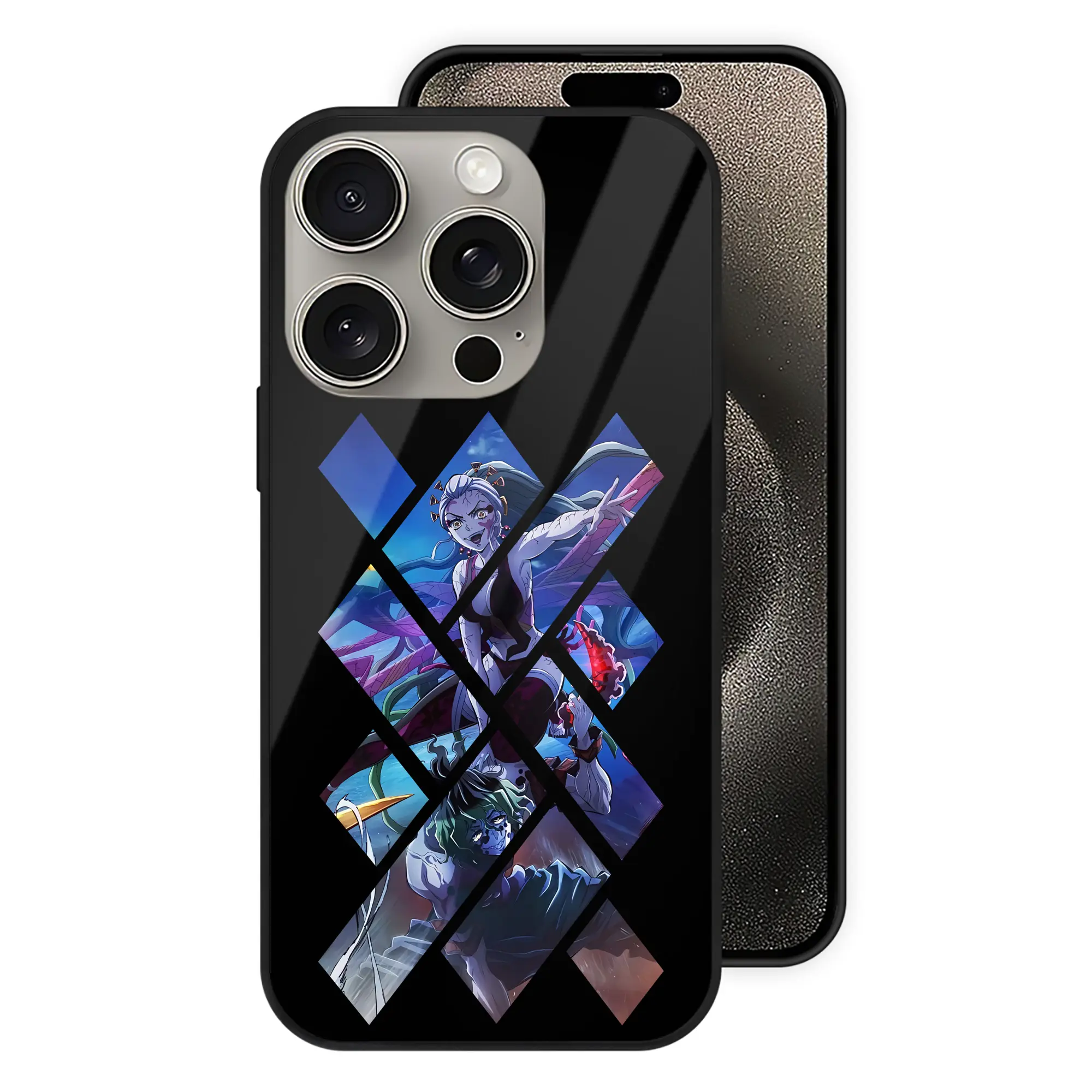 鬼滅の刃 グッズ,堕姫 - IPhone15Pro対応 ・ スマホケース ・ 背面ガラス ・ TPU+強化ガラス ・ 耐衝撃 ・ 黄変防止 ・ ワイヤレス充電対応 ・ 3D立体ボタン