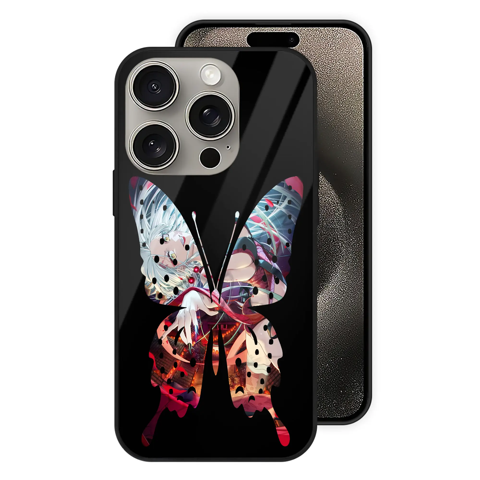 鬼滅の刃 グッズ,堕姫 - IPhone15Pro対応 ・ スマホケース ・ 背面ガラス ・ TPU+強化ガラス ・ 耐衝撃 ・ 黄変防止 ・ ワイヤレス充電対応 ・ 3D立体ボタン