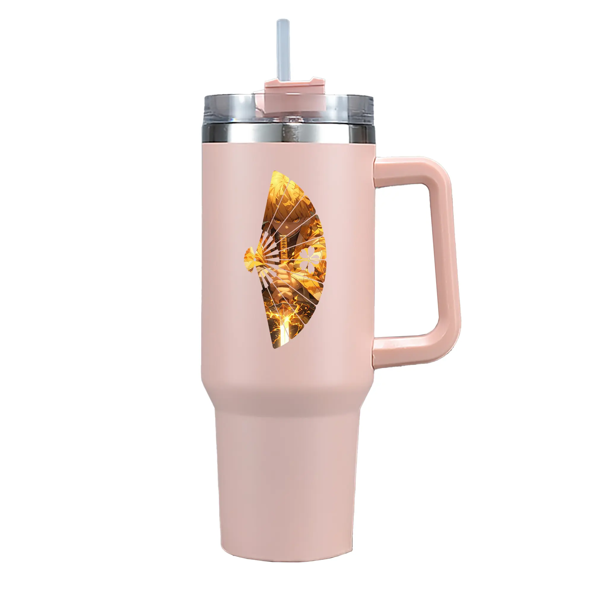 1200mL(40オンス)の大容量ハンドル付きカータンブラー。キラキラと輝くクリスタルステッカーデザインが、毎日の使用に華やかさをプラスします。食品グレード304ステンレスの内側と頑丈な201ステンレスの外側を採用し、耐久性・耐腐食性・安全性を兼ね備えています。