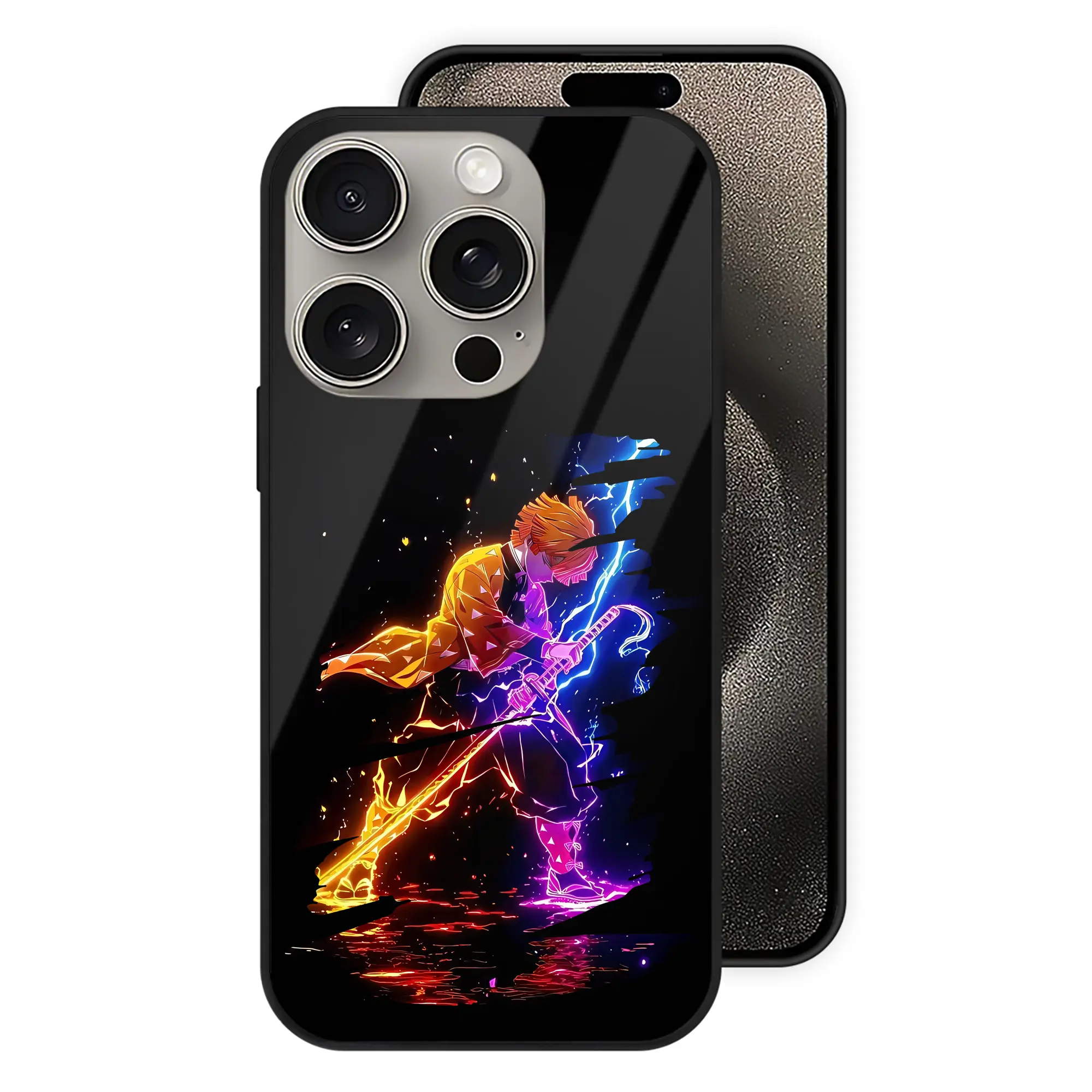 鬼滅の刃 グッズ,我妻 善逸 - IPhone15Pro対応 ・ スマホケース ・ 背面ガラス ・ TPU+強化ガラス ・ 耐衝撃 ・ 黄変防止 ・ ワイヤレス充電対応 ・ 3D立体ボタン