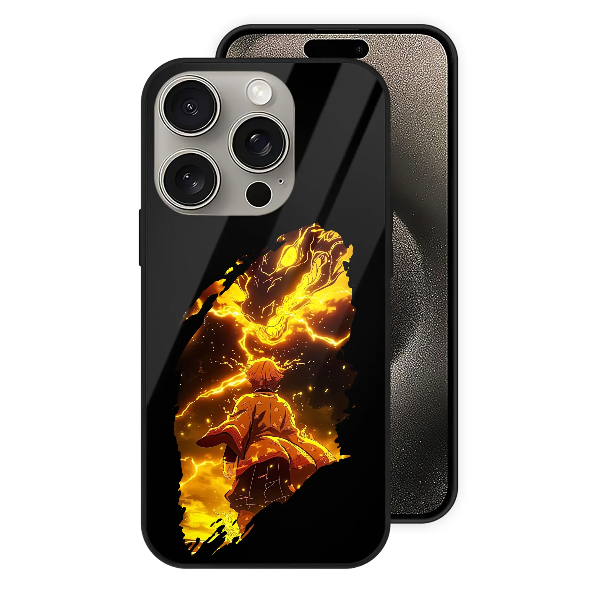 鬼滅の刃 グッズ,我妻 善逸 - IPhone15Pro対応 ・ スマホケース ・ 背面ガラス ・ TPU+強化ガラス ・ 耐衝撃 ・ 黄変防止 ・ ワイヤレス充電対応 ・ 3D立体ボタン