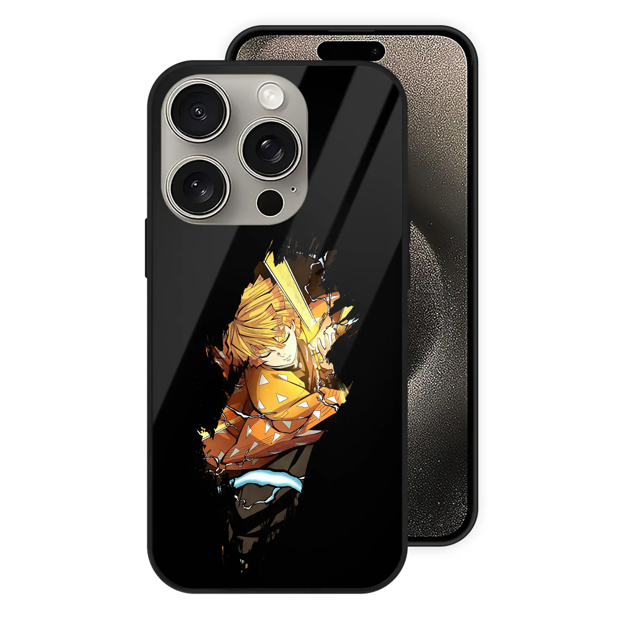 鬼滅の刃 グッズ,我妻 善逸 - IPhone15Pro対応 ・ スマホケース ・ 背面ガラス ・ TPU+強化ガラス ・ 耐衝撃 ・ 黄変防止 ・ ワイヤレス充電対応 ・ 3D立体ボタン