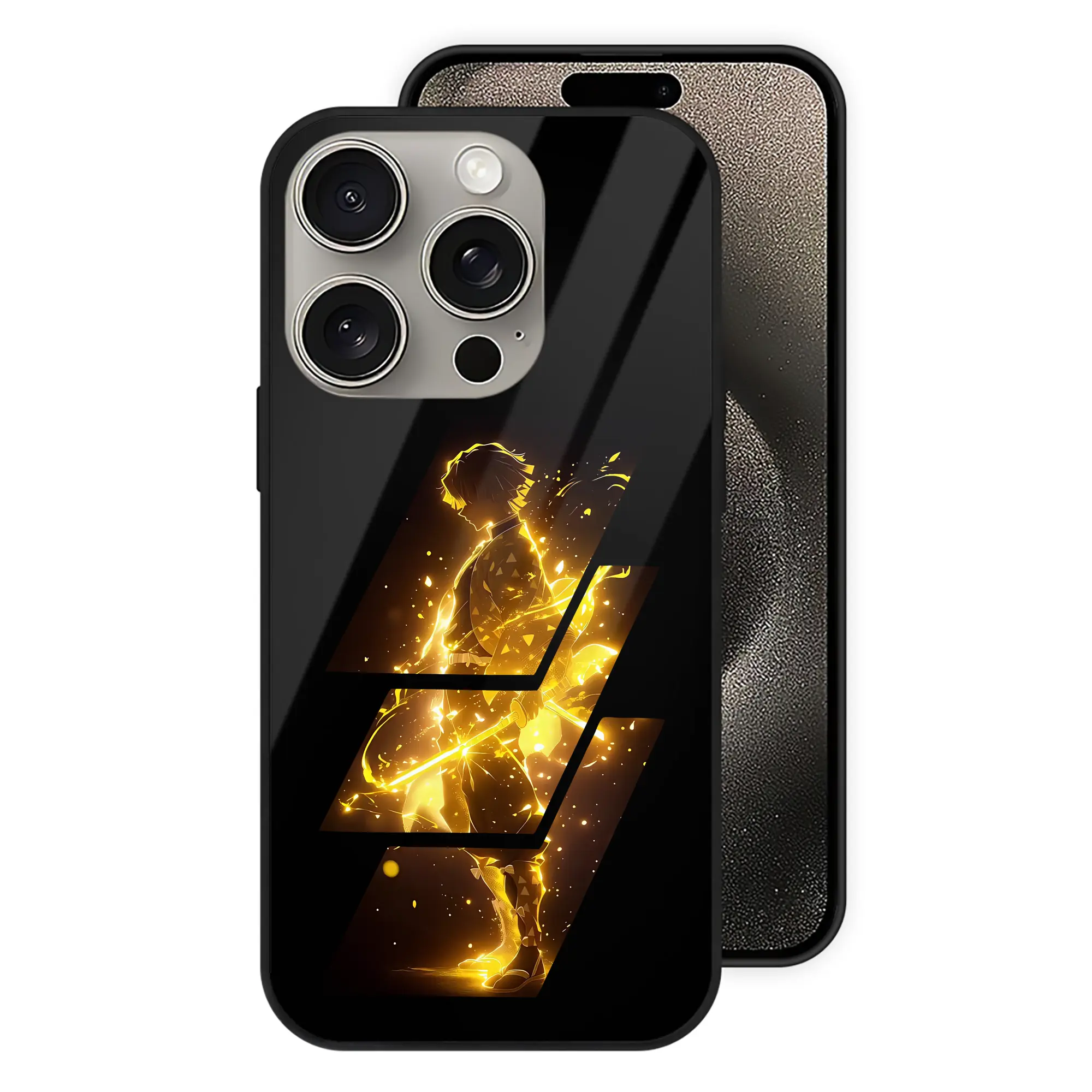 鬼滅の刃 グッズ,我妻 善逸 - IPhone15Pro対応 ・ スマホケース ・ 背面ガラス ・ TPU+強化ガラス ・ 耐衝撃 ・ 黄変防止 ・ ワイヤレス充電対応 ・ 3D立体ボタン