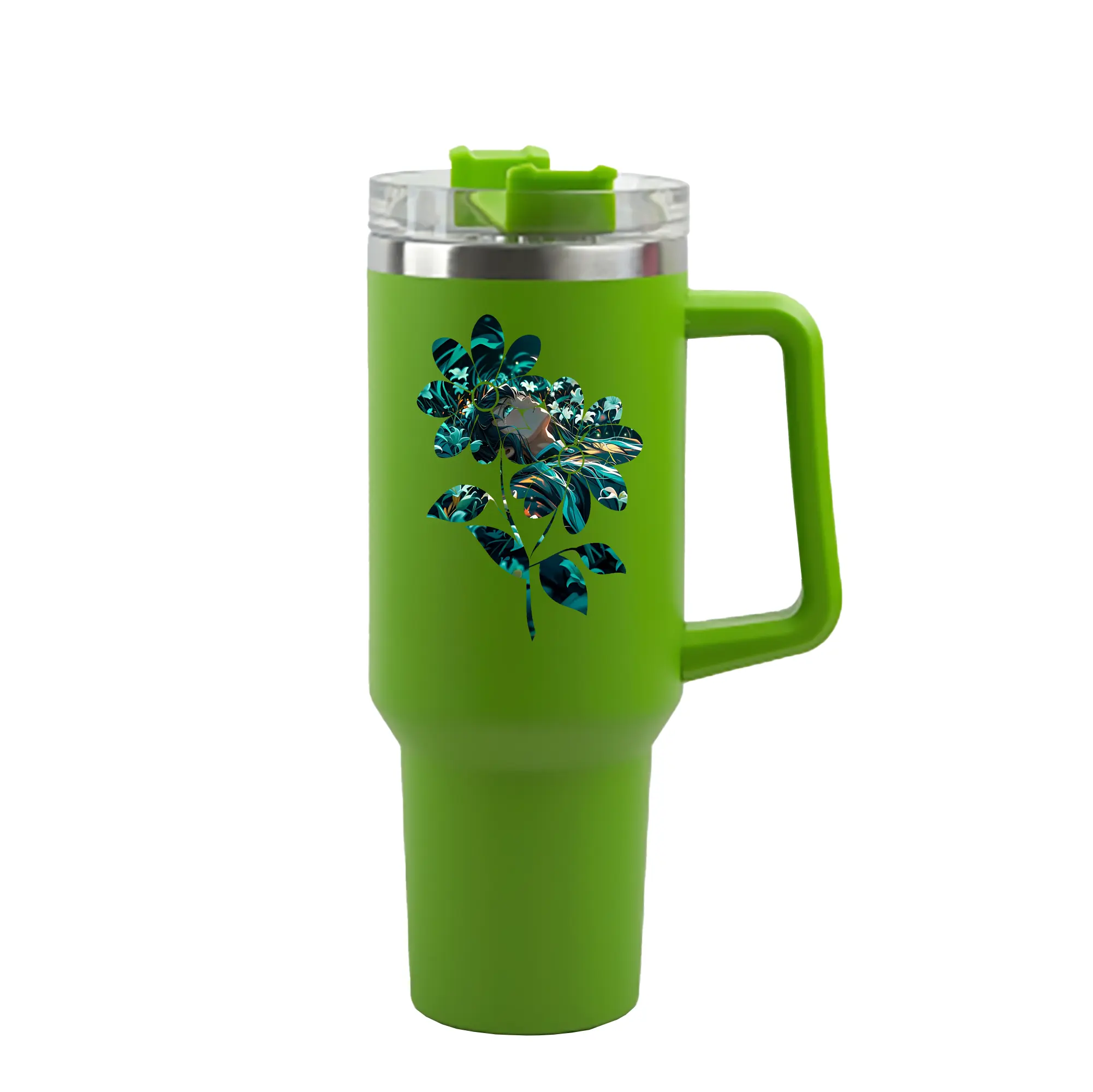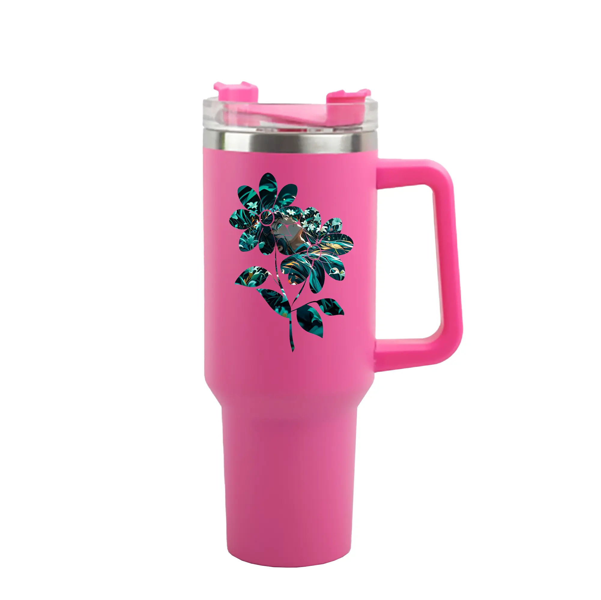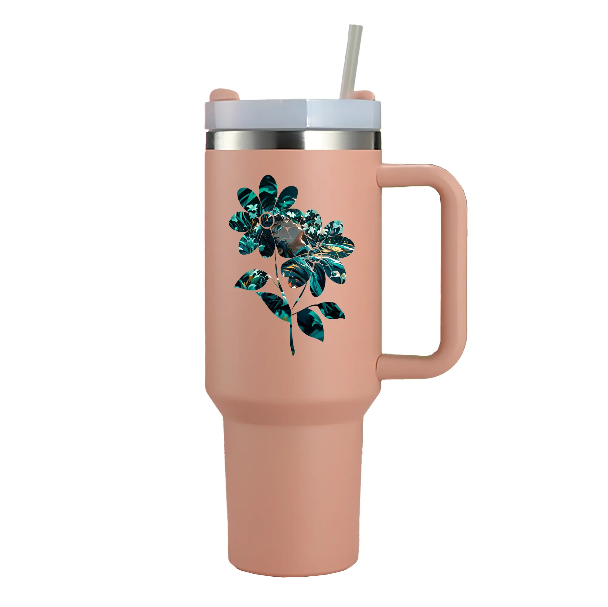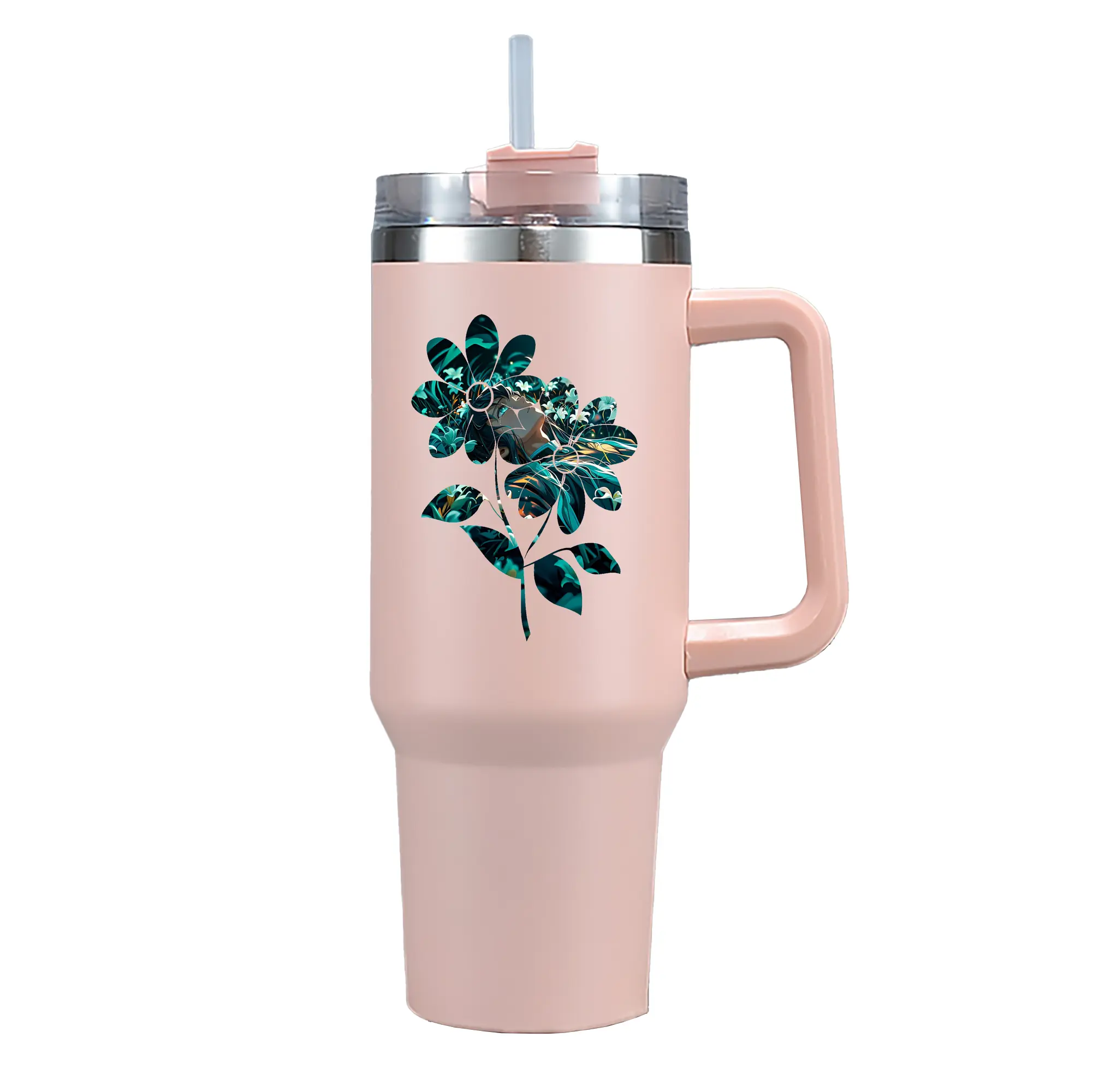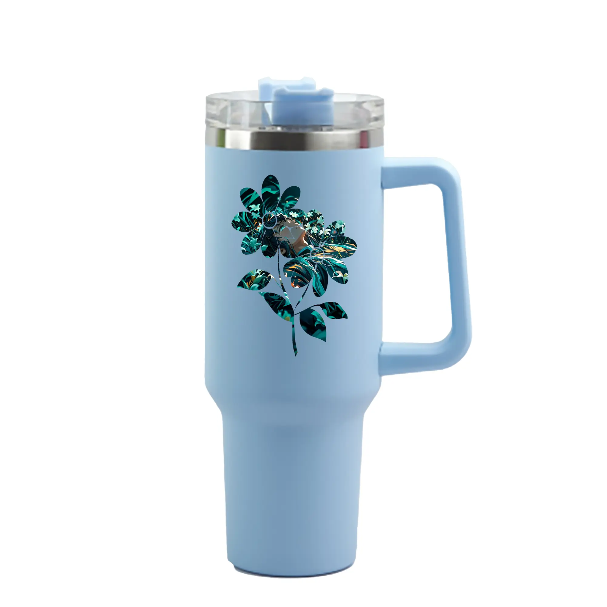 1200mL(40オンス)の大容量ハンドル付きカータンブラー。キラキラと輝くクリスタルステッカーデザインが、毎日の使用に華やかさをプラスします。食品グレード304ステンレスの内側と頑丈な201ステンレスの外側を採用し、耐久性・耐腐食性・安全性を兼ね備えています。