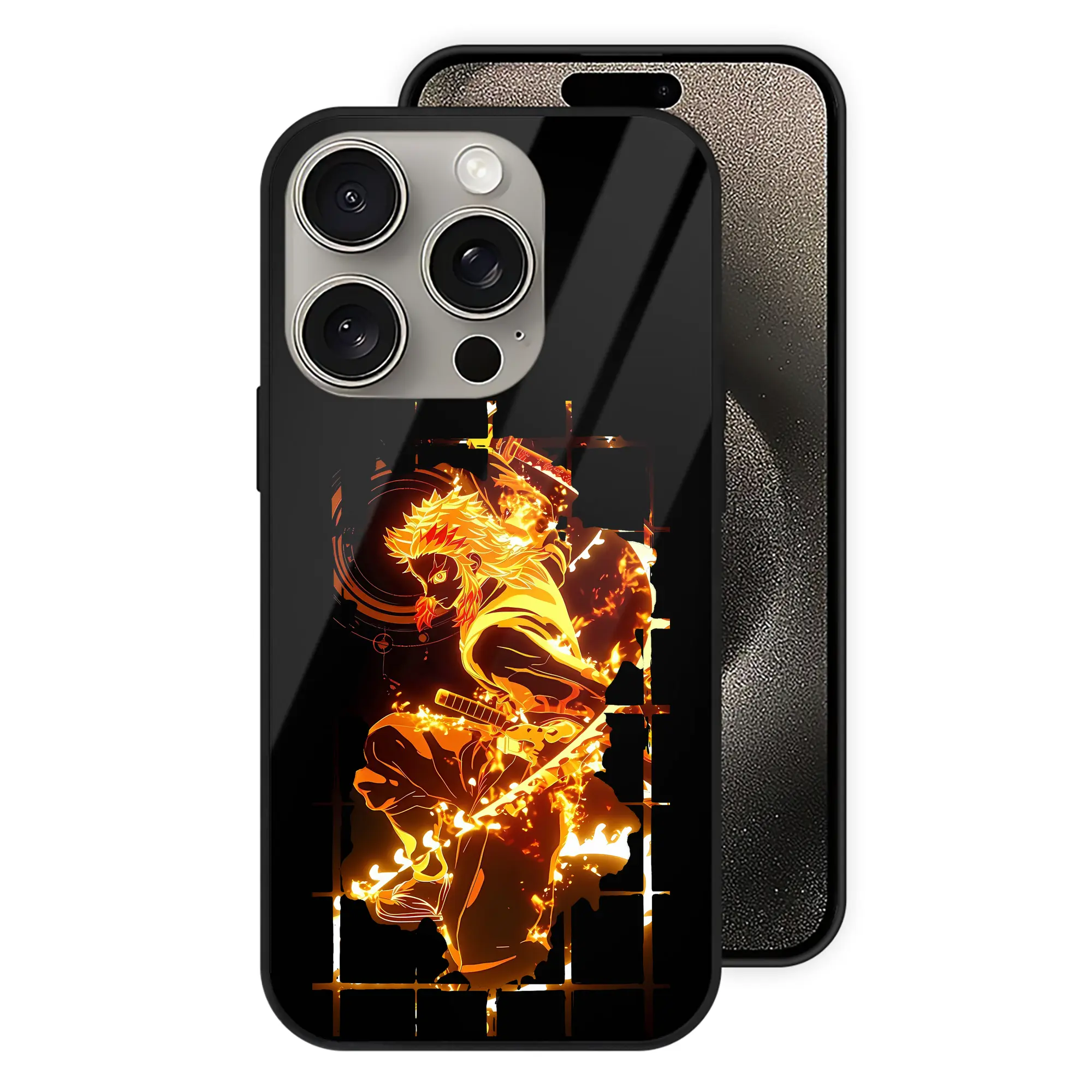 鬼滅の刃 グッズ,煉獄 杏寿郎 - IPhone15Pro対応 ・ スマホケース ・ 背面ガラス ・ TPU+強化ガラス ・ 耐衝撃 ・ 黄変防止 ・ ワイヤレス充電対応 ・ 3D立体ボタン