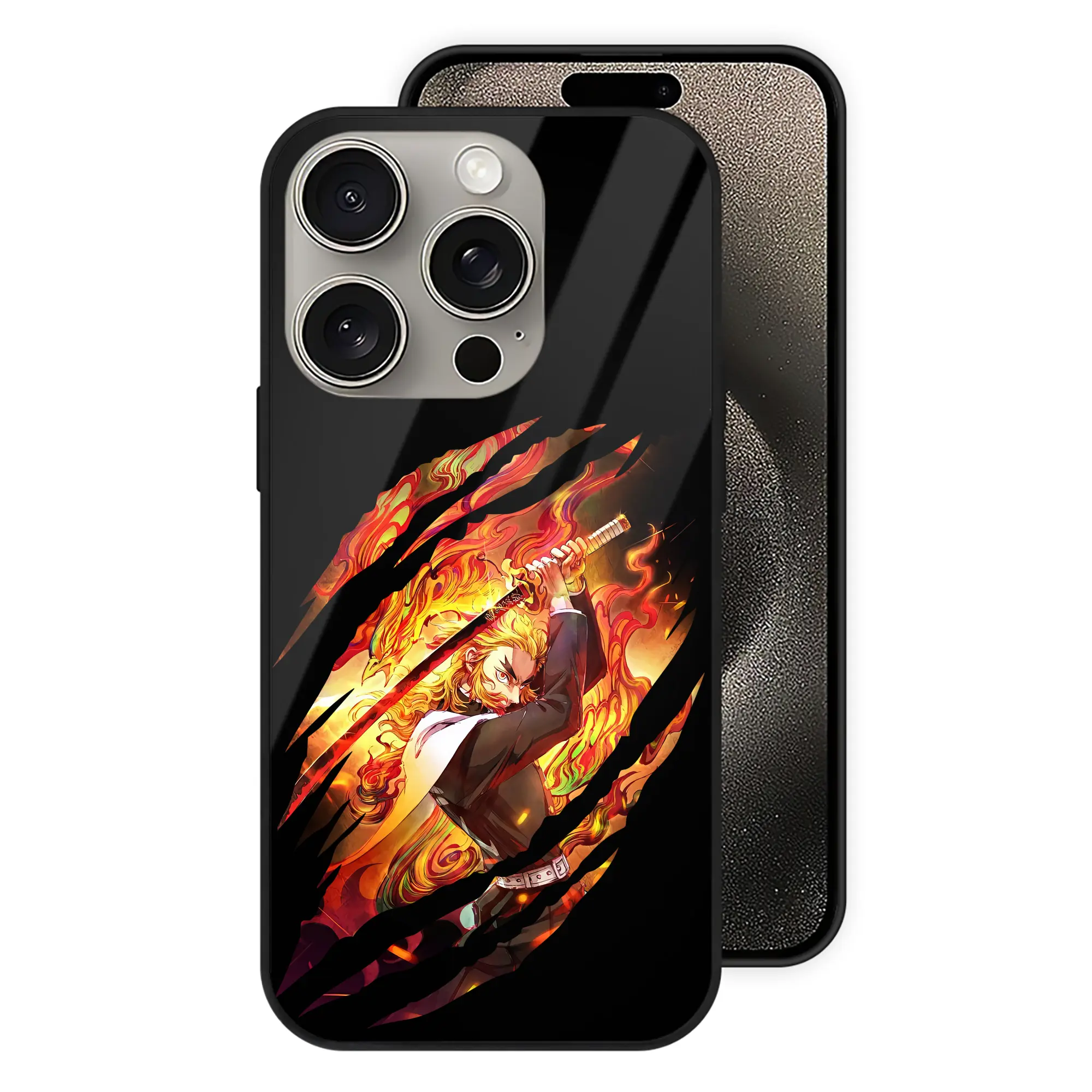 鬼滅の刃 グッズ,煉獄 杏寿郎 - IPhone15Pro対応 ・ スマホケース ・ 背面ガラス ・ TPU+強化ガラス ・ 耐衝撃 ・ 黄変防止 ・ ワイヤレス充電対応 ・ 3D立体ボタン