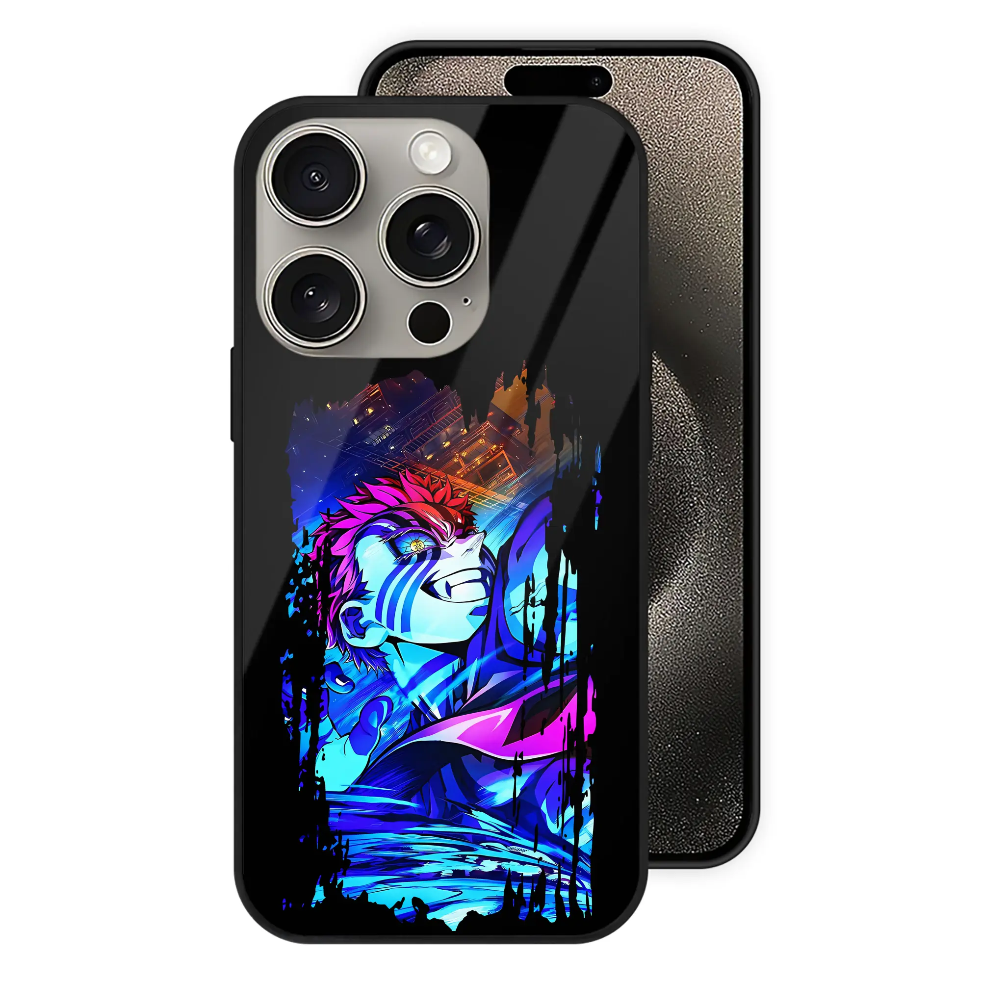 鬼滅の刃 グッズ,猗窩座 - IPhone15Pro対応 ・ スマホケース ・ 背面ガラス ・ TPU+強化ガラス ・ 耐衝撃 ・ 黄変防止 ・ ワイヤレス充電対応 ・ 3D立体ボタン