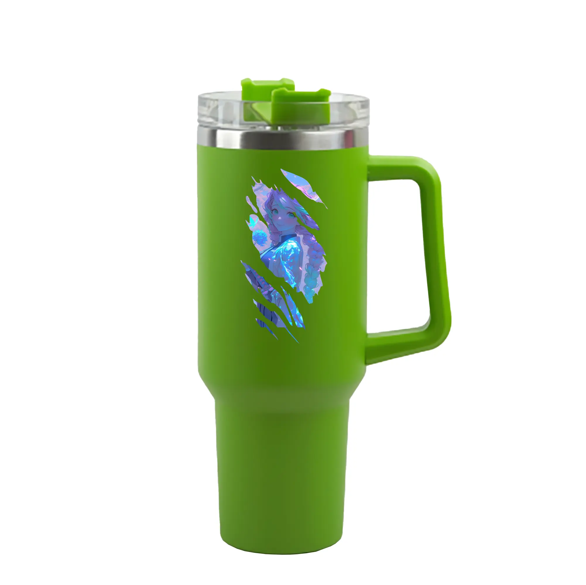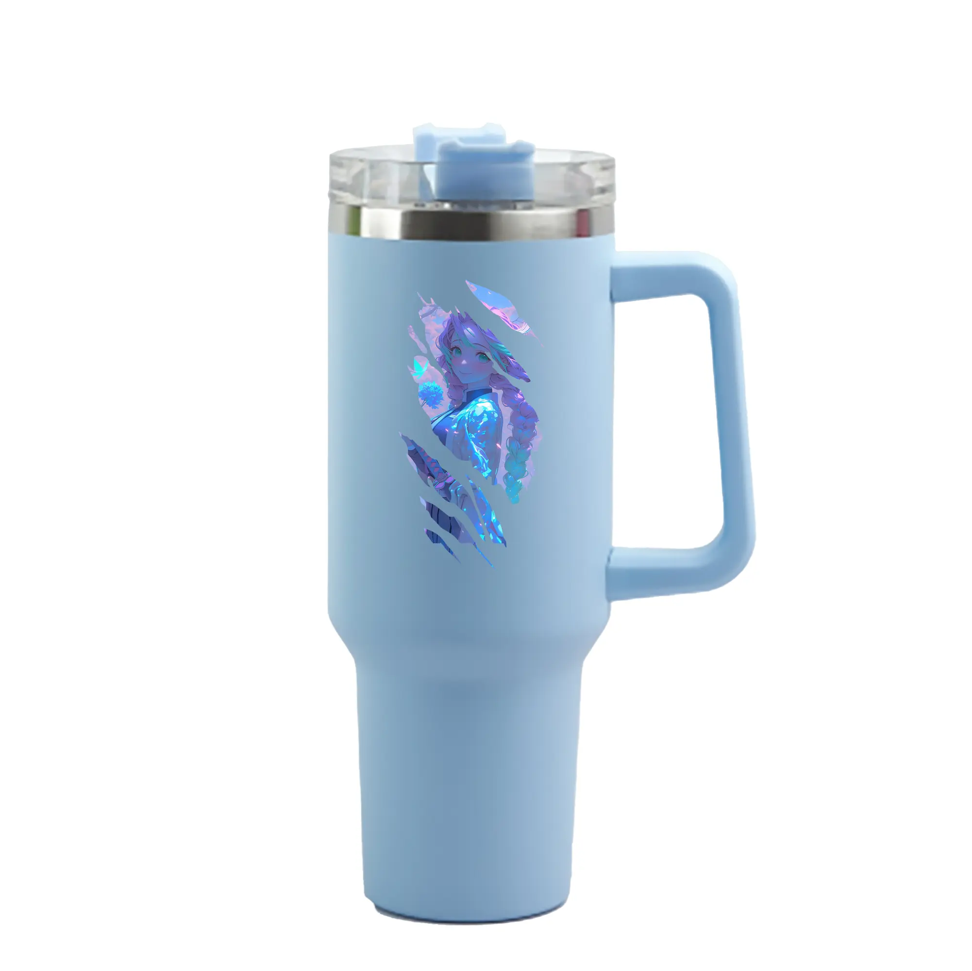 1200mL(40オンス)の大容量ハンドル付きカータンブラー。キラキラと輝くクリスタルステッカーデザインが、毎日の使用に華やかさをプラスします。食品グレード304ステンレスの内側と頑丈な201ステンレスの外側を採用し、耐久性・耐腐食性・安全性を兼ね備えています。