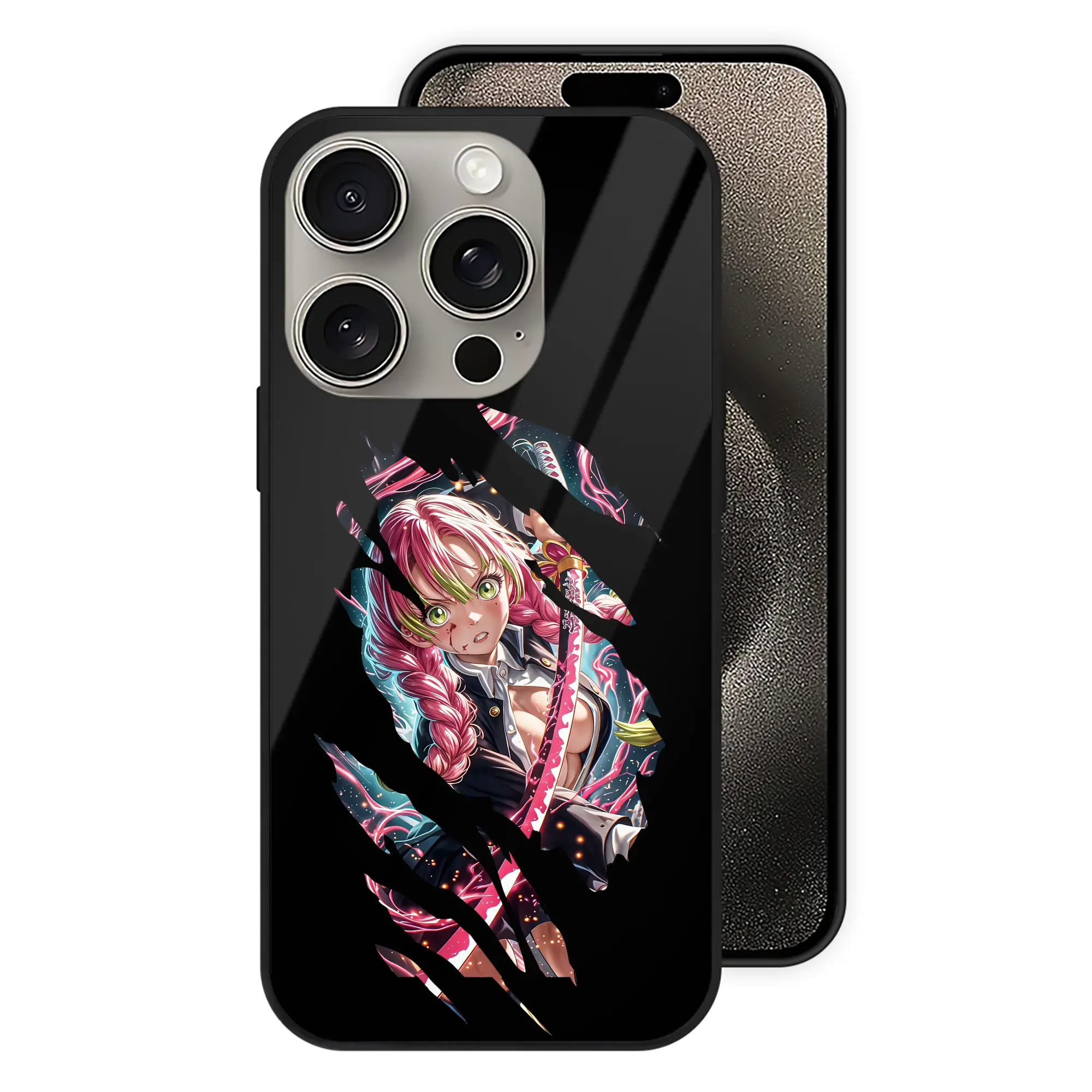 鬼滅の刃 グッズ,甘露寺 蜜璃 - IPhone15Pro対応 ・ スマホケース ・ 背面ガラス ・ TPU+強化ガラス ・ 耐衝撃 ・ 黄変防止 ・ ワイヤレス充電対応 ・ 3D立体ボタン