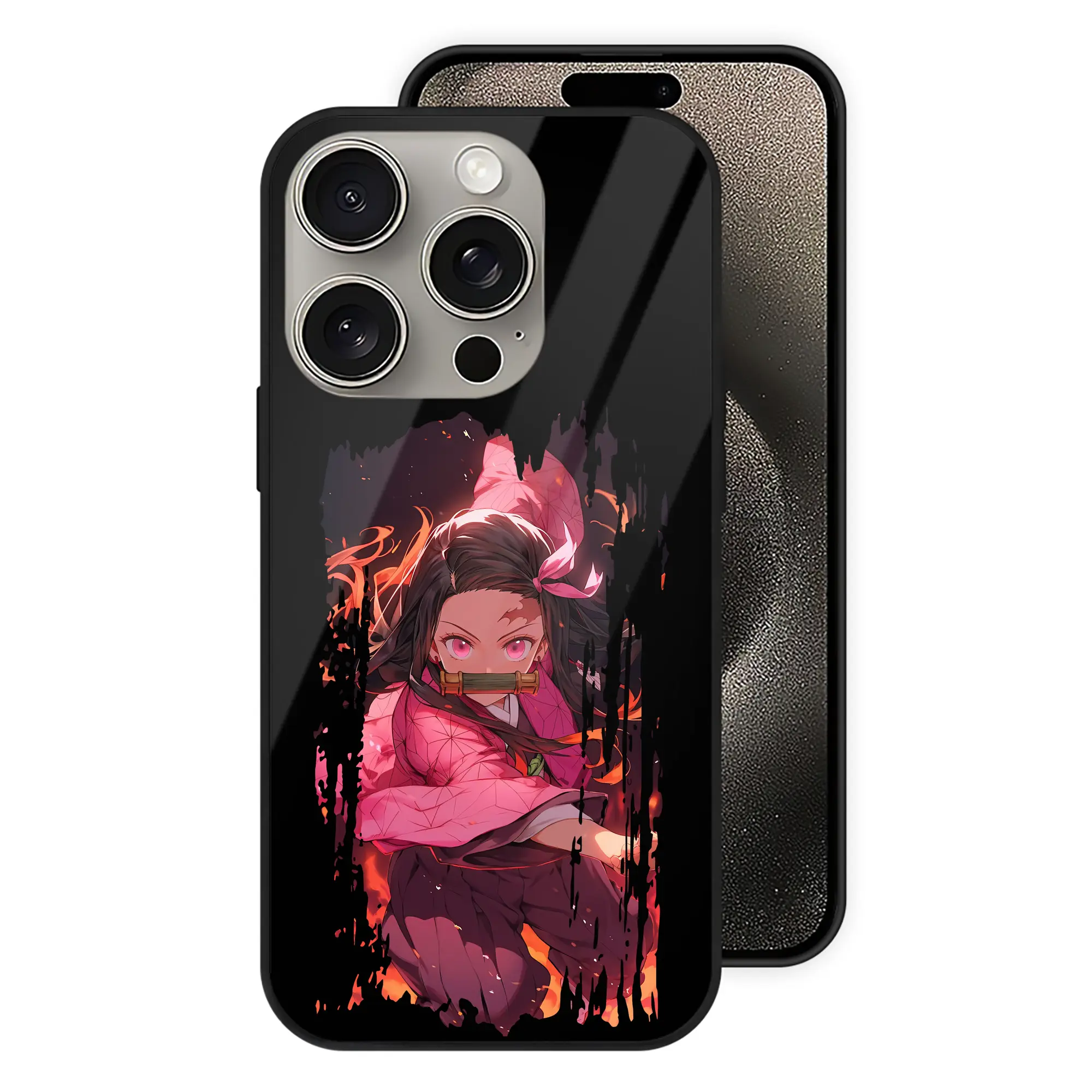 鬼滅の刃 グッズ,竈門 禰豆子 - IPhone15Pro対応 ・ スマホケース ・ 背面ガラス ・ TPU+強化ガラス ・ 耐衝撃 ・ 黄変防止 ・ ワイヤレス充電対応 ・ 3D立体ボタン