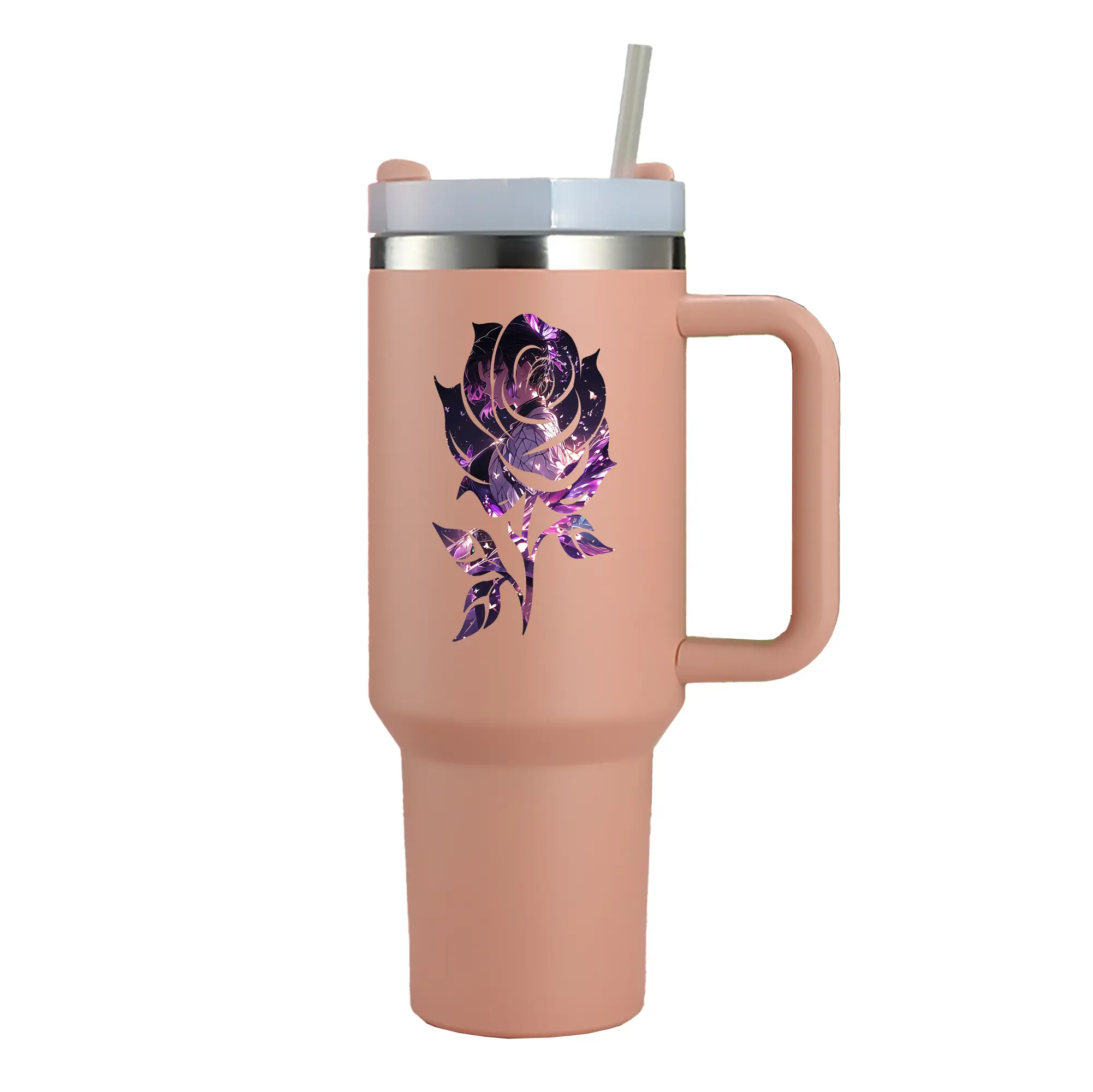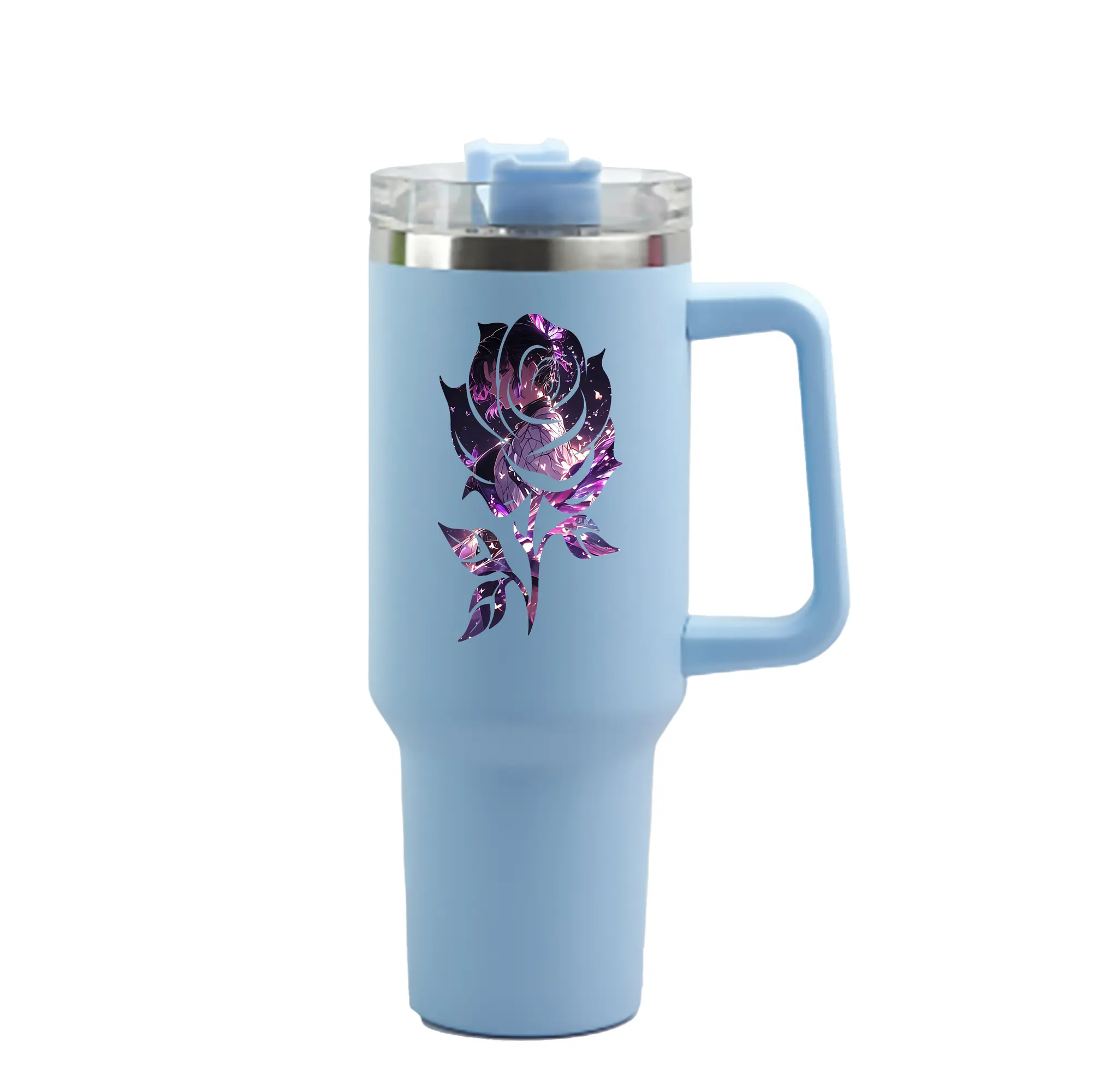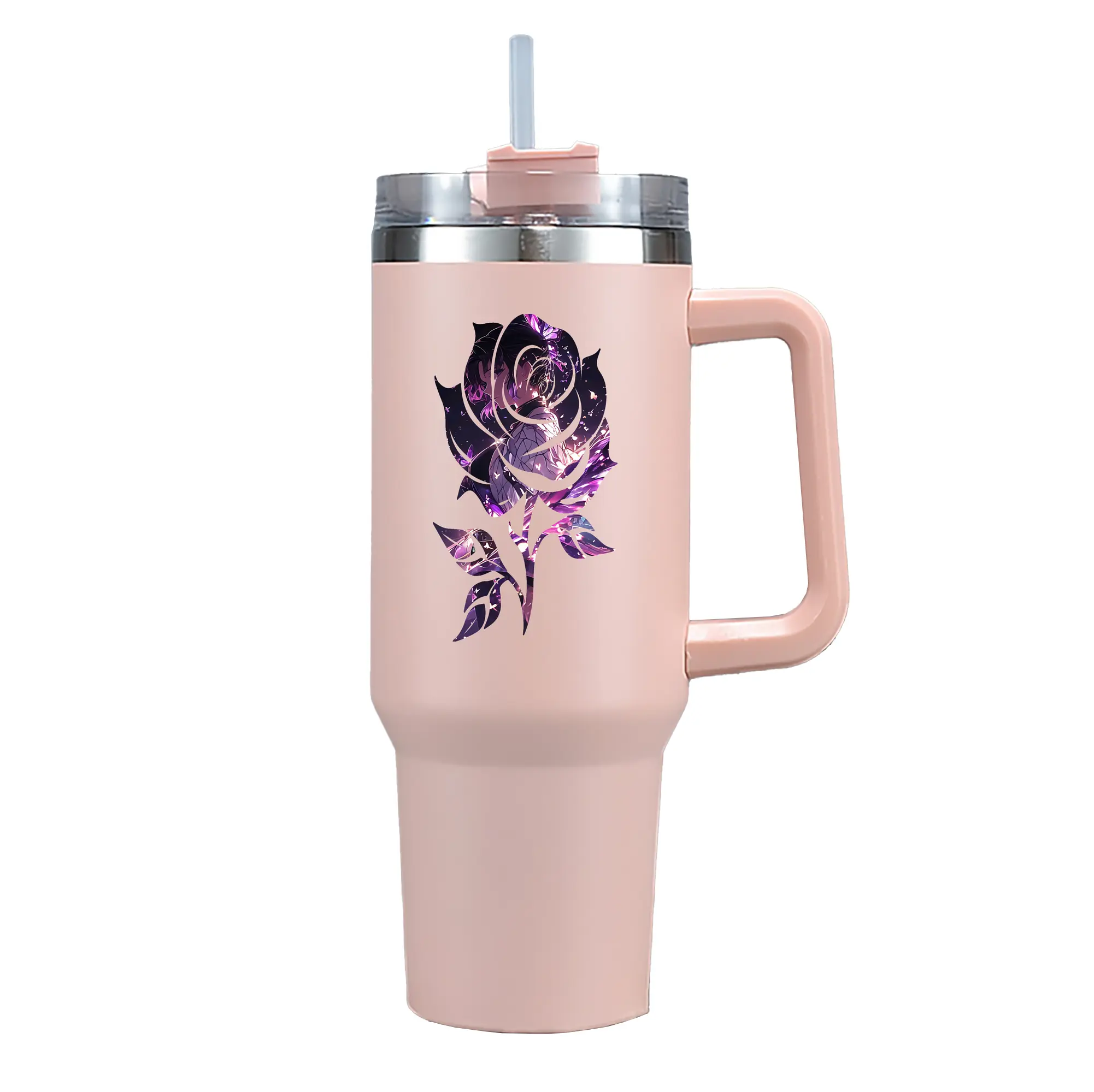 1200mL(40オンス)の大容量ハンドル付きカータンブラー。キラキラと輝くクリスタルステッカーデザインが、毎日の使用に華やかさをプラスします。食品グレード304ステンレスの内側と頑丈な201ステンレスの外側を採用し、耐久性・耐腐食性・安全性を兼ね備えています。