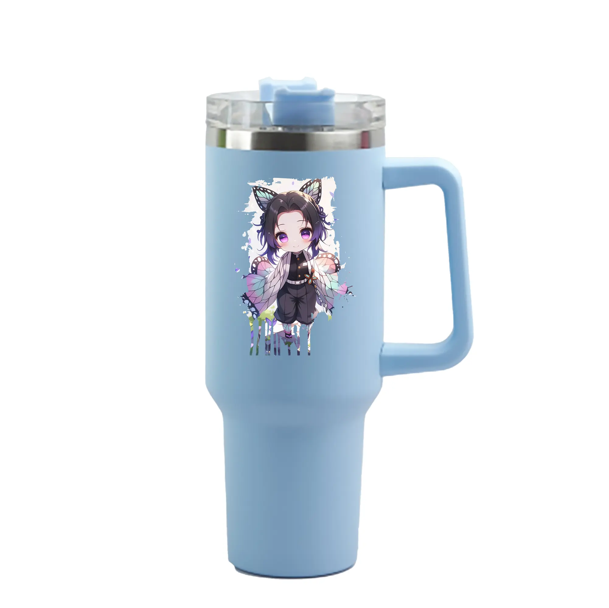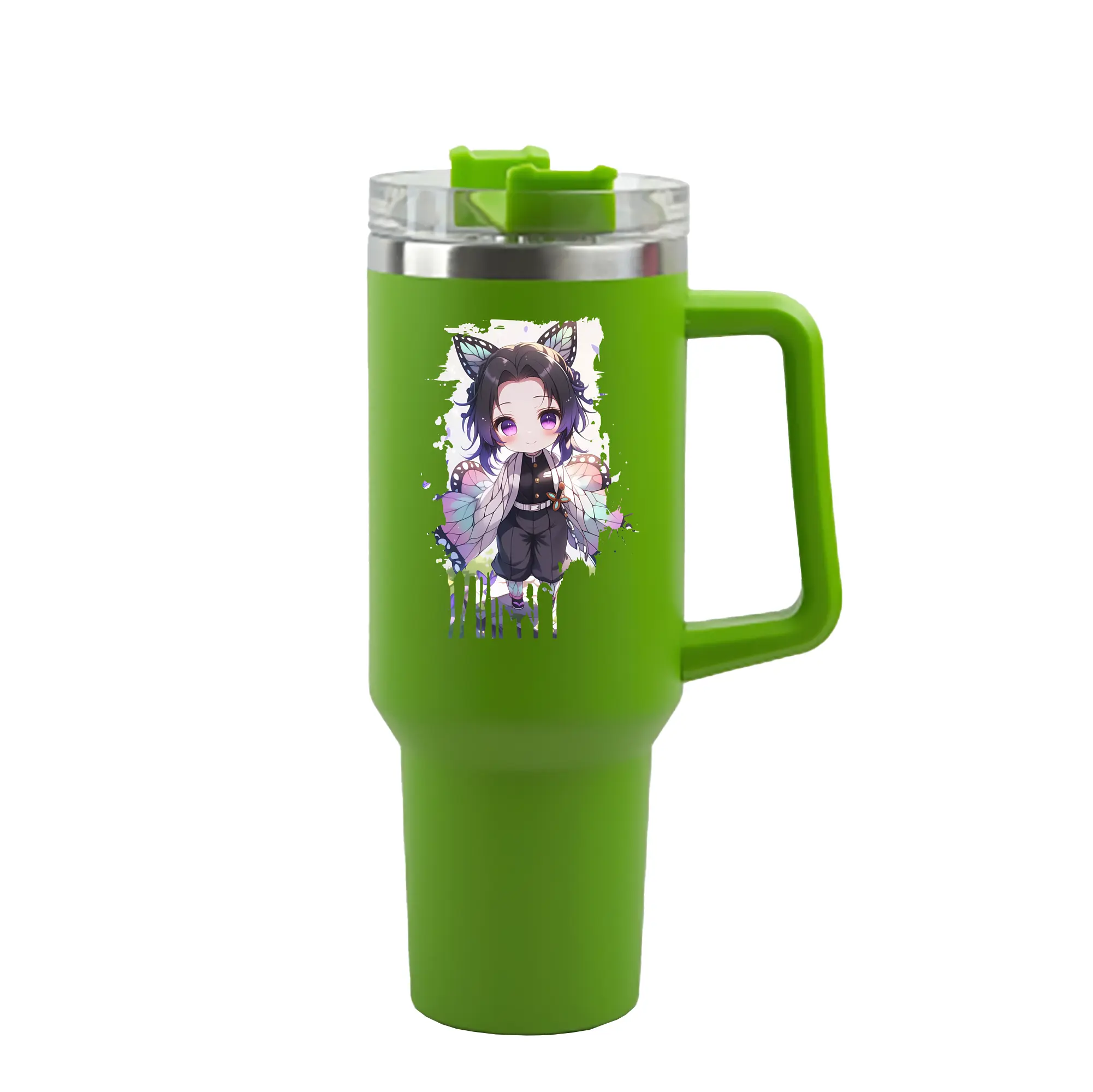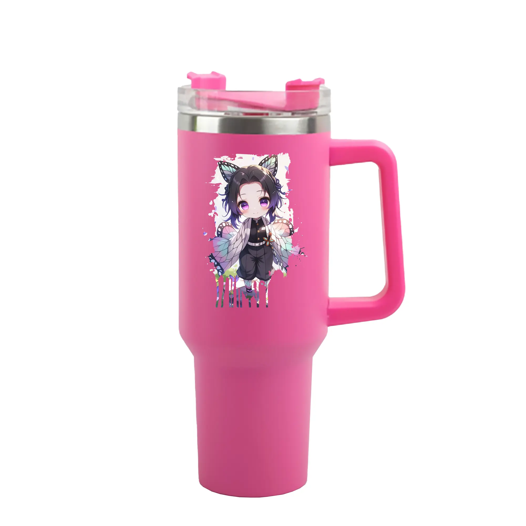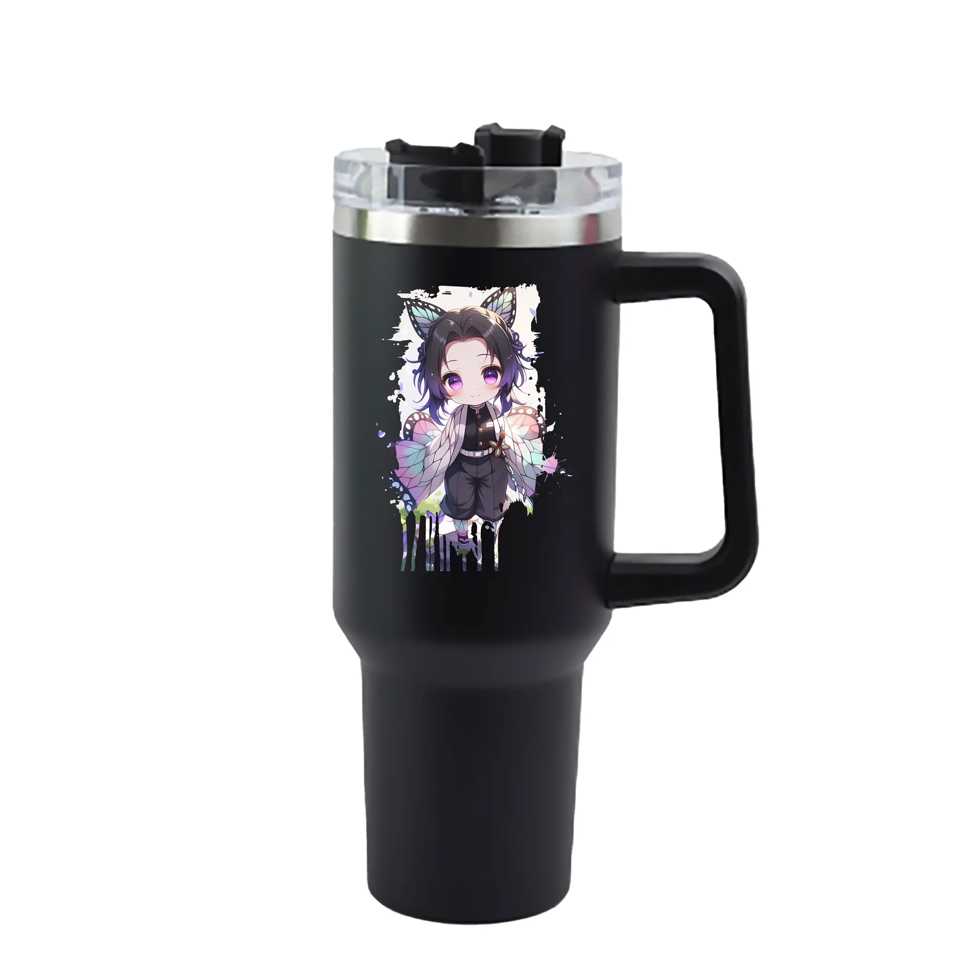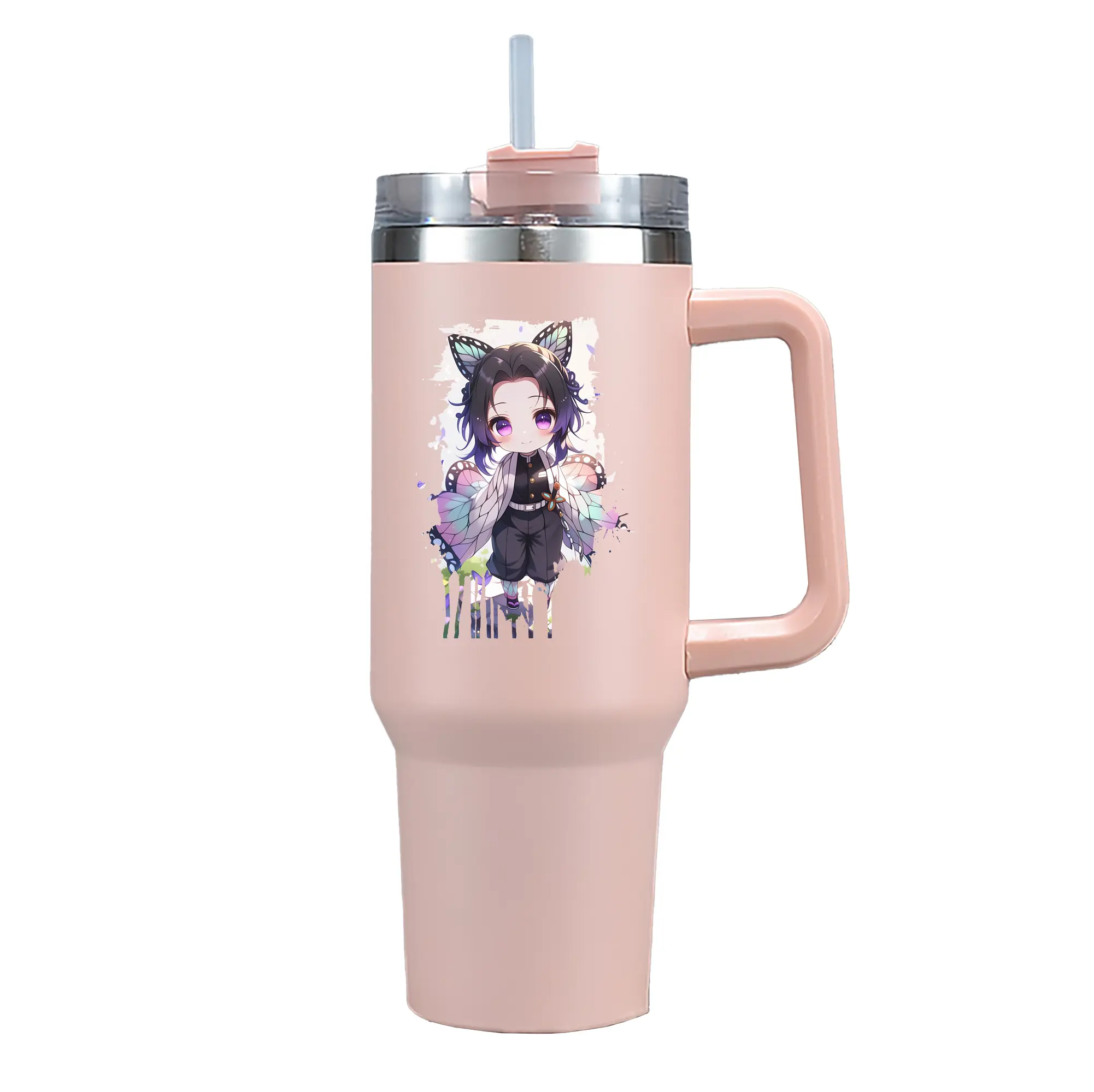 鬼滅の刃 グッズ,胡蝶 しのぶ - 1200mL 車用タンブラー ・ クリスタルステッカー ・ 304ステンレス 内側 ・ 201ステンレス 外側 ・ 保温 保冷 ・ ハンドル&ストロー付き ・ 通勤 ドライブ アウトドア用