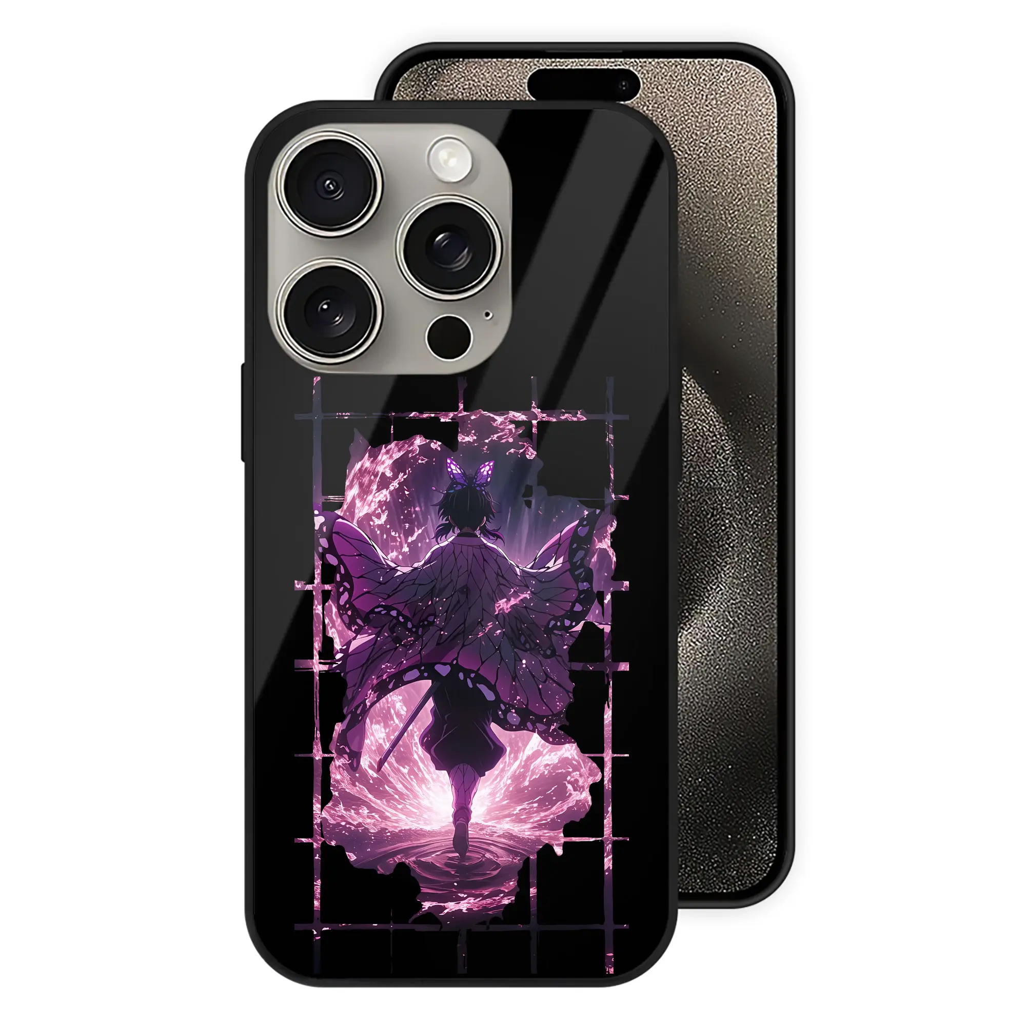鬼滅の刃 グッズ,胡蝶 しのぶ - IPhone15Pro対応 ・ スマホケース ・ 背面ガラス ・ TPU+強化ガラス ・ 耐衝撃 ・ 黄変防止 ・ ワイヤレス充電対応 ・ 3D立体ボタン