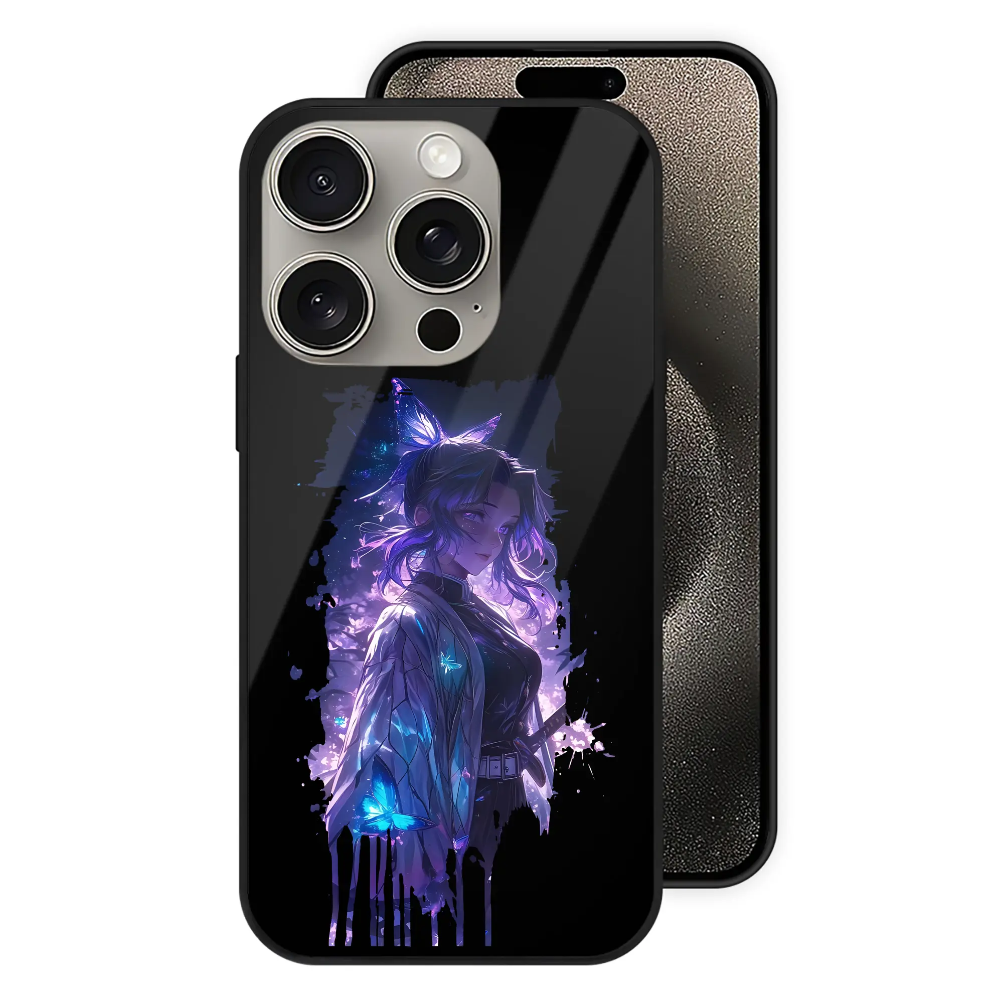 鬼滅の刃 グッズ,胡蝶 しのぶ - IPhone15Pro対応 ・ スマホケース ・ 背面ガラス ・ TPU+強化ガラス ・ 耐衝撃 ・ 黄変防止 ・ ワイヤレス充電対応 ・ 3D立体ボタン
