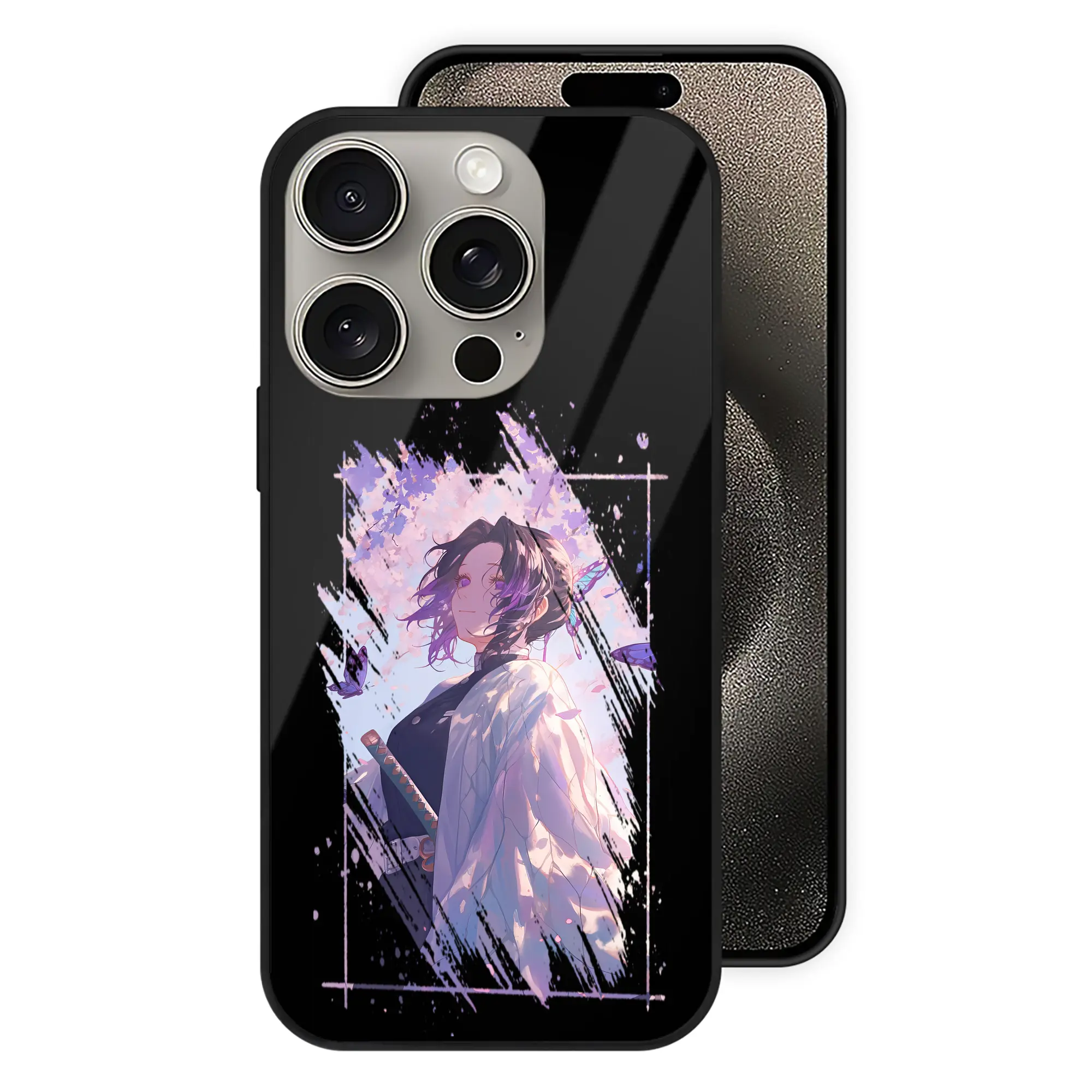 鬼滅の刃 グッズ,胡蝶 しのぶ - IPhone15Pro対応 ・ スマホケース ・ 背面ガラス ・ TPU+強化ガラス ・ 耐衝撃 ・ 黄変防止 ・ ワイヤレス充電対応 ・ 3D立体ボタン