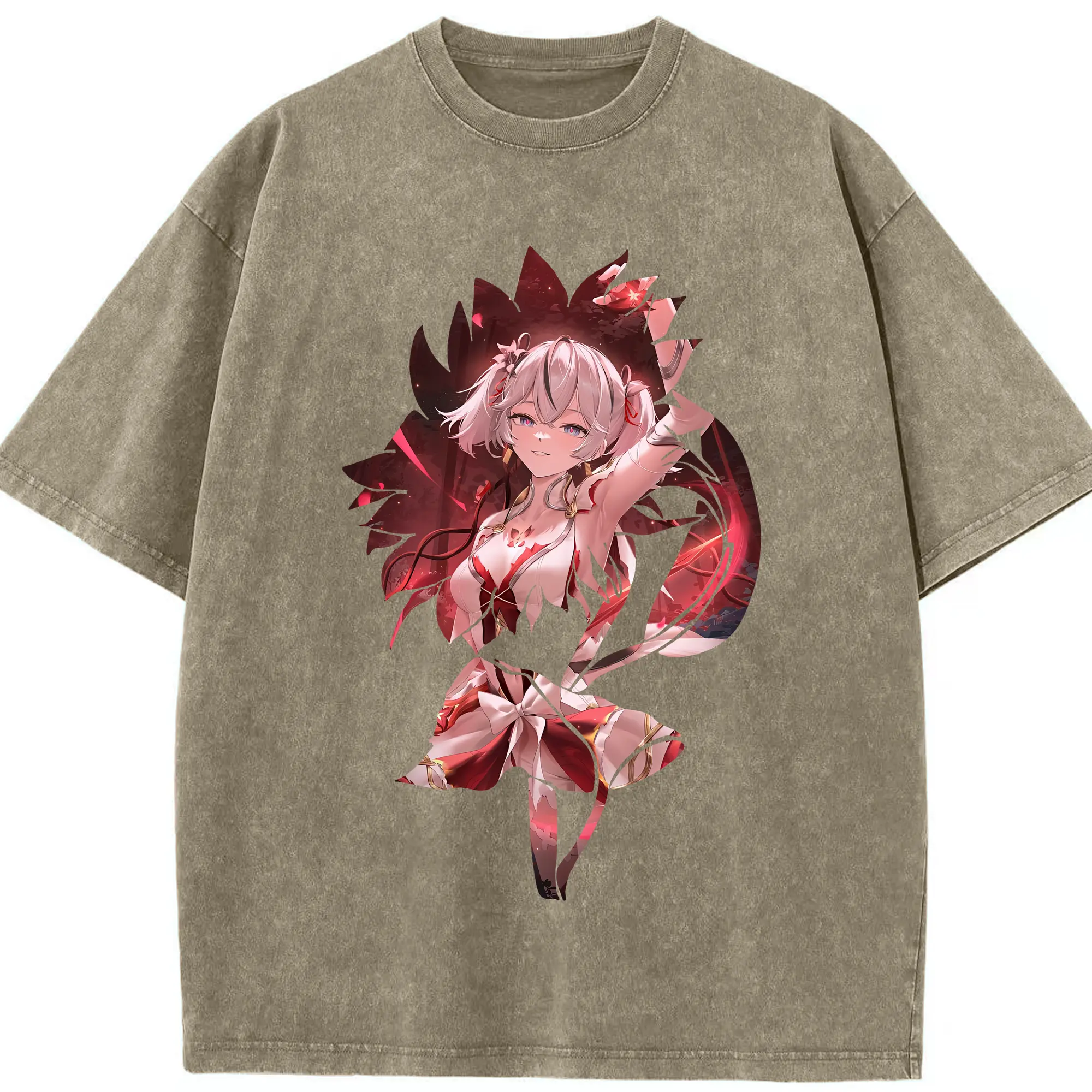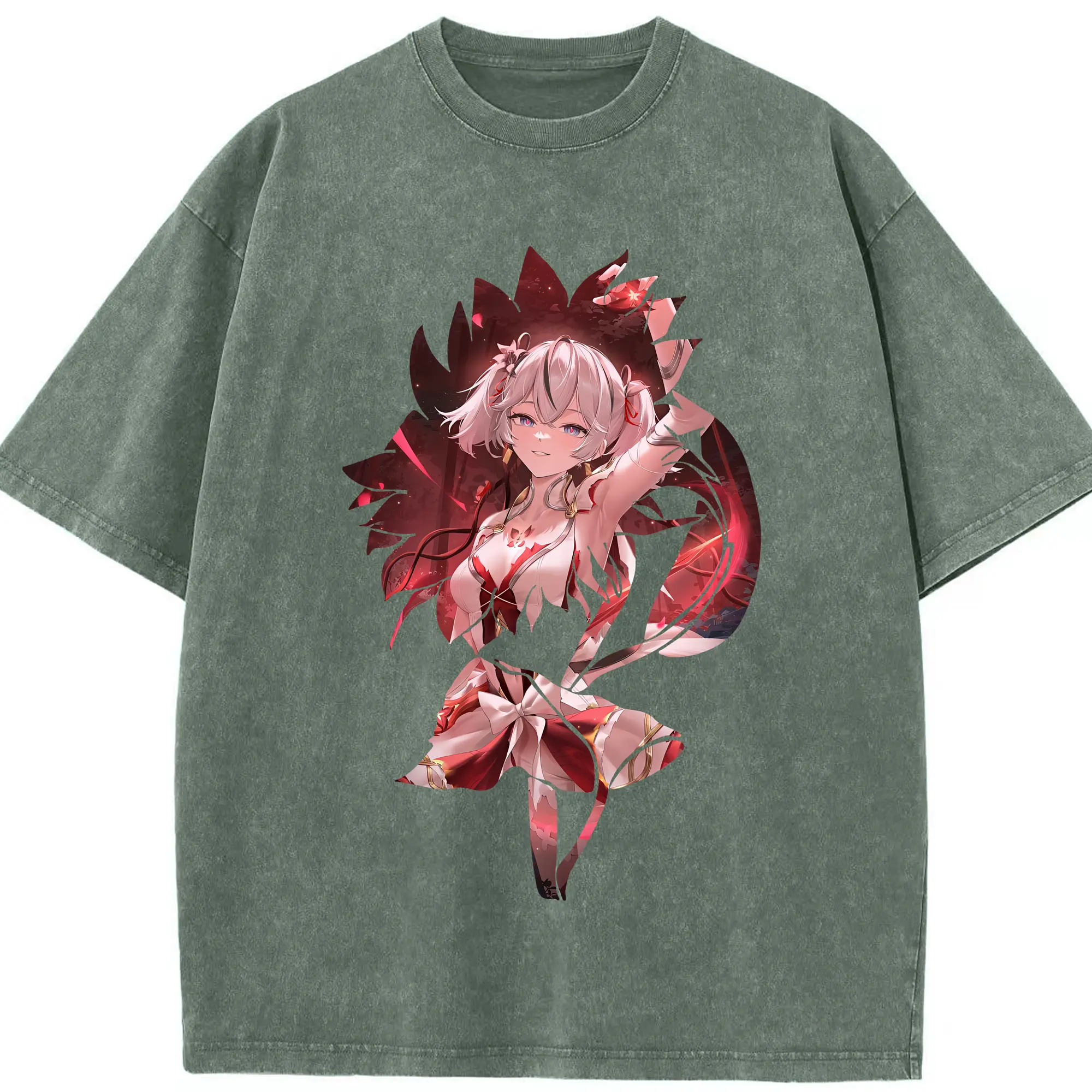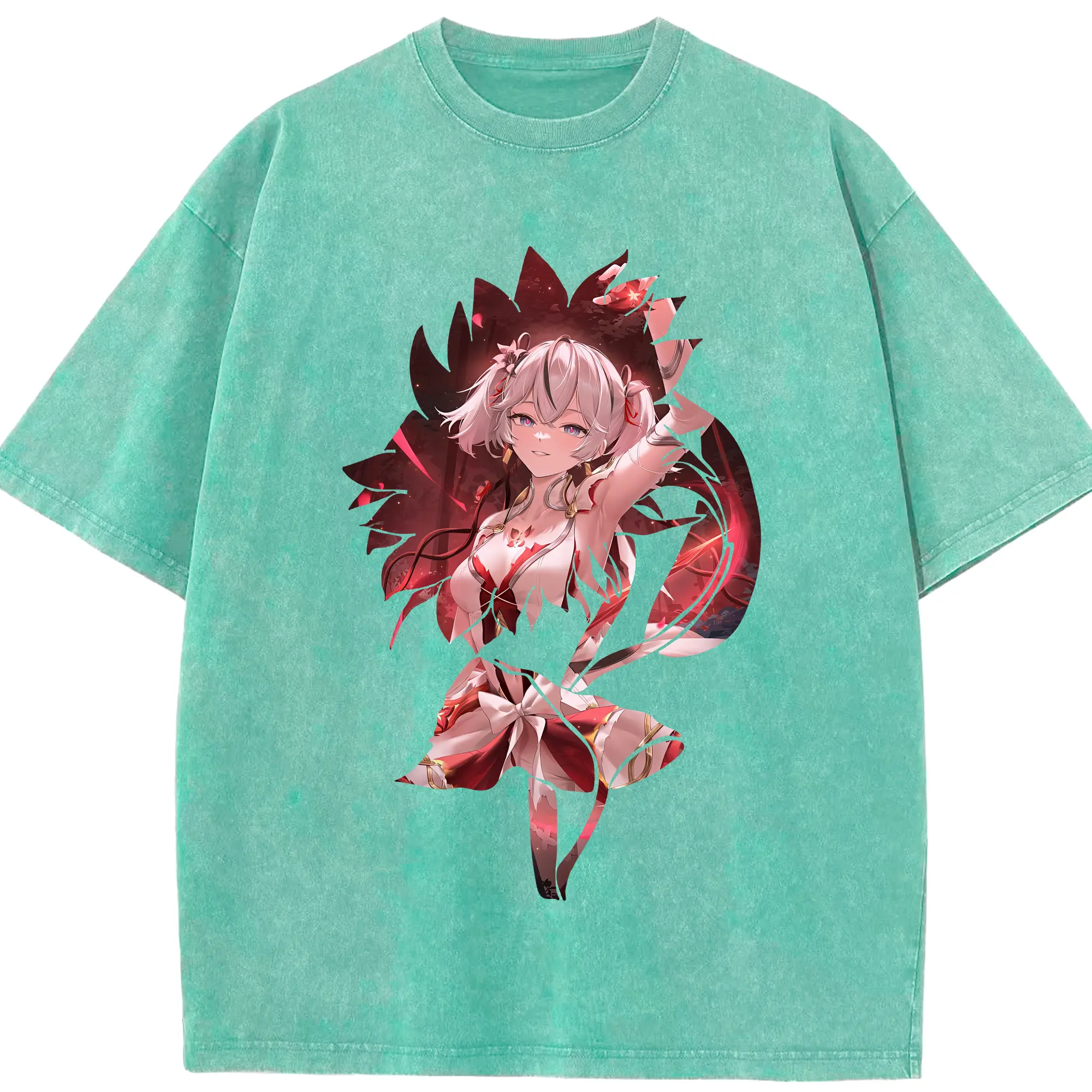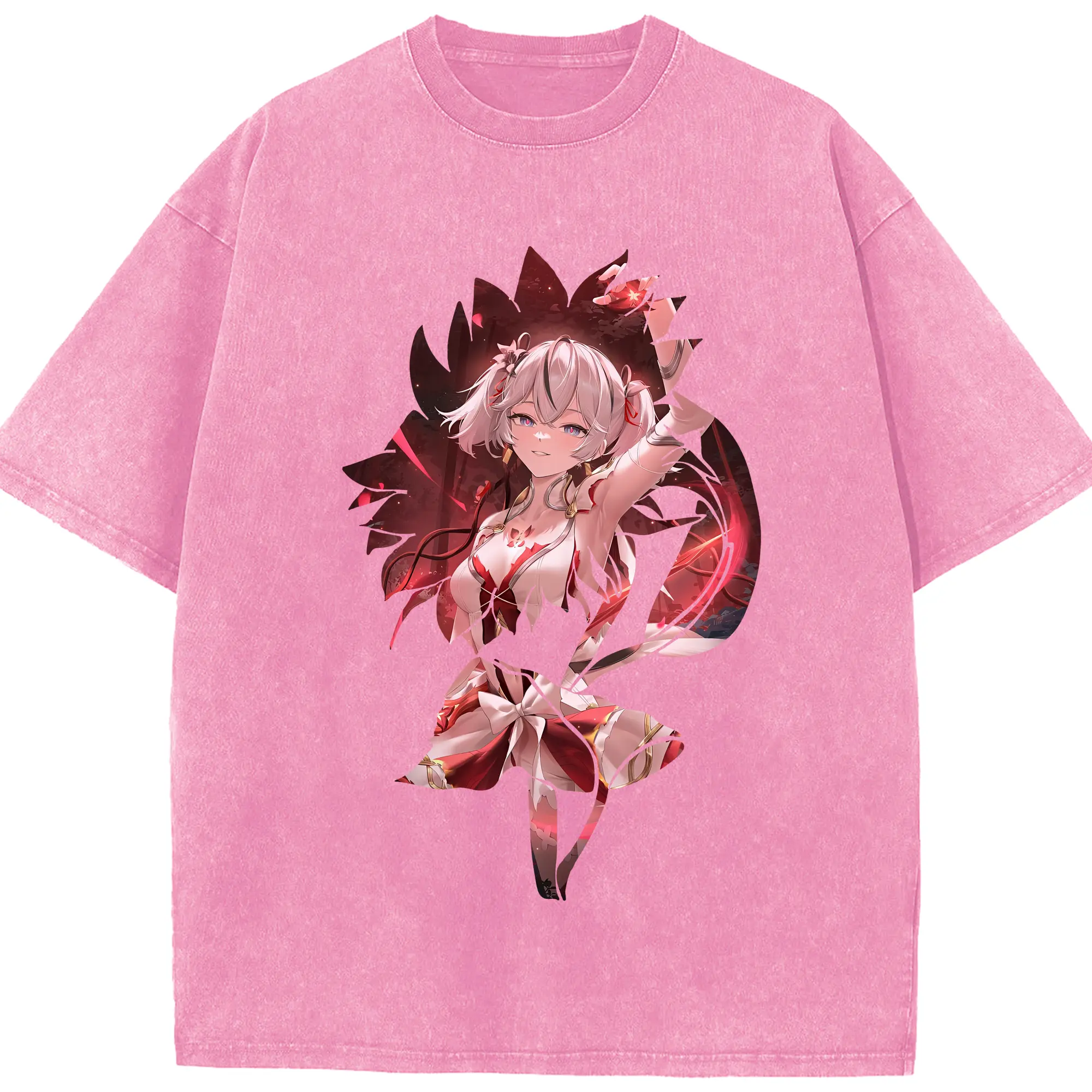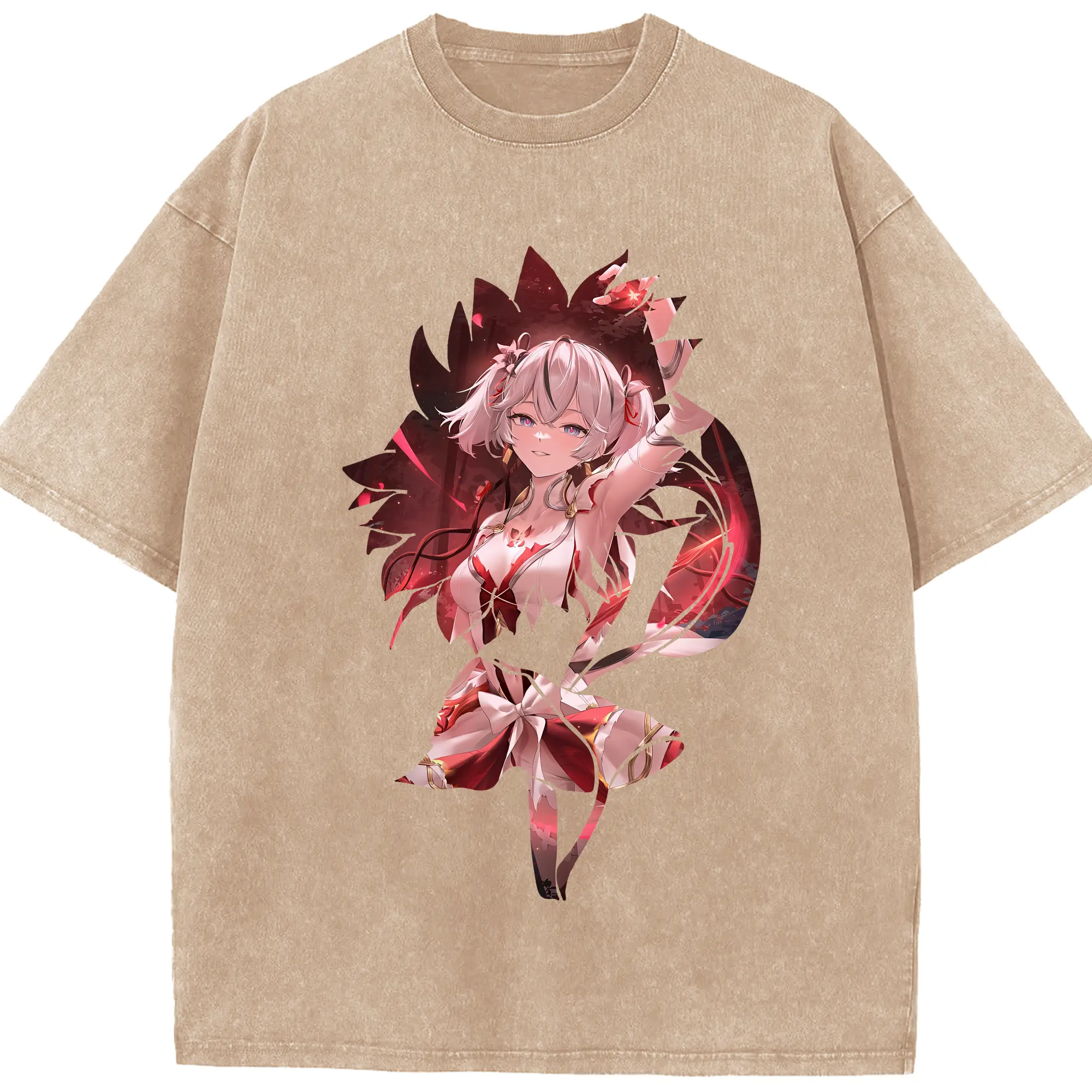 鳴潮 グッズ ツバキ - 綿100% ヴィンテージ風 半袖Tシャツ ・ 背面プリント ・ 柔らか肌触り ・ 通気性 快適 ・ スポーツ カジュアル 外出用