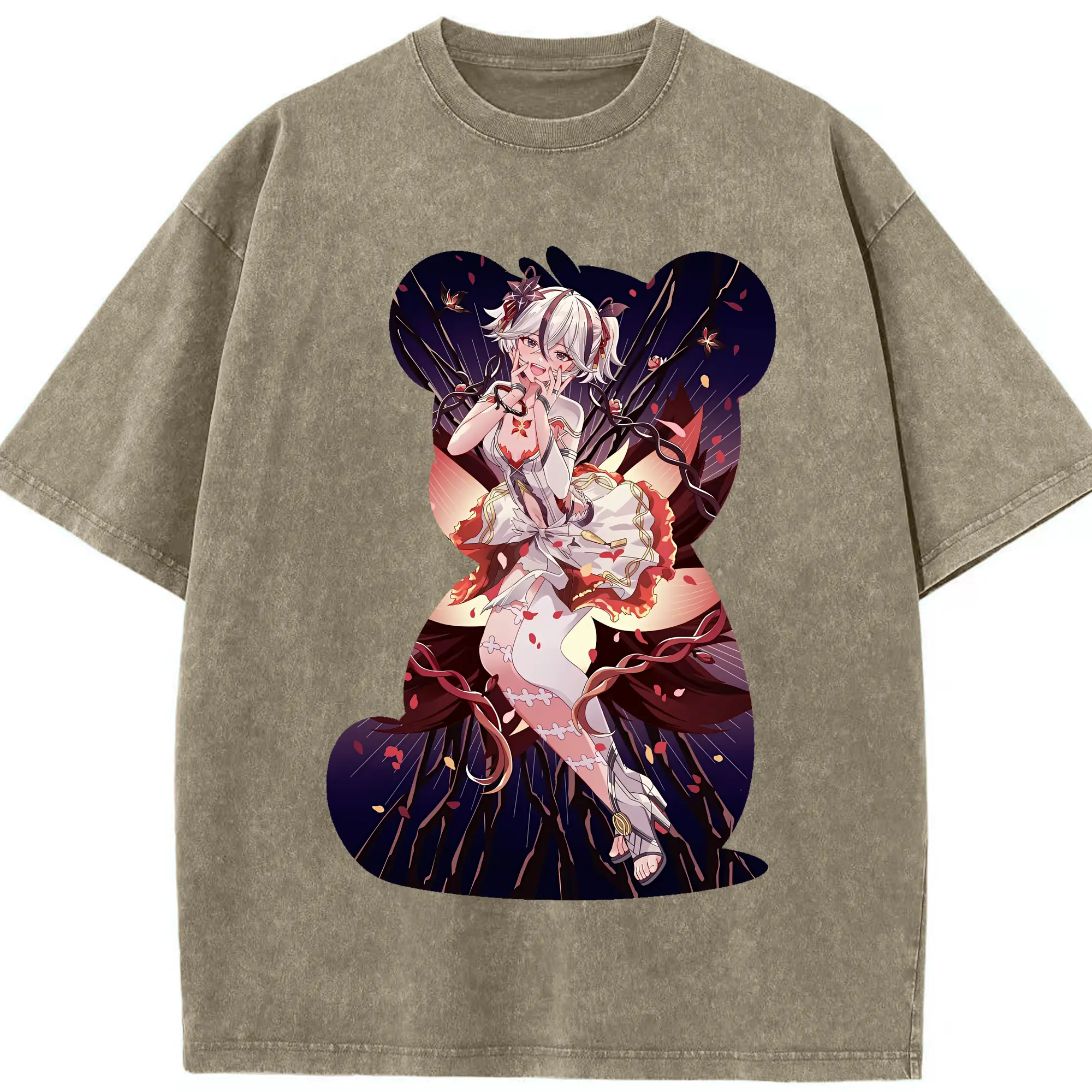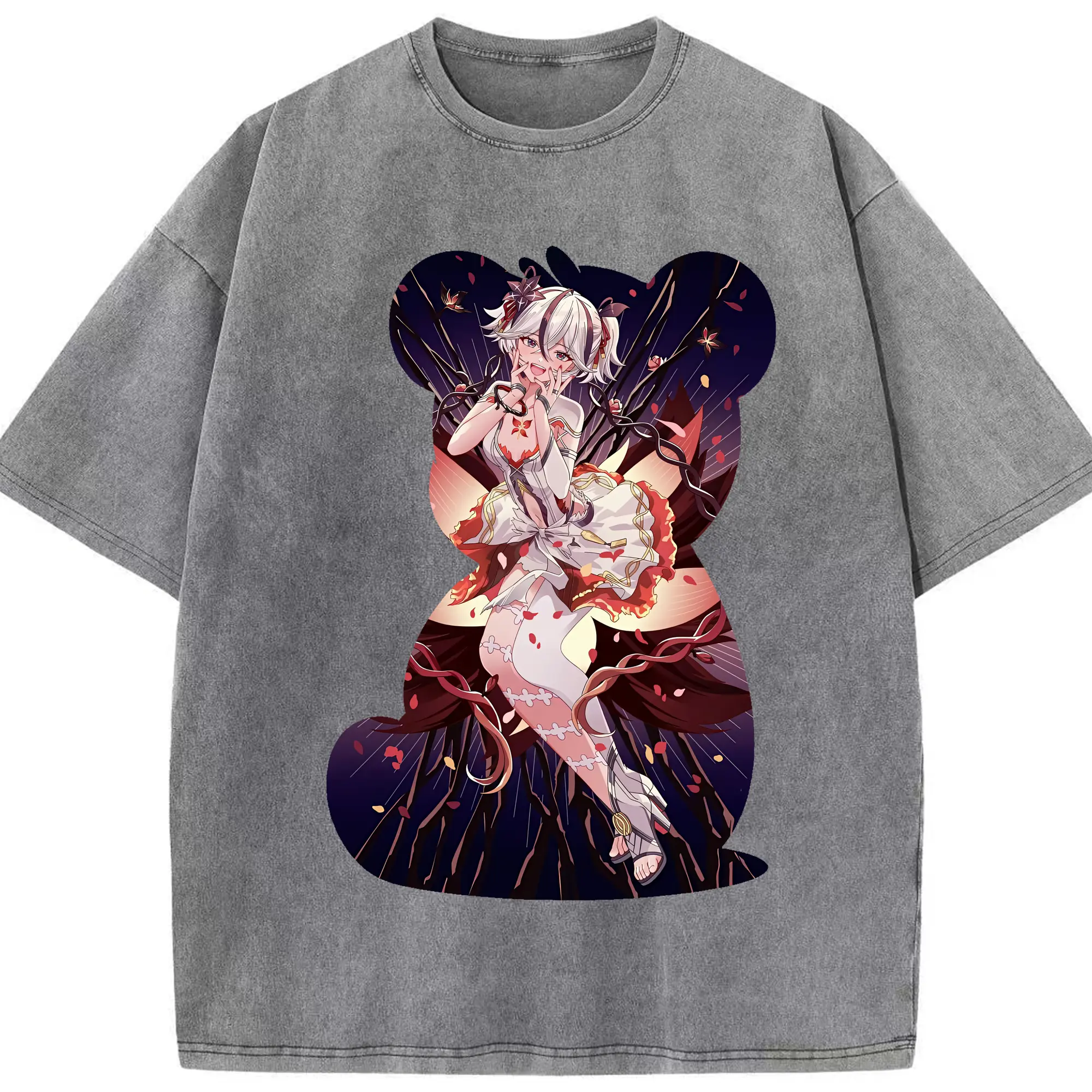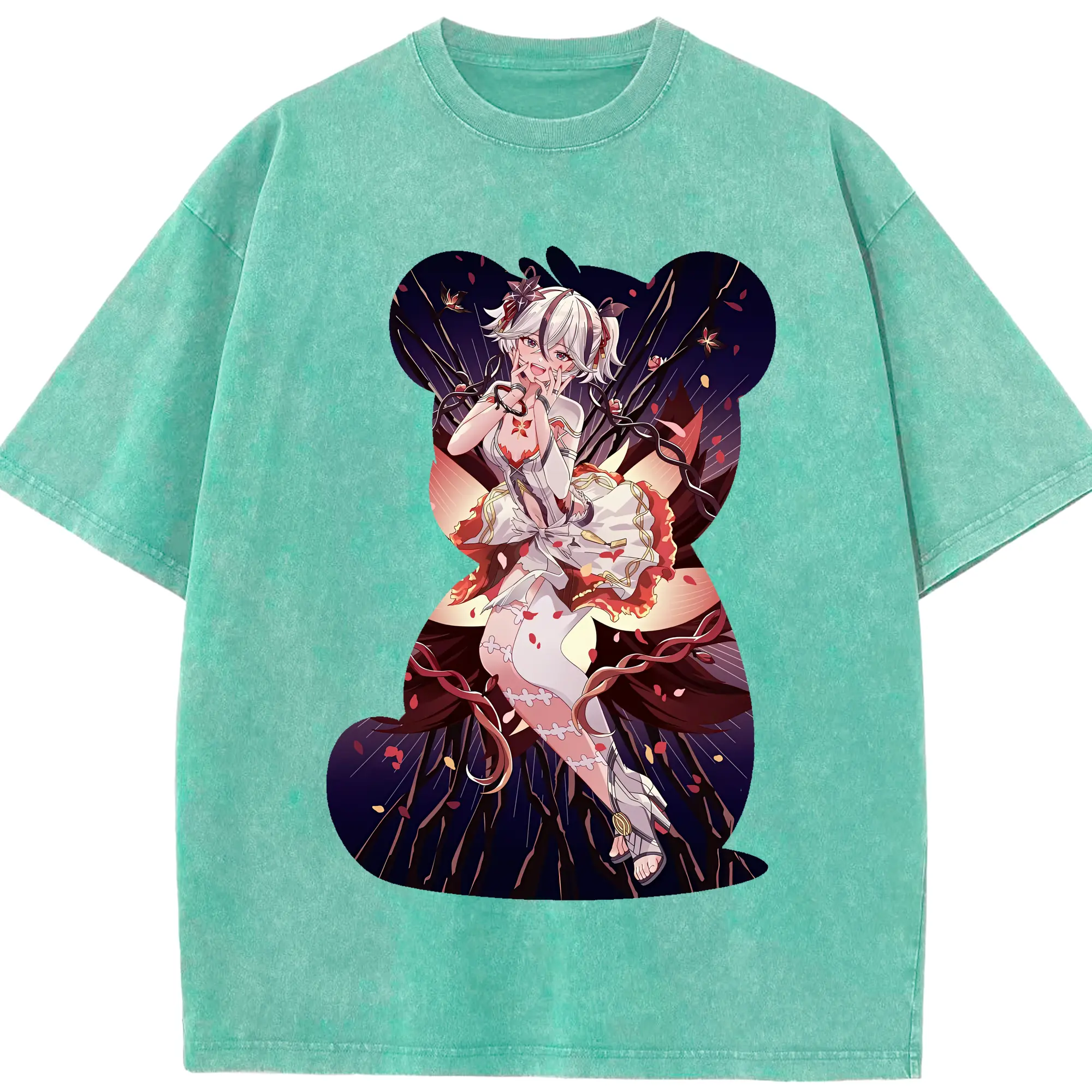 鳴潮 グッズ ツバキ - 綿100% ヴィンテージ風 半袖Tシャツ ・ 背面プリント ・ 柔らか肌触り ・ 通気性 快適 ・ スポーツ カジュアル 外出用