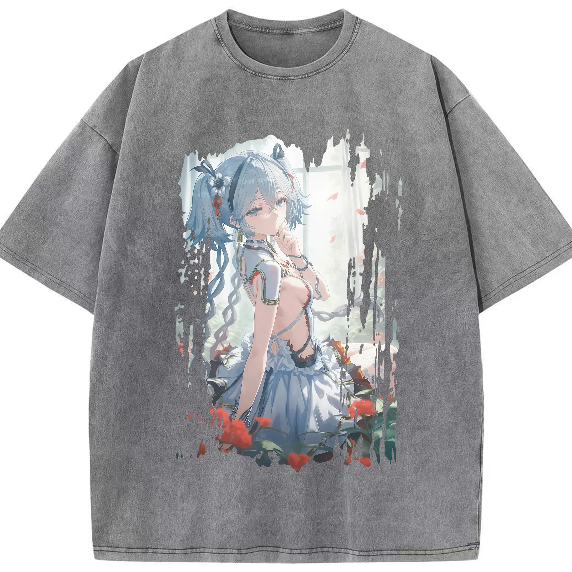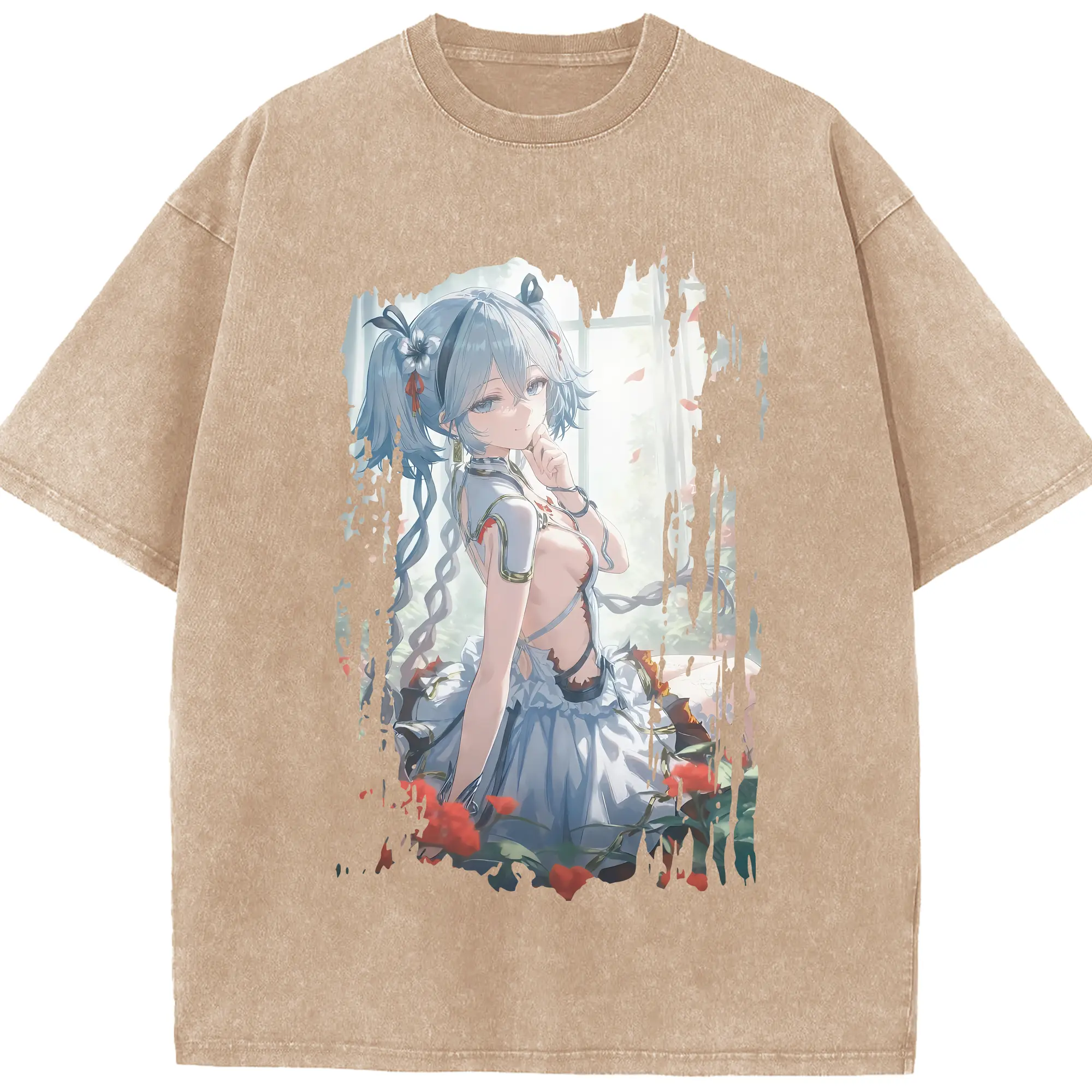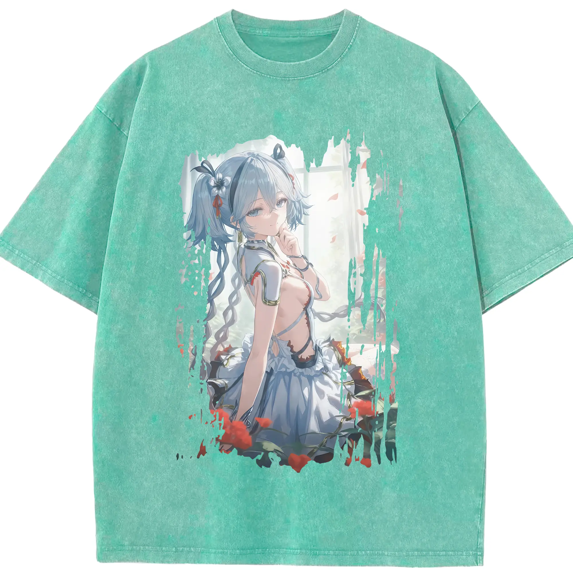 鳴潮 グッズ ツバキ - 綿100% ヴィンテージ風 半袖Tシャツ ・ 背面プリント ・ 柔らか肌触り ・ 通気性 快適 ・ スポーツ カジュアル 外出用