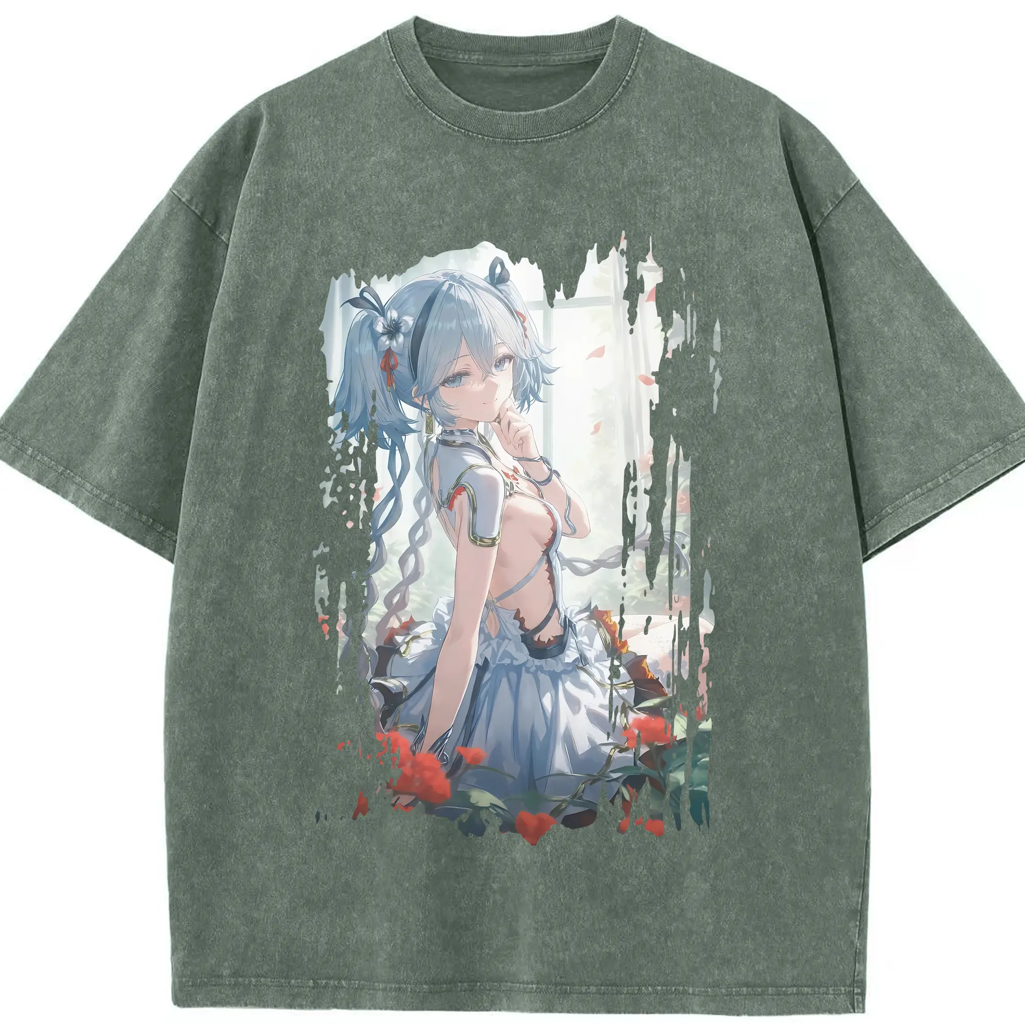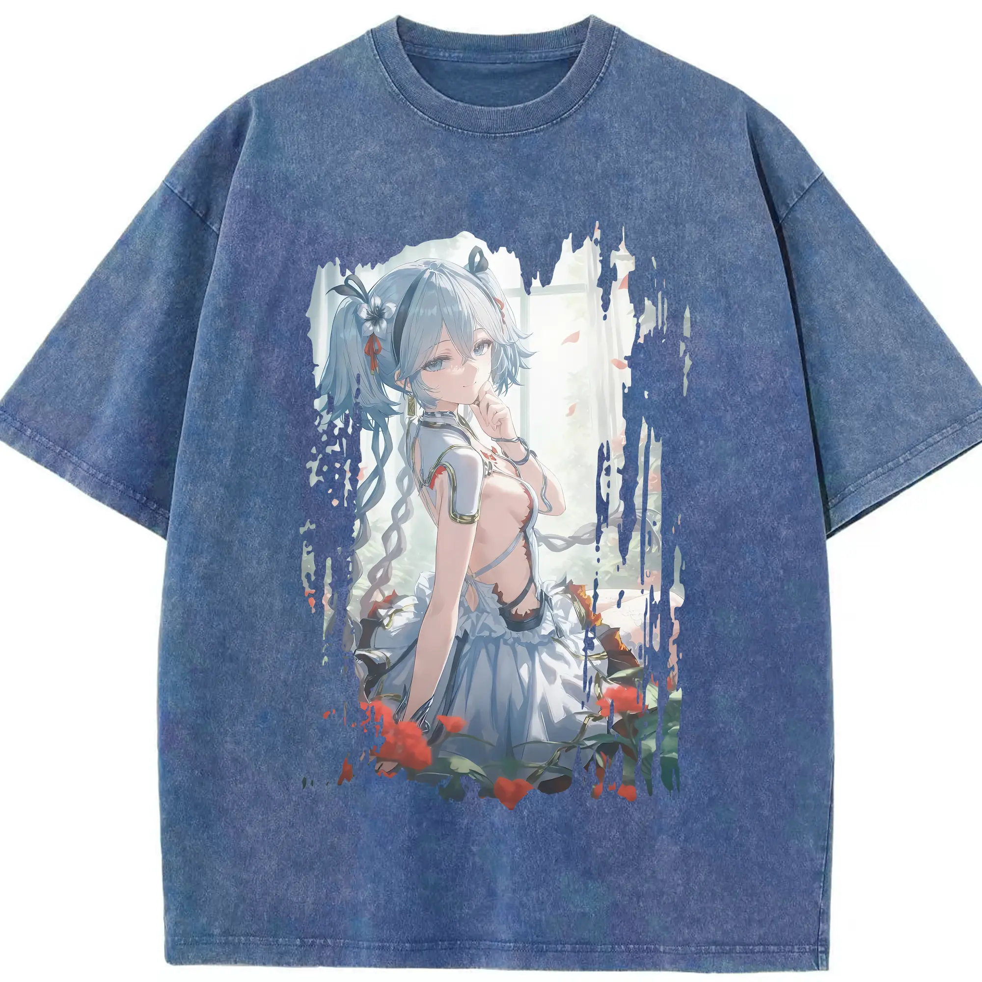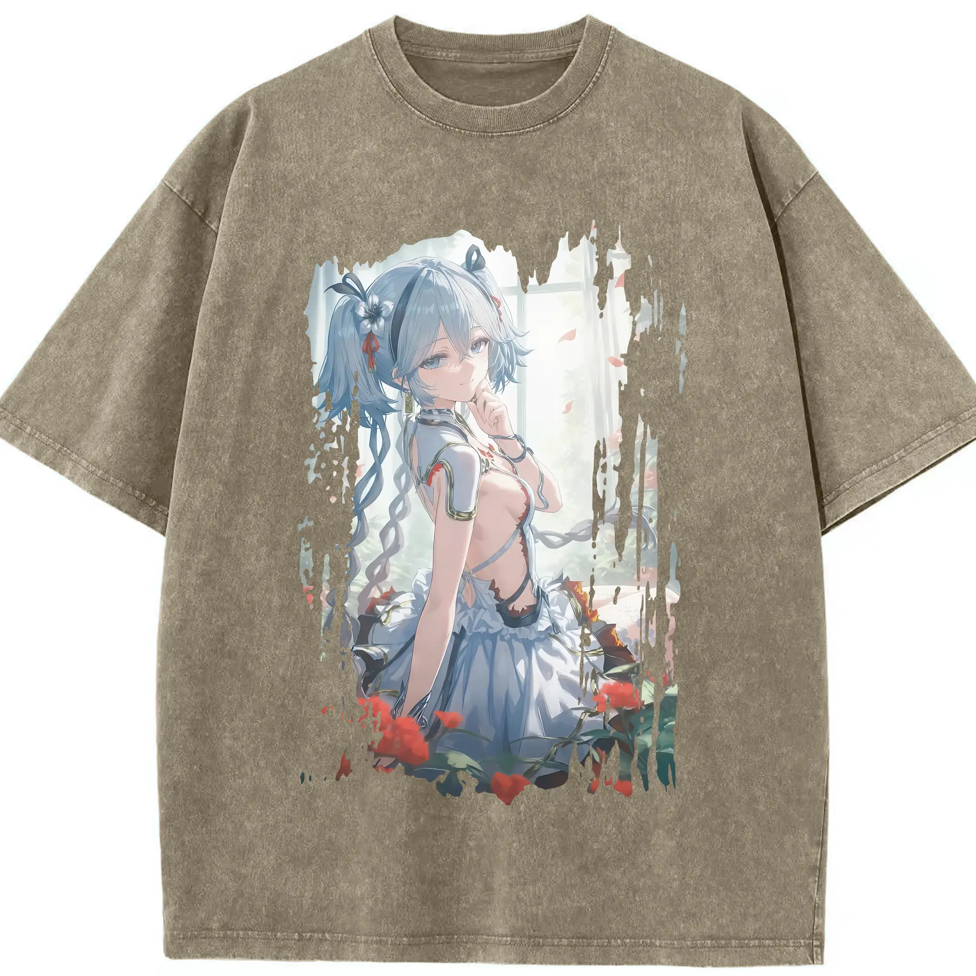 鳴潮 グッズ ツバキ - 綿100% ヴィンテージ風 半袖Tシャツ ・ 背面プリント ・ 柔らか肌触り ・ 通気性 快適 ・ スポーツ カジュアル 外出用